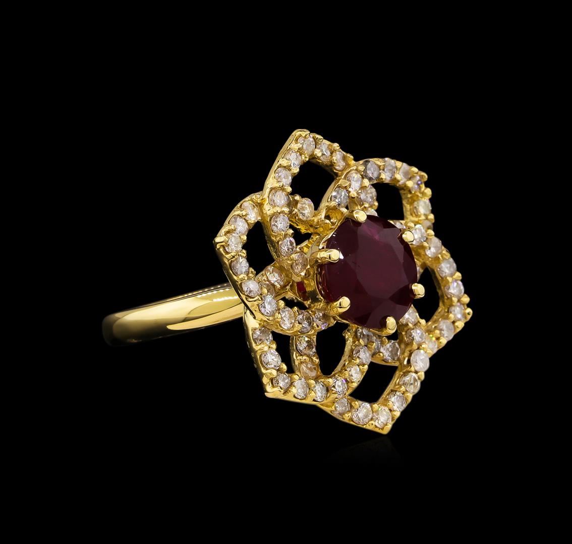 One electronically tested 14KT yellow gold ladies cast ruby and diamond ring with a bright polish finish. Condition is new, good workmanship. The featured ruby is set within a floral diamond bezel, completed by a two millimeter wide band. Identified with markings of "K14". Containing: One prong set round mixed cut natural ruby, measuring 8.40 - 8.40 x 5.20 mm, 6%. bulge factor, approximate weight of 3.11ct., clarity is heavily included, type II, medium dark, very slightly brownish, slightly purplish red color, (GIA slpR 6/3), cut is good. Transmitting light somewhat diffusely, transparent to translucent. Naturally occurring internal & external characteristics are present. Indications of laboratory high temperature heat treatment, with glass & flux additives. Graded in the setting. Ruby has a low tolerance to rhodium plating, repolishing the surface, & ultrasonic cleaning. Sixty-Six prong set round brilliant cut diamonds, measuring 1.60 - 1.60 x 0.96mm (depth est.) approximate. Total Weight of 66 Stones = 1.08ct. Graded in the setting. Clarity: SI-2 to I-2 . Color: G - I. Total Weight of Colored Stones 3.11ct.. Total Weight of Diamonds 1.08ct.. Total Weight of Ring 8.30gm. AIG Appraised at $5,150.00.