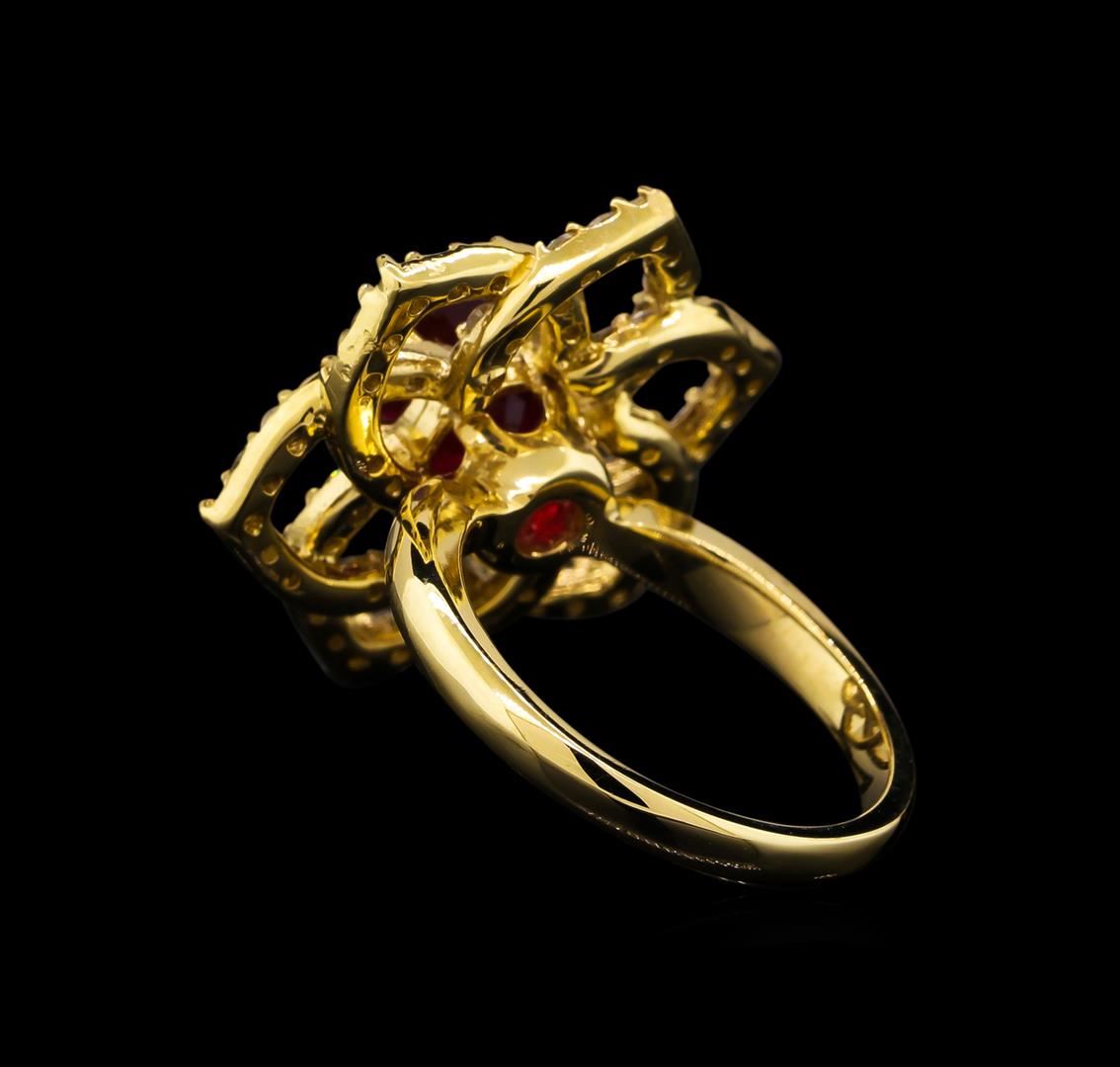 One electronically tested 14KT yellow gold ladies cast ruby and diamond ring with a bright polish finish. Condition is new, good workmanship. The featured ruby is set within a floral diamond bezel, completed by a two millimeter wide band. Identified with markings of "K14". Containing: One prong set round mixed cut natural ruby, measuring 8.40 - 8.40 x 5.20 mm, 6%. bulge factor, approximate weight of 3.11ct., clarity is heavily included, type II, medium dark, very slightly brownish, slightly purplish red color, (GIA slpR 6/3), cut is good. Transmitting light somewhat diffusely, transparent to translucent. Naturally occurring internal & external characteristics are present. Indications of laboratory high temperature heat treatment, with glass & flux additives. Graded in the setting. Ruby has a low tolerance to rhodium plating, repolishing the surface, & ultrasonic cleaning. Sixty-Six prong set round brilliant cut diamonds, measuring 1.60 - 1.60 x 0.96mm (depth est.) approximate. Total Weight of 66 Stones = 1.08ct. Graded in the setting. Clarity: SI-2 to I-2 . Color: G - I. Total Weight of Colored Stones 3.11ct.. Total Weight of Diamonds 1.08ct.. Total Weight of Ring 8.30gm. AIG Appraised at $5,150.00.