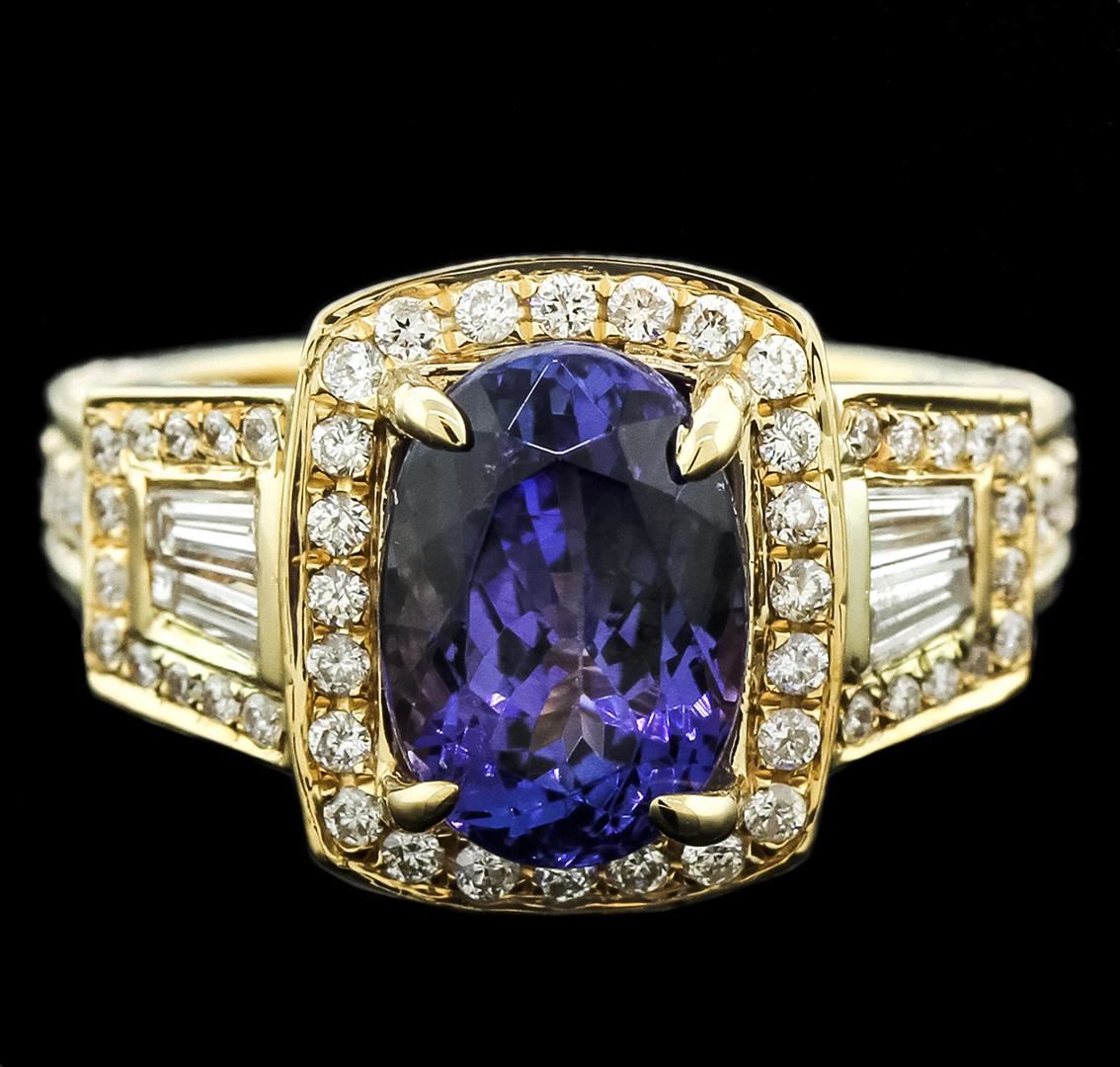One electronically tested 14KT yellow gold ladies cast tanzanite and diamond ring with a bright polish finish. Identified with markings of "14K". Condition is new. Containing: One prong set rectangular cushion modified brilliant cut natural tanzanite, measuring 10.80 x 7.50 x 4.88mm, approximate weight of 3.11ct., clarity is eye clean, type I, medium, very slightly grayish, bluish violet color, (GIA bV 5/3), cut is good. One Hundred Two prong set round brilliant cut diamonds, measuring 2.00 - 1.30 x 0.99mm (depth est.) approximate total weight of 102 Stones = 1.20 ct. . Clarity: SI-2 to I-1. Color: I - J, Cut is Good. Four channel set baguette cut diamonds, measuring 3.50 x 1.50 x 1.28mm (depth est.) approximate total weight of 4 Stones = 0.25ct. . Clarity: SI-1 to SI-2. Color: I - J. Colored gemstones are presumed to have been subjected to commonly used enhancement processes. All diamonds and colored gemstones are graded in the mounting, unless otherwise stated.. Total Weight of Colored Stones 3.11ct.. Total Weight of Diamonds 1.45ct.. Total Weight of Ring 7.10 grams. GGL Appraised.
