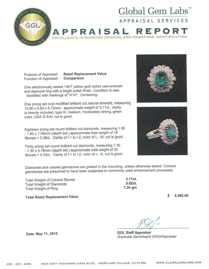 One electronically tested 14KT yellow gold ladies cast emerald and diamond ring with a bright polish finish. Identified with markings of "K14". Condition is new. Containing: One prong set oval modified brilliant cut natural emerald, measuring 10.80 x 8.80 x 5.72mm, approximate weight of 3.11ct., clarity is heavily included, type III, medium, moderately strong, green color, (GIA G 5/4), cut is good. Eighteen prong set round brilliant cut diamonds, measuring 1.80 - 1.80 x 1.08mm (depth est.) approximate total weight of 18 Stones = 0.38ct. Clarity: I-1 to I-2. Color: L - M, Cut is Good. Thirty prong set round brilliant cut diamonds, measuring 1.30 - 1.30 x 0.78mm (depth est.) approximate total weight of 30 Stones = 0.24ct. Clarity: I-1 to I-2. Color: J - K, Cut is Good. Diamonds and colored gemstones are graded in the mounting, unless otherwise stated. Colored gemstones are presumed to have been subjected to commonly used enhancement processes. Total Weight of Colored Stones 3.11ct. Total Weight of Diamonds 0.62ct. Total Weight of Ring 7.30 grams. GGL Appraised at $4,460.00.