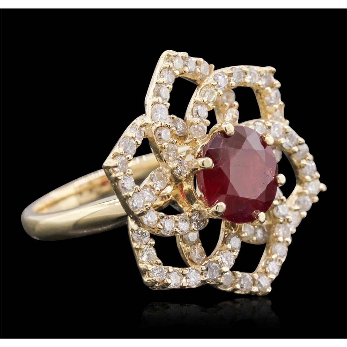 One electronically tested 14KT yellow gold ladies cast ruby and diamond ring with a bright polish finish. Condition is new, good workmanship. The featured ruby is set within a floral diamond bezel, completed by a two millimeter wide band. Identified with markings of "K14". Containing: One prong set round mixed cut natural ruby, measuring 8.40 - 8.40 x 5.20 mm, 6%. bulge factor, approximate weight of 3.11ct., clarity is heavily included, type II, medium dark, very slightly brownish, slightly purplish red color, (GIA slpR 6/3), cut is good. Transmitting light somewhat diffusely, transparent to translucent. Naturally occurring internal & external characteristics are present. Indications of laboratory high temperature heat treatment, with glass & flux additives. Graded in the setting. Ruby has a low tolerance to rhodium plating, repolishing the surface, & ultrasonic cleaning. Sixty-Six prong set round brilliant cut diamonds, measuring 1.60 - 1.60 x 0.96mm (depth est.) approximate. Total Weight of 66 Stones = 1.08ct. Graded in the setting. Clarity: SI-2 to I-2 . Color: G - I. Total Weight of Colored Stones 3.11ct.. Total Weight of Diamonds 1.08ct.. Total Weight of Ring 8.30gm. AIG Appraised at $5,150.00.