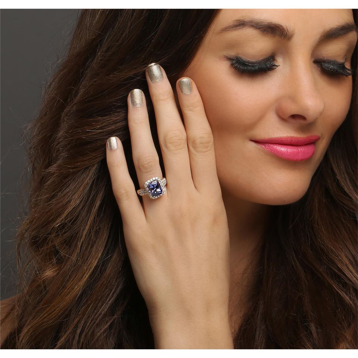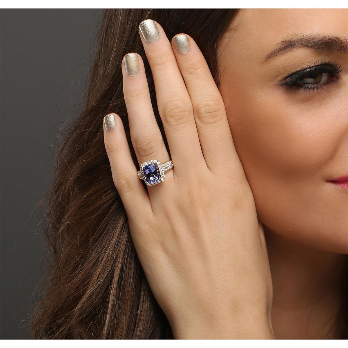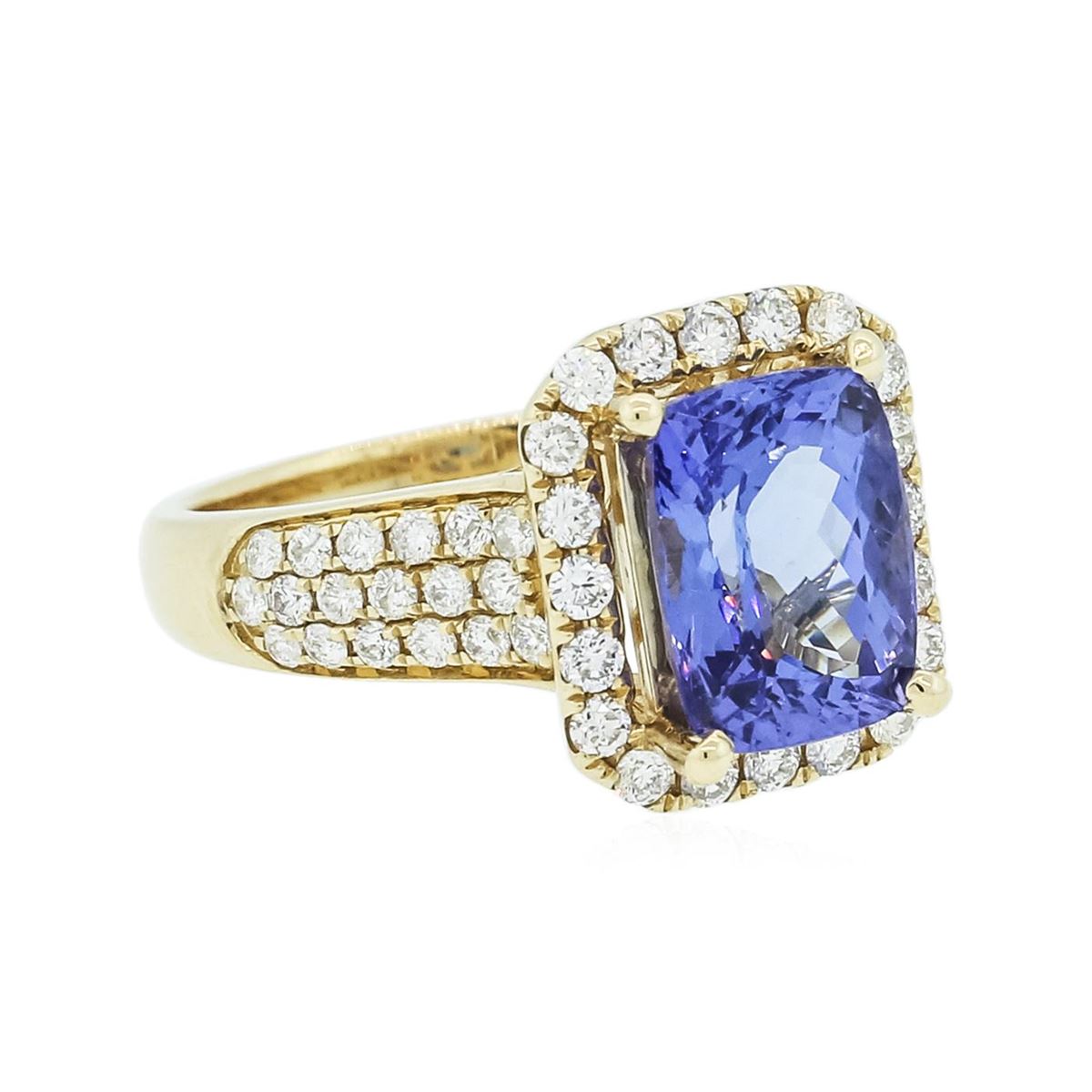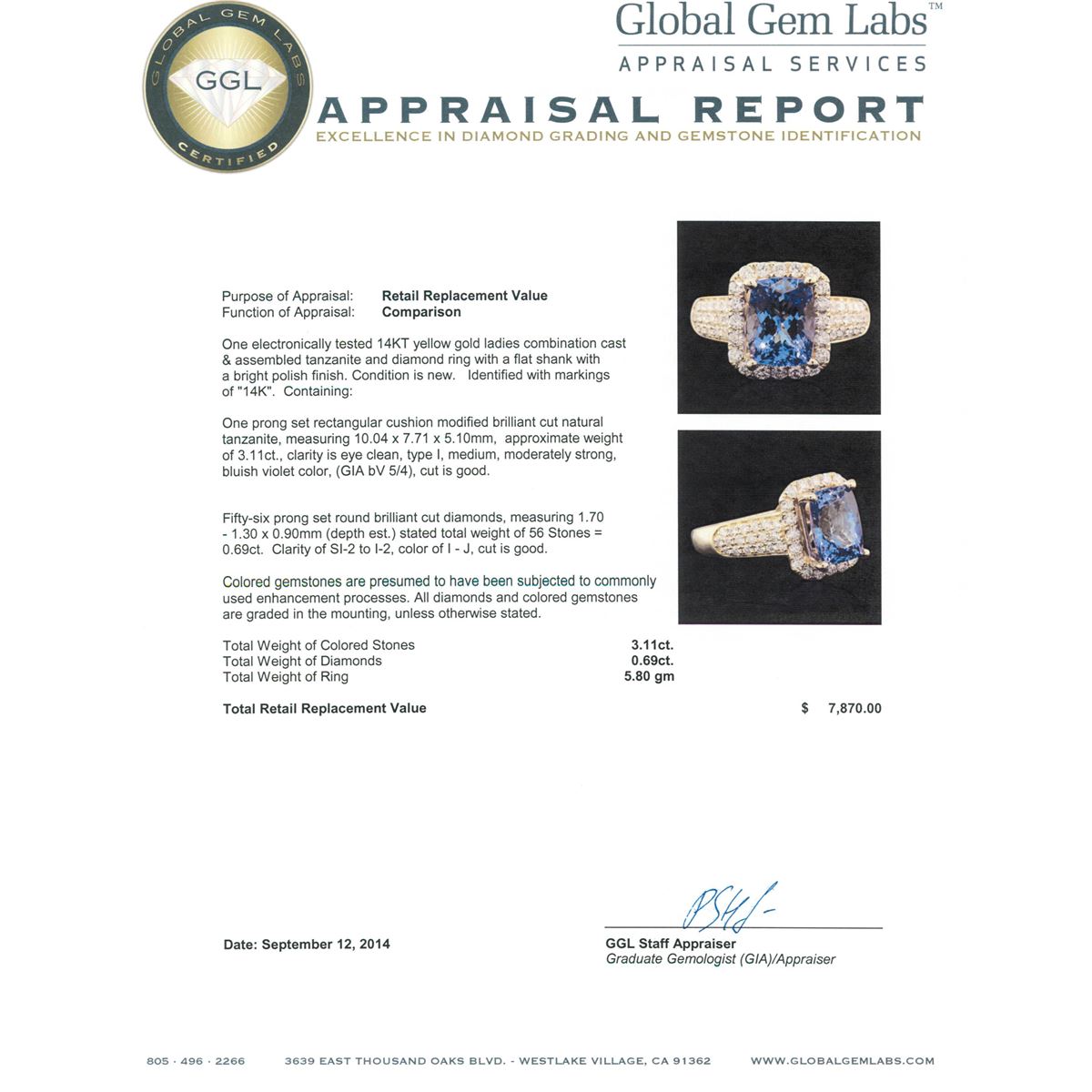 One electronically tested 14KT yellow gold ladies combination cast & assembled tanzanite and diamond ring with a flat shank with a bright polish finish. Identified with markings of "14K". Condition is new. Containing: One prong set rectangular cushion modified brilliant cut natural tanzanite, measuring 10.04 x 7.71 x 5.10mm, approximate weight of 3.11ct., clarity is eye clean, type I, medium, moderately strong, bluish violet color, (GIA bV 5/4), cut is good. Fifty-Six prong set round brilliant cut diamonds, measuring 1.70 - 1.30 x 0.90mm (depth est.) stated total weight of 56 Stones = 0.69ct. Clarity: SI-2 to I-2. Color: I - J, Cut is Good. Colored gemstones are presumed to have been subjected to commonly used enhancement processes. All diamonds and colored gemstones are graded in the mounting, unless otherwise stated total weight of Colored Stones 3.11ct. Total Weight of Diamonds 0.69ct. Total Weight of Ring 5.80 grams. GGL Appraised at $7,870.00.