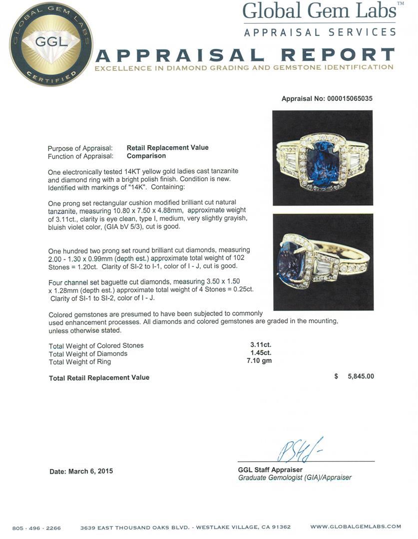 One electronically tested 14KT yellow gold ladies cast tanzanite and diamond ring with a bright polish finish. Identified with markings of "14K". Condition is new. Containing: One prong set rectangular cushion modified brilliant cut natural tanzanite, measuring 10.80 x 7.50 x 4.88mm, approximate weight of 3.11ct., clarity is eye clean, type I, medium, very slightly grayish, bluish violet color, (GIA bV 5/3), cut is good. One Hundred Two prong set round brilliant cut diamonds, measuring 2.00 - 1.30 x 0.99mm (depth est.) approximate total weight of 102 Stones = 1.20ct. . Clarity: SI-2 to I-1. Color: I - J, Cut is Good. Four channel set baguette cut diamonds, measuring 3.50 x 1.50 x 1.28mm (depth est.) approximate total weight of 4 Stones = 0.25ct. . Clarity: SI-1 to SI-2. Color: I - J. Colored gemstones are presumed to have been subjected to commonly used enhancement processes. All diamonds and colored gemstones are graded in the mounting, unless otherwise stated.. Total Weight of Colored Stones 3.11ct.. Total Weight of Diamonds 1.45ct.. Total Weight of Ring 7.10 grams. GGL Appraised at $5,845.00.