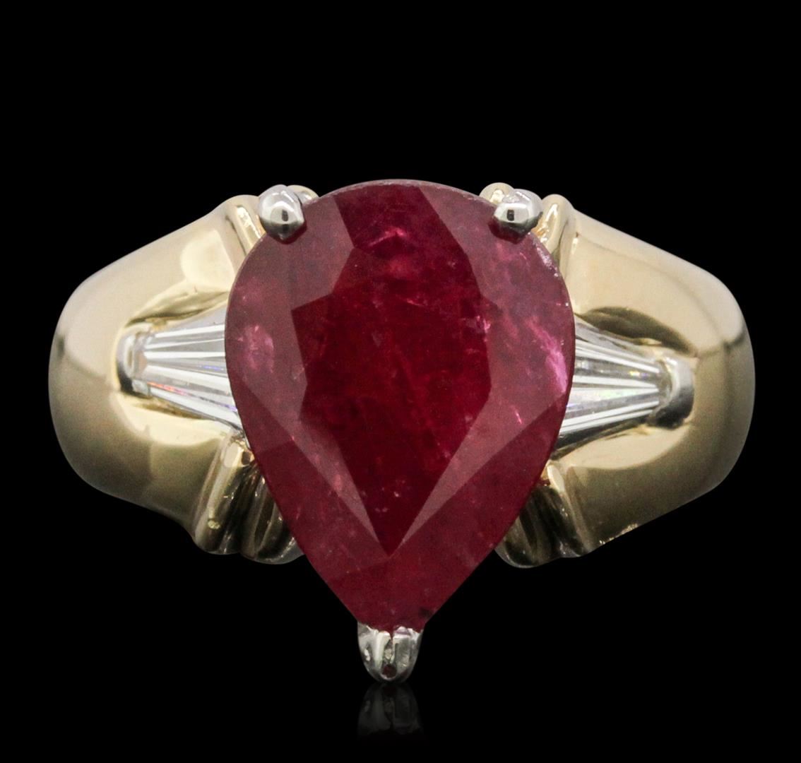 One ring featuring: 14KT yellow gold weighing 7.90 grams containing one ruby center stone with a total weight of 3.12ct and diamonds with a total weight of 0.25ct.