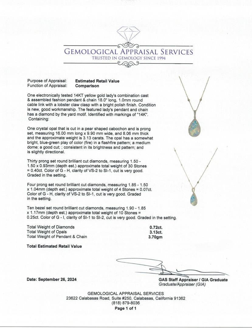 One electronically tested 14KT yellow gold lady's combination cast & assembled fashion pendant & chain 18.0" long, 1.0mm round cable link with a lobster claw clasp with a bright polish finish. The featured lady's pendant and chain has a diamond by the yard motif. Identified with markings of "14K". Condition is new, good workmanship. Containing: One crystal opal that is cut in a pear shaped cabochon and is prong set, measuring 16.00 mm long x 9.90 mm wide, and 8.06 mm thick and the approximate weight is 3.13 carats. The opal has a somewhat bright, blue-green play of color (fire) in a flashfire pattern; a medium dome; a good cut; ; consistent in its brightness and pattern; and is slightly directional. Thirty prong set round brilliant cut diamonds, measuring 1.50 - 1.50 x 0.93mm (depth est.) approximate total weight of 30 Stones = 0.40ct. Graded in the setting. Color: G - H. Clarity: VS-2 to SI-1. Cut: Very Good.Four prong set round brilliant cut diamonds, measuring 1.85 - 1.50 x 1.04mm (depth est.) approximate total weight of 4 Stones = 0.07ct. Graded in the setting.Color: G - H.Clarity: VS-2 to SI-1. Cut: Very Good.Ten bezel set round brilliant cut diamonds, measuring 1.90 - 1.85 x 1.17mm (depth est.) approximate total weight of 10 Stones = 0.25ct. Graded in the setting. Color: G - I. Clarity: SI-1 to SI-2.Cut: Very Good. Total Weight of Diamonds: 0.72ct. Total Weight of Opals: 3.13ct.Total Weight of Pendant & Chain: 3.70gm. Appraised by Gemological Appraisal Services. GAS Appraised.