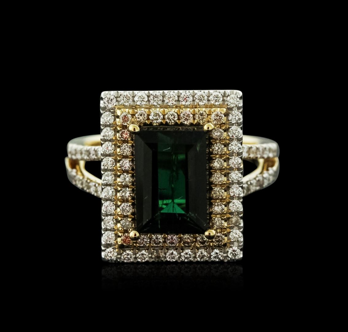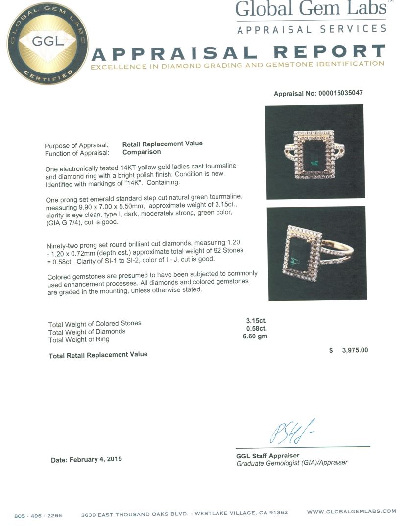 One electronically tested 14KT yellow gold ladies cast tourmaline and diamond ring with a bright polish finish. Identified with markings of "14K". Condition is new. Containing: One prong set emerald standard step cut natural green tourmaline, measuring 9.90 x 7.00 x 5.50mm, approximate weight of 3.15ct., clarity is eye clean, type I, dark, moderately strong, green color, (GIA G 7/4), cut is good. Ninety-Two prong set round brilliant cut diamonds, measuring 1.20 - 1.20 x 0.72mm (depth est.) approximate total weight of 92 Stones = 0.58ct. Clarity: SI-1 to SI-2. Color: I - J, Cut is Good. Colored gemstones are presumed to have been subjected to commonly used enhancement processes. All diamonds and colored gemstones are graded in the mounting, unless otherwise stated. Total Weight of Colored Stones 3.15ct. Total Weight of Diamonds 0.58ct. Total Weight of Ring 6.60 grams. GGL Appraised at $3,975.00.
