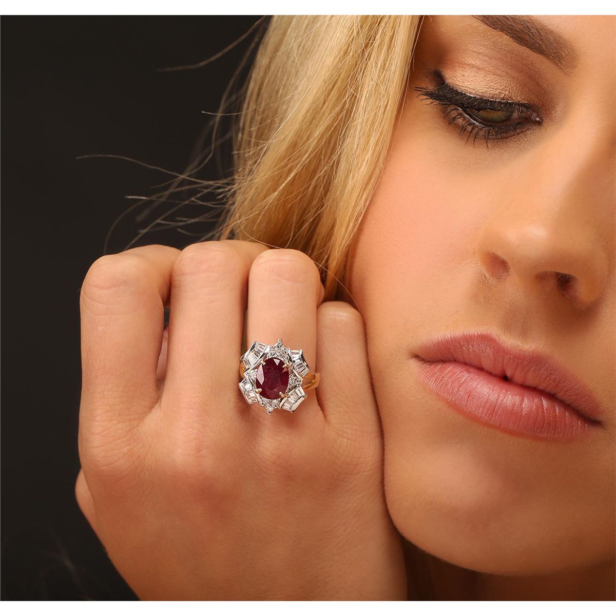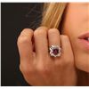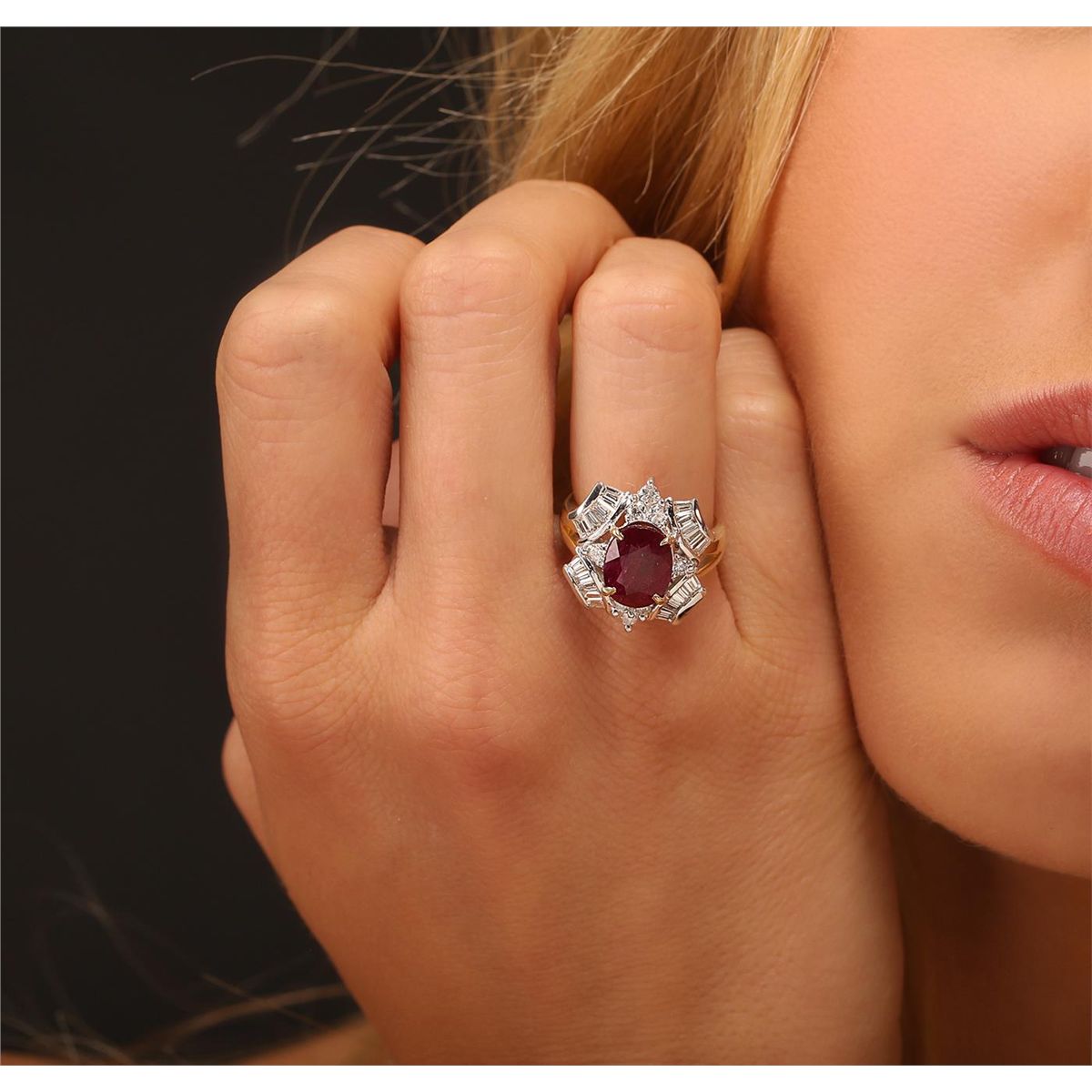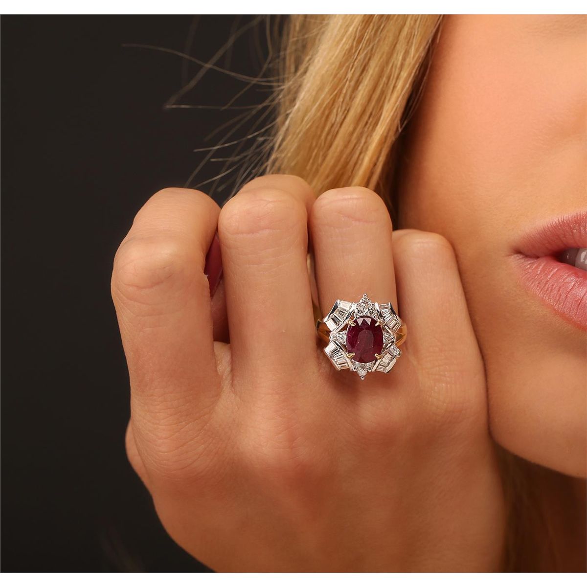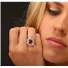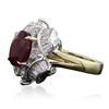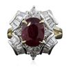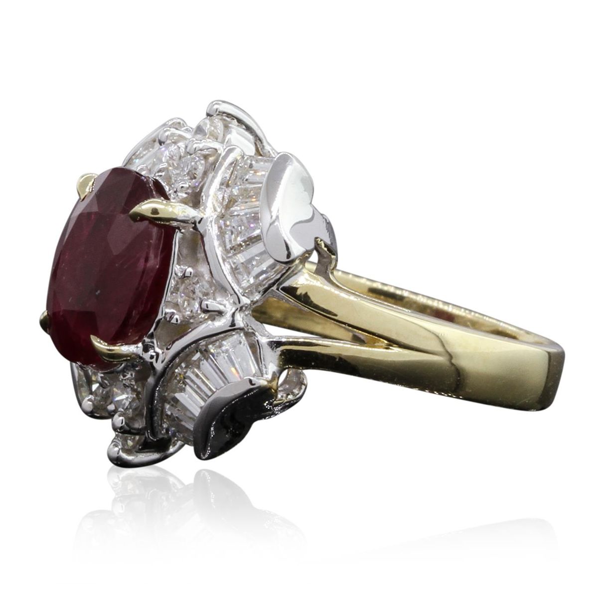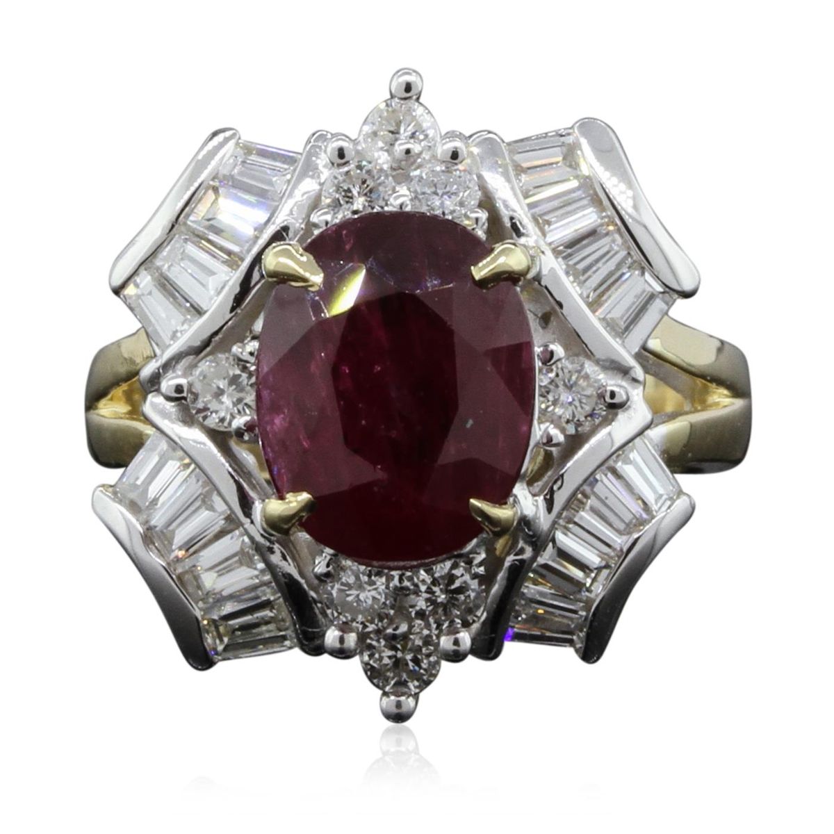 One electronically tested 14KT yellow with rhodium plating gold Ladies combination cast & assembled cocktail ring with a bright polish finish. Identified with markings of "14K". Condition is new. Containing: One prong set oval modified brilliant cut natural ruby, measuring 9.60 x 7.70 x 5.00mm, approximate weight of 3.15ct., clarity is heavily included, type II, dark, moderately strong, strongly purplish red color, (GIA stpR 7/4), cut is good. Indications of heat treatment with glass and flux residue. Colored gemstones are presumed to have been subjected to commonly used and possible undetectable color/clarity enhancement processes. Eight prong set round brilliant cut diamonds, measuring 2.50 - 2.50 x 1.50mm (depth est.) approximate total weight of 8 Stones = 0.46ct. Clarity of SI-1 to SI-2, Color of I - J, Cut is Very Good. Sixteen channel set baguette cut diamonds, measuring 3.00 x 2.00 x 1.70mm (depth est.) approximate total weight of 16 Stones = 1.49ct. Clarity of VS-1 to VS-2, Color of I - J, Cut is Very Good. Total Weight of Colored Stones 3.15ct. Total Weight of Diamonds 1.95ct. Total Weight of Ring 7.70gm. GGL Appraised at $9,015.00.
