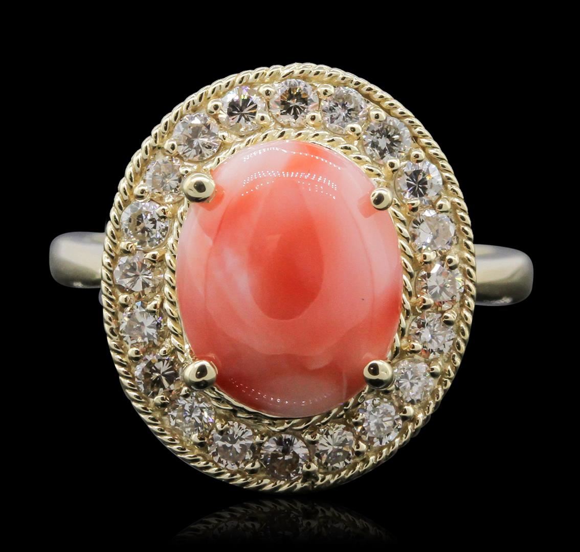 One electronically tested 14KT yellow gold ladies cast coral and diamond ring with a bright and milgrain finish. Condition is new, good workmanship. The featured coral is set within a diamond lattice gallery, completed by a two millimeter wide band. Identified with markings of "K14". Containing: One prong set oval cabochon cut natural salmon coral, measuring 10.90 x 9.00 x 4.50mm, approximate weight of 3.16ct., clarity is severely included, medium light, moderately strong, reddish orange color, (GIA rO 4/4), cut is good. Transmitting light very diffusely, opaque. Naturally occurring internal & external characteristics are present. Graded in the setting. Coral (Corallium Japonicum) is formed undersea by microscopic animals called coral polyps. These tiny, creatures form minute, hard shells. As a colony grows, it takes on complex branching, tree-like forms which allows the maximum number of polyps to be fed by the nutrients in the water. It grows about one quarter inch per year. This color of coral is commonly treated to improve or change the color and stability. Evidence that may confirm this is typically lacking. Twenty bead set round brilliant cut diamonds, measuring 2.00 - 1.90 x 1.17mm (depth est.) approximate. Total Weight of 20 Stones = 0.64ct. Graded in the setting. Clarity: SI-1 to I-1. Color: G - I. Total Weight of Colored Stones 3.16ct. Total Weight of Diamonds 0.64ct. Total Weight of Ring 5.80 grams. AIG Appraised at $3,865.00.