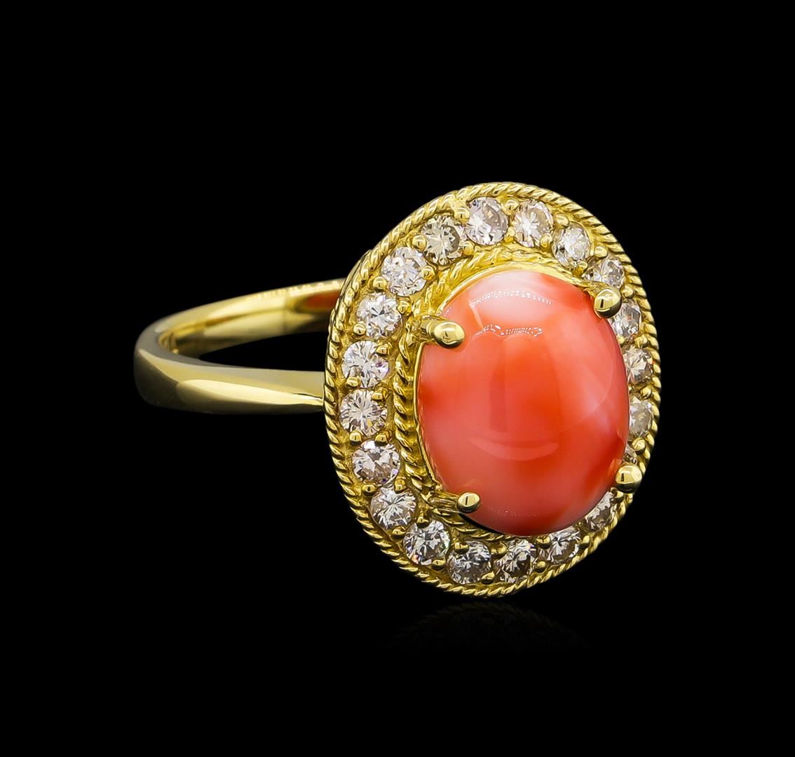 One electronically tested 14KT yellow gold ladies cast coral and diamond ring with a bright and milgrain finish. Condition is new, good workmanship. The featured coral is set within a diamond lattice gallery, completed by a two millimeter wide band. Identified with markings of "K14". Containing: One prong set oval cabochon cut natural salmon coral, measuring 10.90 x 9.00 x 4.50mm, approximate weight of 3.16ct., clarity is severely included, medium light, moderately strong, reddish orange color, (GIA rO 4/4), cut is good. Transmitting light very diffusely, opaque. Naturally occurring internal & external characteristics are present. Graded in the setting. Coral (Corallium Japonicum) is formed undersea by microscopic animals called coral polyps. These tiny, creatures form minute, hard shells. As a colony grows, it takes on complex branching, tree-like forms which allows the maximum number of polyps to be fed by the nutrients in the water. It grows about one quarter inch per year. This color of coral is commonly treated to improve or change the color and stability. Evidence that may confirm this is typically lacking. Twenty bead set round brilliant cut diamonds, measuring 2.00 - 1.90 x 1.17mm (depth est.) approximate. Total Weight of 20 Stones = 0.64ct. Graded in the setting. Clarity: SI-1 to I-1. Color: G - I. Total Weight of Colored Stones 3.16ct. Total Weight of Diamonds 0.64ct. Total Weight of Ring 5.80 grams. AIG Appraised at $3,865.00.