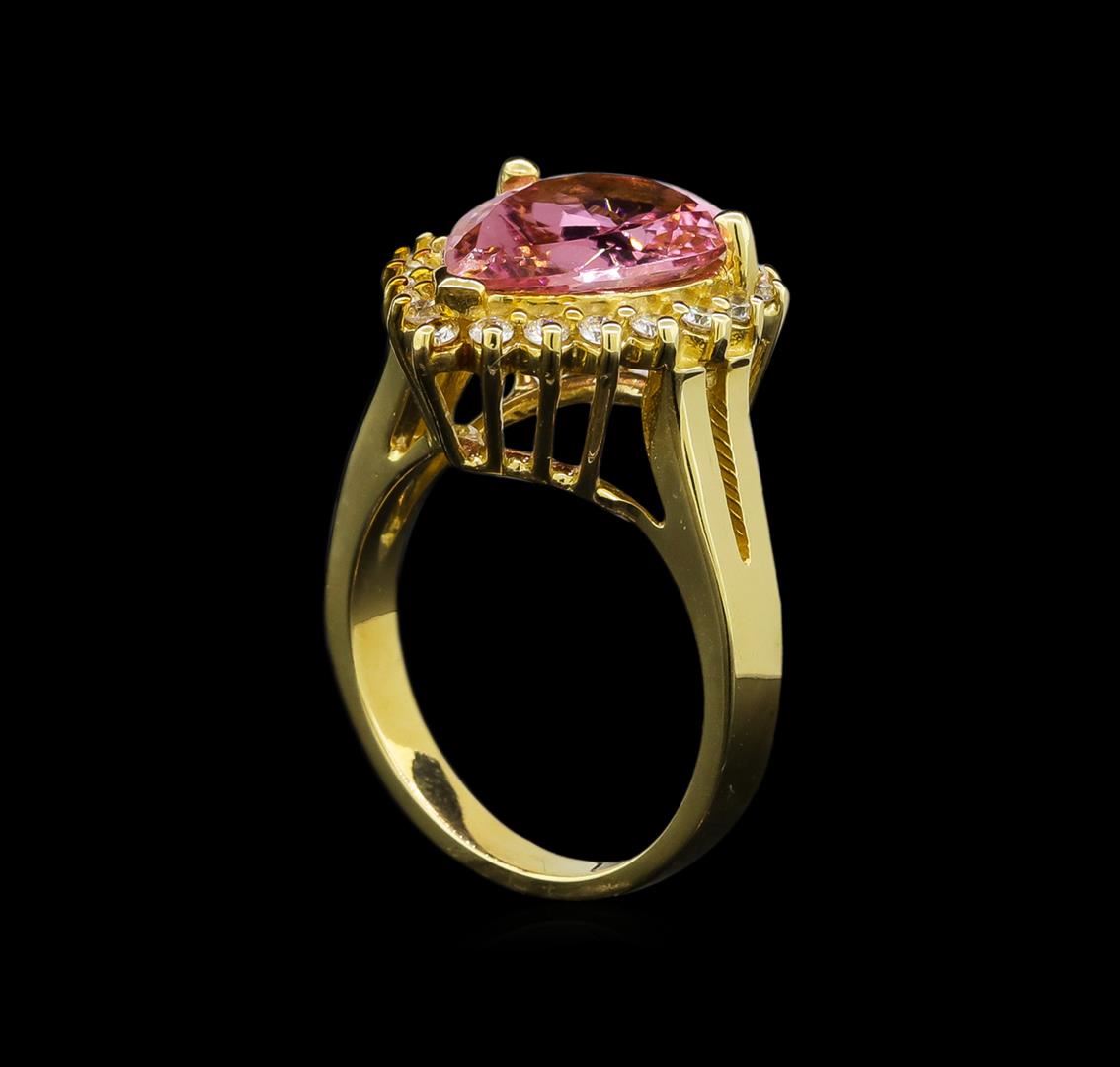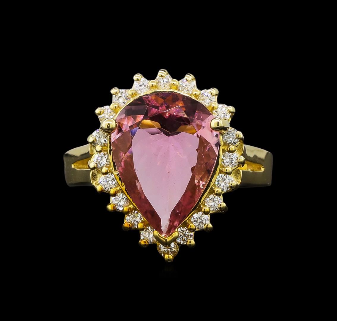 One electronically tested 14KT yellow gold ladies cast topaz and diamond ring with a bright polish finish. Identified with markings of "14K". Condition is new. Containing: One prong set pear modified brilliant cut natural pink topaz, measuring 13.80 x 9.90 x 6.44mm, approximate weight of 3.16ct., clarity is eye clean, type I, light, very slightly brownish, pink color, (GIA R 3/3), cut is good. Twenty prong set round brilliant cut diamonds, measuring 1.50 - 1.50 x 0.90mm (depth est.) approximate total weight of 20 Stones = 0.37ct. Clarity: SI-1. Color: J - K, Cut is Good. Colored gemstones are presumed to have been subjected to commonly used enhancement processes. All diamonds and colored gemstones are graded in the mounting, unless otherwise stated. Total Weight of Colored Stones 3.16ct. Total Weight of Diamonds 0.37ct. Total Weight of Ring 7.60 grams. GGL Appraised at $1,945.00.