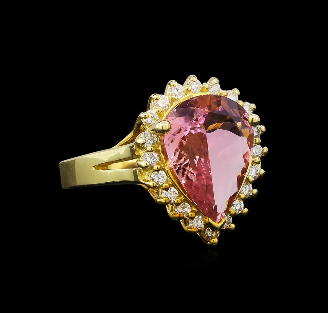 One electronically tested 14KT yellow gold ladies cast topaz and diamond ring with a bright polish finish. Identified with markings of "14K". Condition is new. Containing: One prong set pear modified brilliant cut natural pink topaz, measuring 13.80 x 9.90 x 6.44mm, approximate weight of 3.16ct., clarity is eye clean, type I, light, very slightly brownish, pink color, (GIA R 3/3), cut is good. Twenty prong set round brilliant cut diamonds, measuring 1.50 - 1.50 x 0.90mm (depth est.) approximate total weight of 20 Stones = 0.37ct. Clarity: SI-1. Color: J - K, Cut is Good. Colored gemstones are presumed to have been subjected to commonly used enhancement processes. All diamonds and colored gemstones are graded in the mounting, unless otherwise stated. Total Weight of Colored Stones 3.16ct. Total Weight of Diamonds 0.37ct. Total Weight of Ring 7.60 grams. GGL Appraised at $1,945.00.