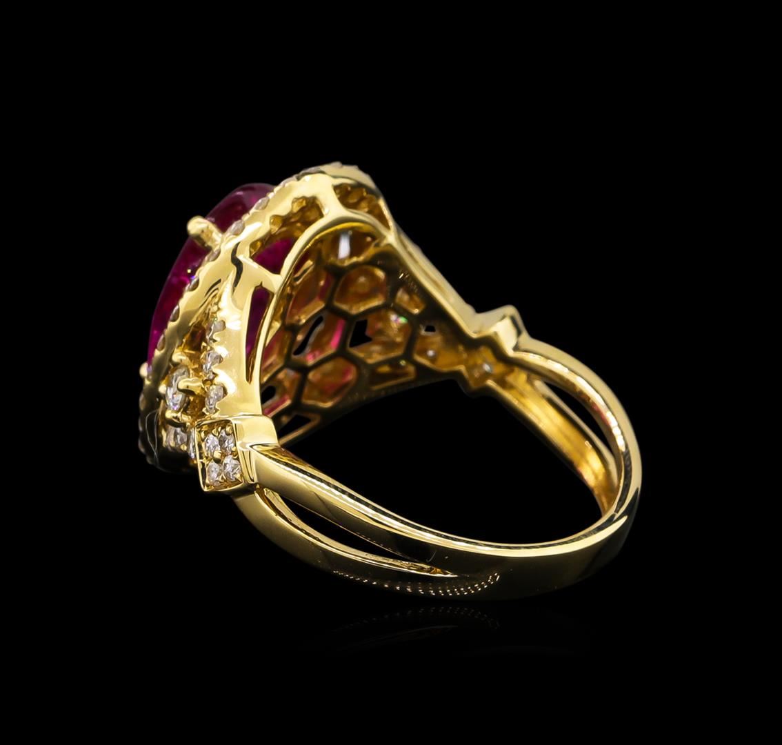 One electronically tested 14KT yellow gold Ladies combination cast & assembled ring with a high polish finish. Condition is new. Identified with markings of "14K". Containing: One prong set oval modified mixed cut natural pink tourmaline, measuring 11.00 x 9.00 x 5.00mm, approximate weight of 3.17ct., clarity is slightly included, type II, medium, moderately strong, reddish purple color, (GIA rP 5/4), cut is very good. Colored gemstones are presumed to have been subjected to commonly used color/clarity enhancement processes. Eight bead set round brilliant cut diamonds, measuring 1.00 - 1.00 x 0.60mm (depth est.) approximate. Total Weight of 8 Stones = 0.03ct. Clarity: SI-2 to I-1. Color: G - H, Cut is Good. Sixty-Eight prong set round brilliant cut diamonds, measuring 2.00 - 1.40 x 1.02mm (depth est.) approximate. Total Weight of 68 Stones = 1.14ct. Clarity: SI-2 to I-1. Color: G - H, Cut is Good. Total Weight of Colored Stones 3.17ct. Total Weight of Diamonds 1.17ct. Total Weight of Ring 6.60 grams. GGL Appraised at $8,360.00.