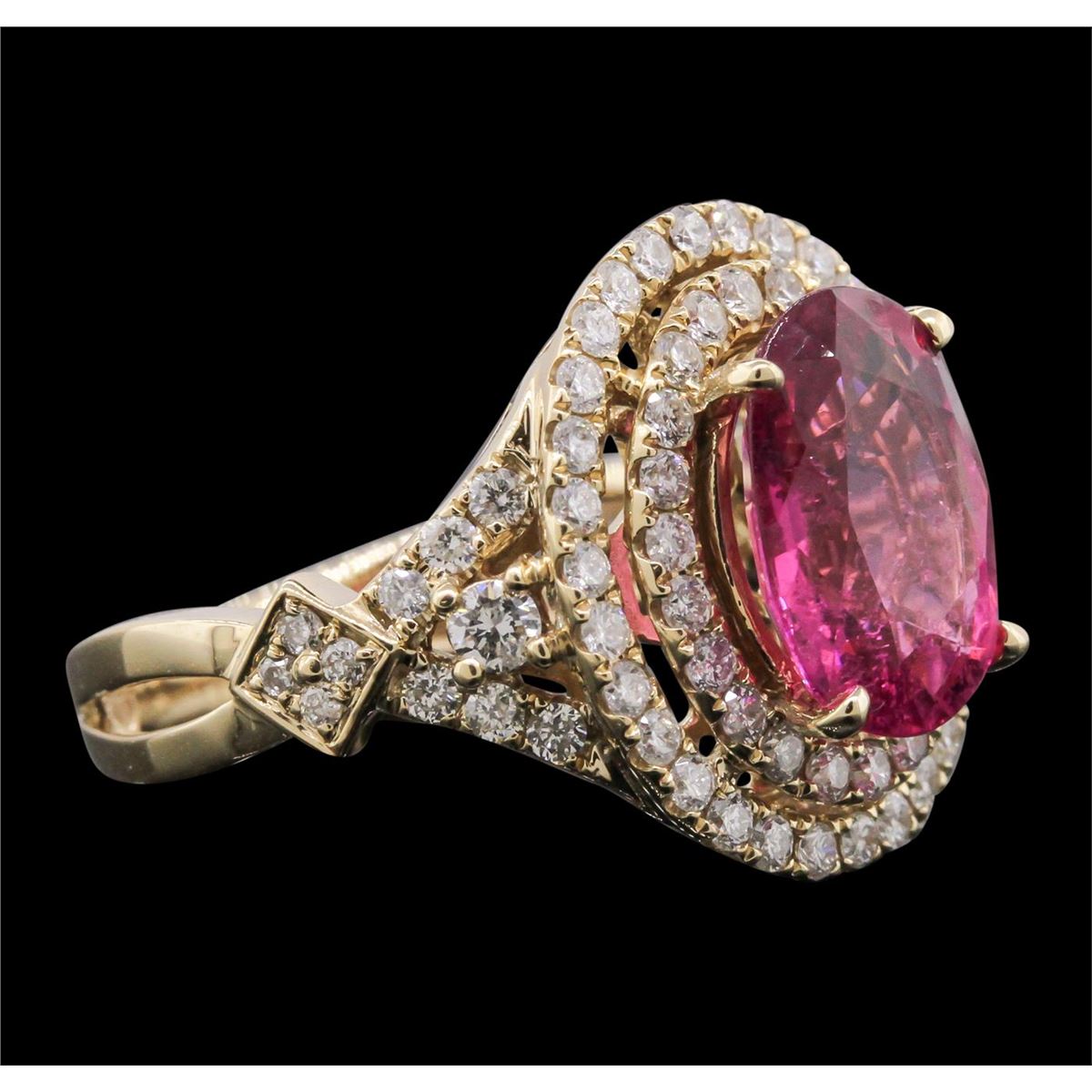 One electronically tested 14KT yellow gold Ladies combination cast & assembled ring with a high polish finish. Condition is new. Identified with markings of "14K". Containing: One prong set oval modified mixed cut natural pink tourmaline, measuring 11.00 x 9.00 x 5.00mm, approximate weight of 3.17ct., clarity is slightly included, type II, medium, moderately strong, reddish purple color, (GIA rP 5/4), cut is very good. Colored gemstones are presumed to have been subjected to commonly used color/clarity enhancement processes. Eight bead set round brilliant cut diamonds, measuring 1.00 - 1.00 x 0.60mm (depth est.) approximate. Total Weight of 8 Stones = 0.03ct. Clarity: SI-2 to I-1. Color: G - H, Cut is Good. Sixty-Eight prong set round brilliant cut diamonds, measuring 2.00 - 1.40 x 1.02mm (depth est.) approximate. Total Weight of 68 Stones = 1.14ct. Clarity: SI-2 to I-1. Color: G - H, Cut is Good. Total Weight of Colored Stones 3.17ct. Total Weight of Diamonds 1.17ct. Total Weight of Ring 6.60 grams. GGL Appraised at $8,360.00.