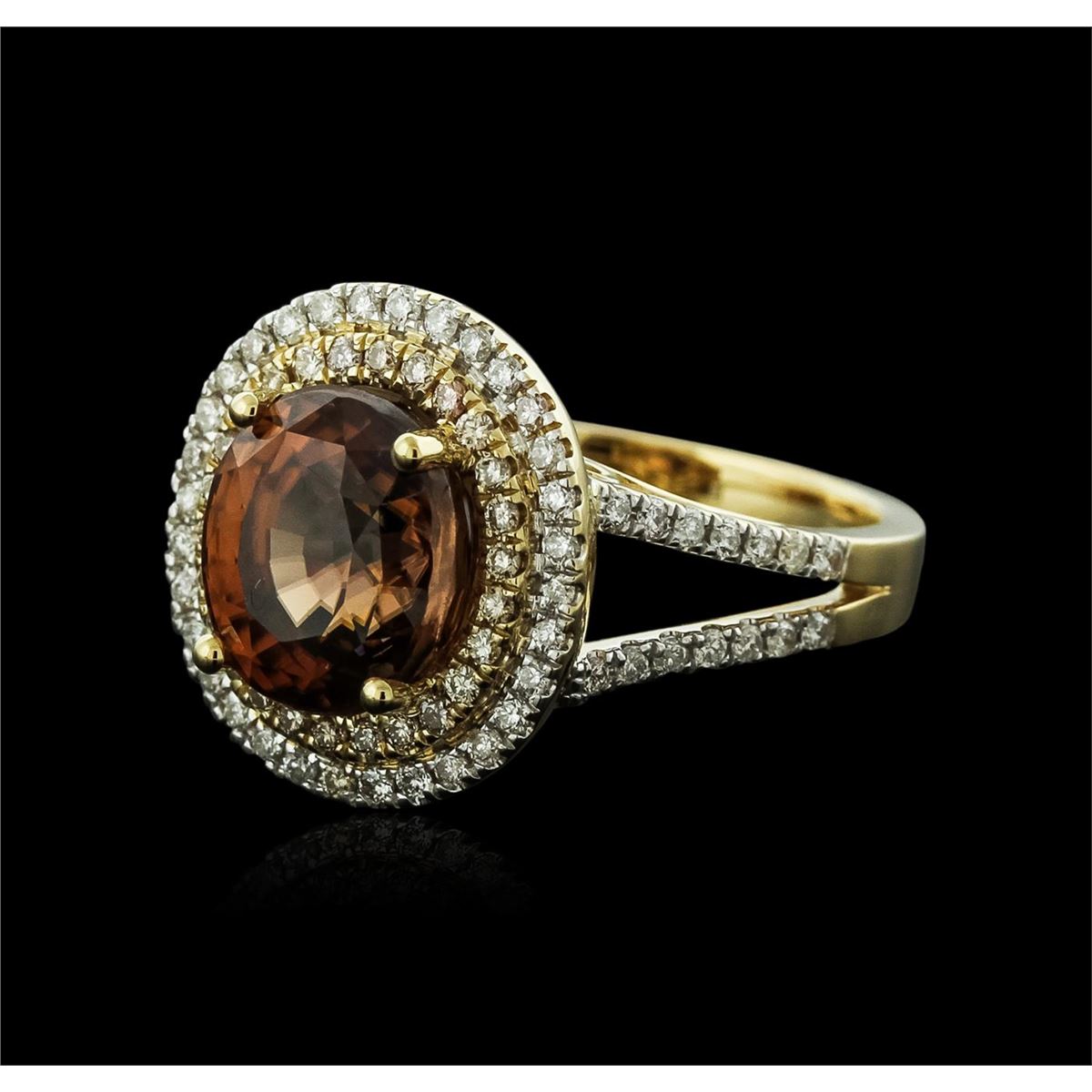 One electronically tested 14KT yellow gold ladies cast tourmaline and diamond ring with a bright polish finish. Identified with markings of "14K". Condition is new. Containing: One prong set oval modified brilliant cut natural golden tourmaline, measuring 10.00 x 8.80 x 5.72mm, approximate weight of 3.23ct., clarity is eye clean, type II, medium light, brownish, very slightly pinkish brown color, (GIA oY 4/3), cut is good. Eighty-Six prong set round brilliant cut diamonds, measuring 1.30 - 1.30 x 0.78mm (depth est.) approximate total weight of 86 Stones = 0.69ct. Clarity: I-1 to I-2. Color: K - L, Cut is Good. Colored gemstones are presumed to have been subjected to commonly used enhancement processes. All diamonds and colored gemstones are graded in the mounting, unless otherwise stated. Total Weight of Colored Stones 3.23ct. Total Weight of Diamonds 0.69ct. Total Weight of Ring 6.90 grams. GGL Appraised at $4,105.00.