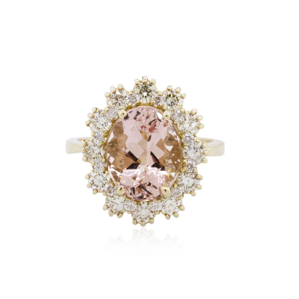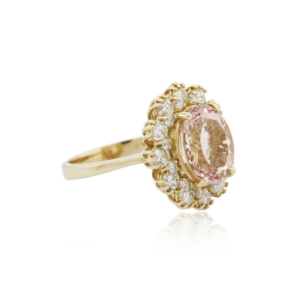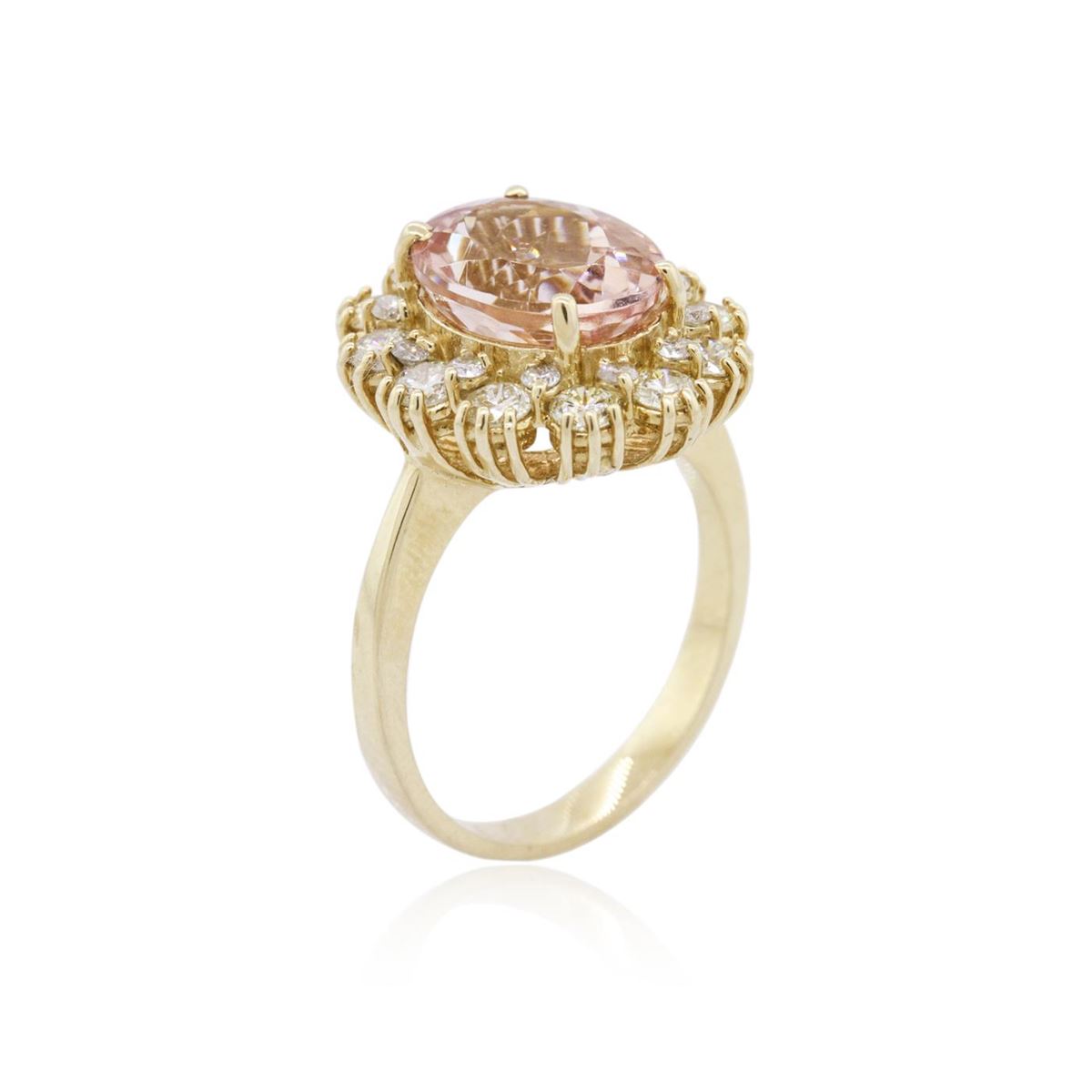 One electronically tested 14KT yellow gold ladies combination cast & assembled morganite and diamond ring with a bright polish finish. Identified with markings of "14K". Condition is new. Containing: One prong set oval modified brilliant cut natural morganite, measuring 11.00 x 8.90 x 5.79mm, approximate weight of 3.24ct., clarity is eye clean, type I, light, slightly brownish, reddish orange color, (GIA rO 3/2), cut is good. Twenty-Four prong set round brilliant cut diamonds, measuring 2.50 - 1.30 x 1.14mm (depth est.) approximate total weight of 24 Stones = 0.80ct. Clarity: SI-1 to SI-2. Color: I - J, Cut is Good. Colored gemstones are presumed to have been subjected to commonly used enhancement processes. All diamonds and colored gemstones are graded in the mounting, unless otherwise stated. Total Weight of Colored Stones 3.24ct. Total Weight of Diamonds 0.80ct. Total Weight of Ring 5.40 grams. GGL Appraised at $4,230.00.