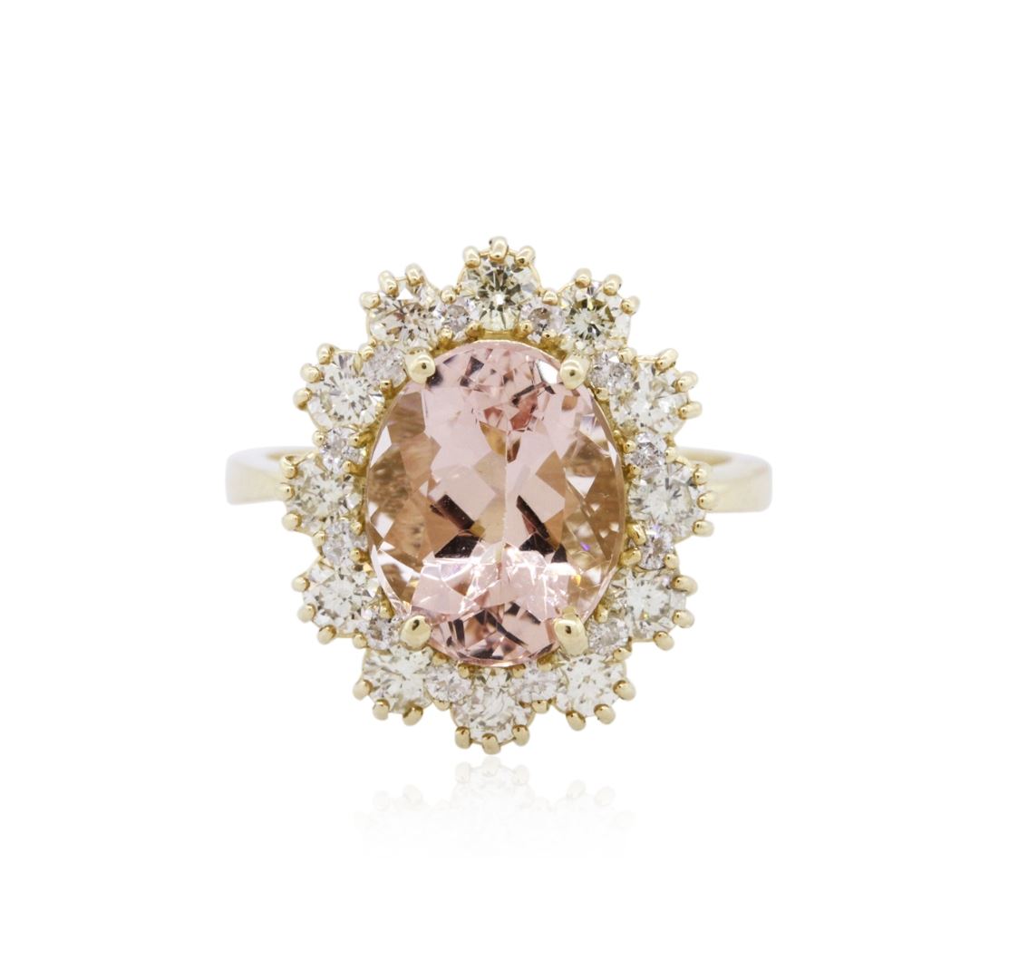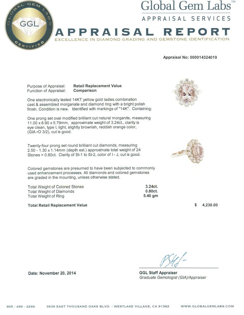 One electronically tested 14KT yellow gold ladies combination cast & assembled morganite and diamond ring with a bright polish finish. Identified with markings of "14K". Condition is new. Containing: One prong set oval modified brilliant cut natural morganite, measuring 11.00 x 8.90 x 5.79mm, approximate weight of 3.24ct., clarity is eye clean, type I, light, slightly brownish, reddish orange color, (GIA rO 3/2), cut is good. Twenty-Four prong set round brilliant cut diamonds, measuring 2.50 - 1.30 x 1.14mm (depth est.) approximate total weight of 24 Stones = 0.80ct. Clarity: SI-1 to SI-2. Color: I - J, Cut is Good. Colored gemstones are presumed to have been subjected to commonly used enhancement processes. All diamonds and colored gemstones are graded in the mounting, unless otherwise stated. Total Weight of Colored Stones 3.24ct. Total Weight of Diamonds 0.80ct. Total Weight of Ring 5.40 grams. GGL Appraised at $4,230.00.