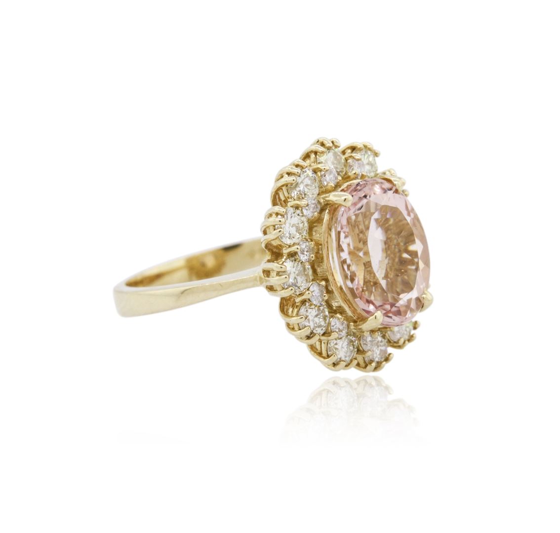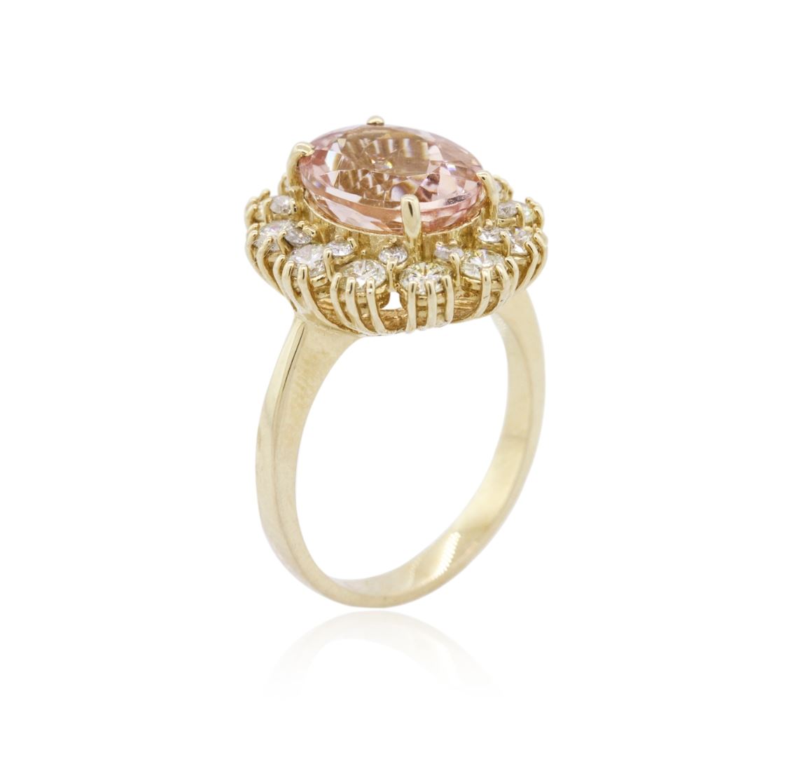 One electronically tested 14KT yellow gold ladies combination cast & assembled morganite and diamond ring with a bright polish finish. Identified with markings of "14K". Condition is new. Containing: One prong set oval modified brilliant cut natural morganite, measuring 11.00 x 8.90 x 5.79mm, approximate weight of 3.24ct., clarity is eye clean, type I, light, slightly brownish, reddish orange color, (GIA rO 3/2), cut is good. Twenty-Four prong set round brilliant cut diamonds, measuring 2.50 - 1.30 x 1.14mm (depth est.) approximate total weight of 24 Stones = 0.80ct. Clarity: SI-1 to SI-2. Color: I - J, Cut is Good. Colored gemstones are presumed to have been subjected to commonly used enhancement processes. All diamonds and colored gemstones are graded in the mounting, unless otherwise stated. Total Weight of Colored Stones 3.24ct. Total Weight of Diamonds 0.80ct. Total Weight of Ring 5.40 grams. GGL Appraised at $4,230.00.