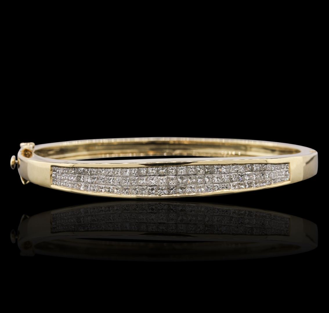 One electronically tested 14KT yellow gold ladies cast & assembled diamond bangle bracelet with a bright polish finish. Condition is new, good workmanship. Seven inch length hinged diamond set bangle bracelet, terminating in a concealed clasp with twin safeties. Identified with markings of "14K". Containing: Ninety-Nine invisible set round brilliant cut diamonds, measuring 2.10 - 1.30 x 1.02mm (depth est.) approximate. Total Weight of 99 Stones = 3.25ct. Graded in the setting. Clarity: VS-1 to SI-1. Color: H - J. Total Weight of Diamonds 3.25ct. Total Weight of Bangle Bracelet 27.20 grams. AIG Appraised at $11,365.00.