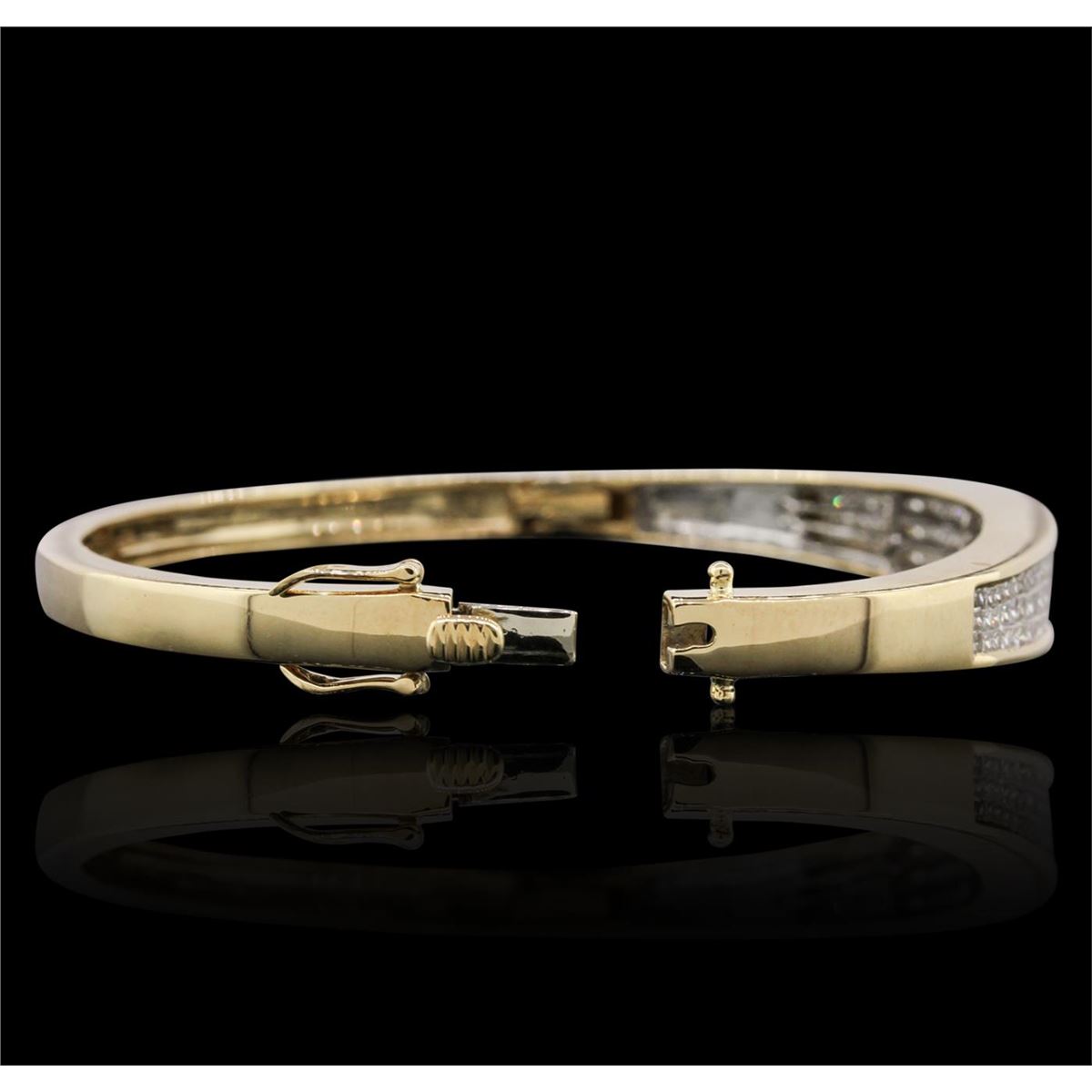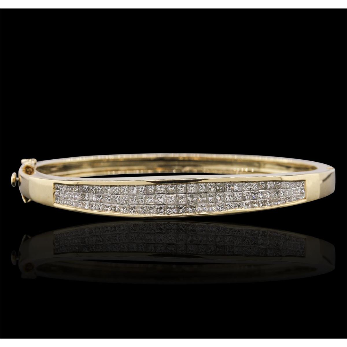One electronically tested 14KT yellow gold ladies cast & assembled diamond bangle bracelet with a bright polish finish. Condition is new, good workmanship. Seven inch length hinged diamond set bangle bracelet, terminating in a concealed clasp with twin safeties. Identified with markings of "14K". Containing: Ninety-Nine invisible set round brilliant cut diamonds, measuring 2.10 - 1.30 x 1.02mm (depth est.) approximate. Total Weight of 99 Stones = 3.25ct. Graded in the setting. Clarity: VS-1 to SI-1. Color: H - J. Total Weight of Diamonds 3.25ct. Total Weight of Bangle Bracelet 27.20 grams. AIG Appraised at $11,365.00.