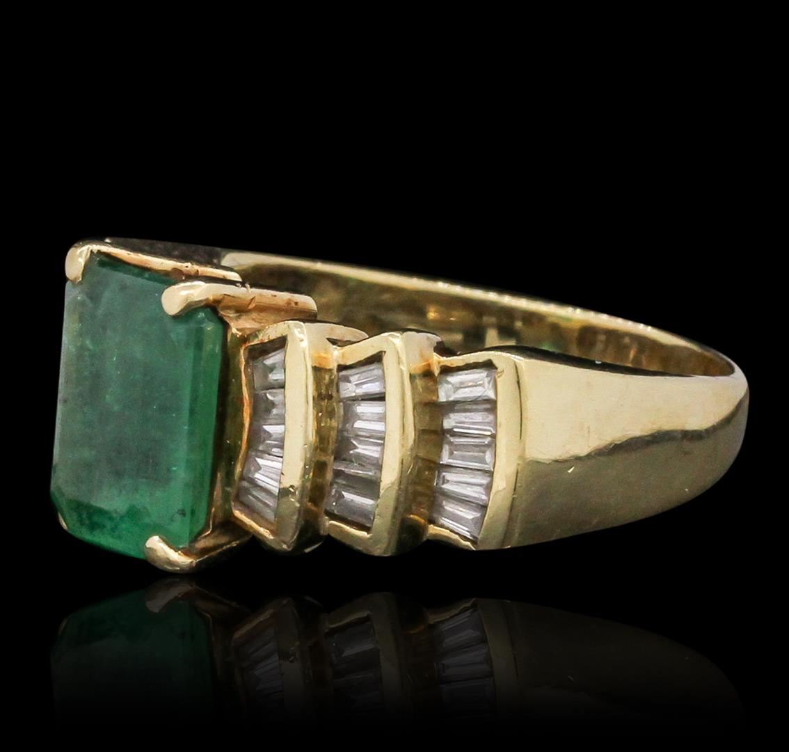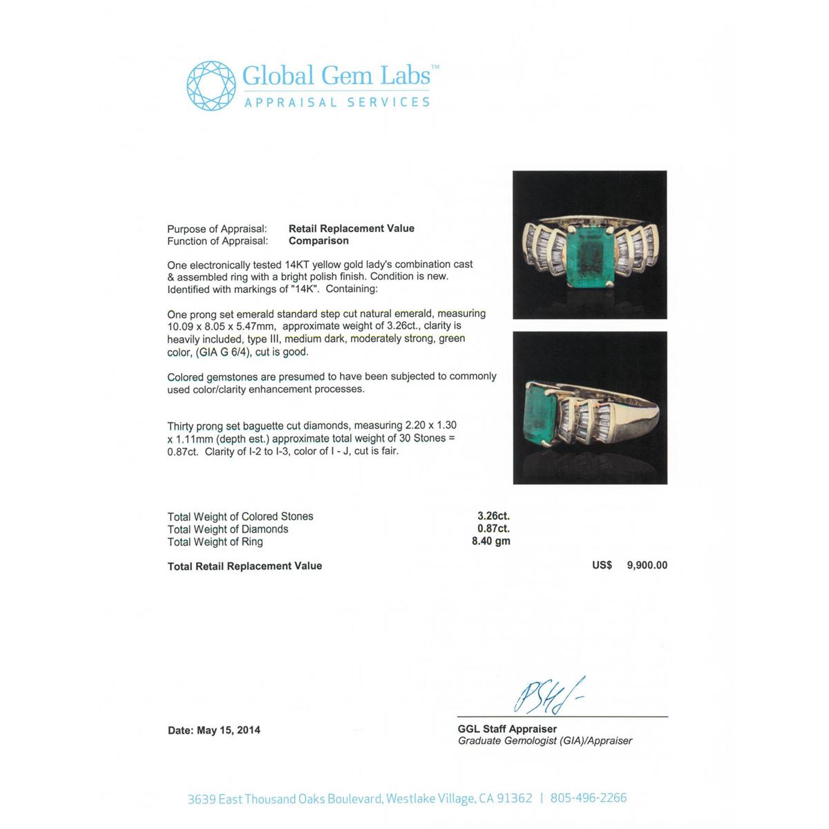 One electronically tested 14KT yellow gold Ladies combination cast & assembled ring with a bright polish finish. Identified with markings of "14K". Condition is new. Containing: One prong set emerald standard step cut natural emerald, measuring 10.09 x 8.05 x 5.47mm, approximate weight of 3.26ct., clarity is heavily included, type III, medium dark, moderately strong, green color, (GIA G 6/4), cut is good. Colored gemstones are presumed to have been subjected to commonly used color/clarity enhancement processes. Thirty prong set baguette cut diamonds, measuring 2.20 x 1.30 x 1.11mm (depth est.) approximate. Total Weight of 30 Stones = 0.87ct. Clarity: I-2 to I-3. Color: I - J, Cut is Fair. Total Weight of Colored Stones 3.26ct. Total Weight of Diamonds 0.87ct. Total Weight of Ring 8.40 grams. GGL Appraised at $9,900.00.