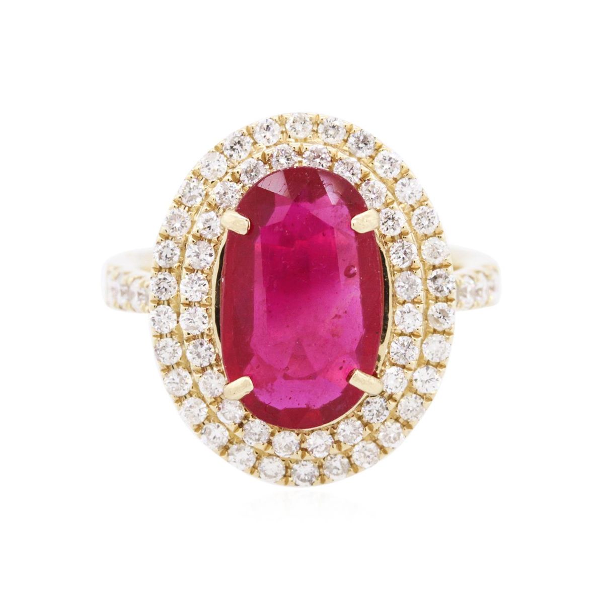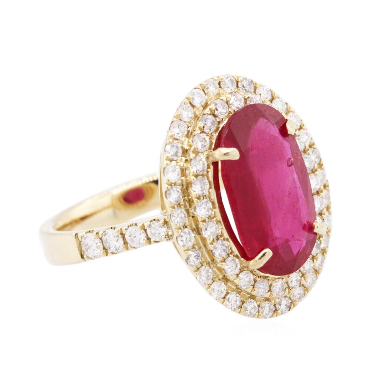 One electronically tested 14KT yellow gold ladies combination cast & assembled ruby and diamond ring with a flat shank with a bright polish finish. Identified with markings of "14K". Condition is new. Containing: One prong set oval modified brilliant cut natural ruby, measuring 13.66 x 8.24 x 3.40mm, approximate weight of 3.26ct., clarity is heavily included, type II, medium dark, moderately strong, strongly purplish red color, (GIA stpR 6/4), cut is good. Sixty-Two prong set round brilliant cut diamonds, measuring 2.00 - 1.30 x 0.99mm (depth est.) approximate total weight of 62 Stones = 0.70ct. Clarity: SI-2 to I-2. Color: I - J, Cut is Good. Colored gemstones are presumed to have been subjected to commonly used enhancement processes. All diamonds and colored gemstones are graded in the mounting, unless otherwise stated. Total Weight of Colored Stones 3.26ct. Total Weight of Diamonds 0.70ct. Total Weight of Ring 6.50 grams. GGL Appraised at $4,795.00.