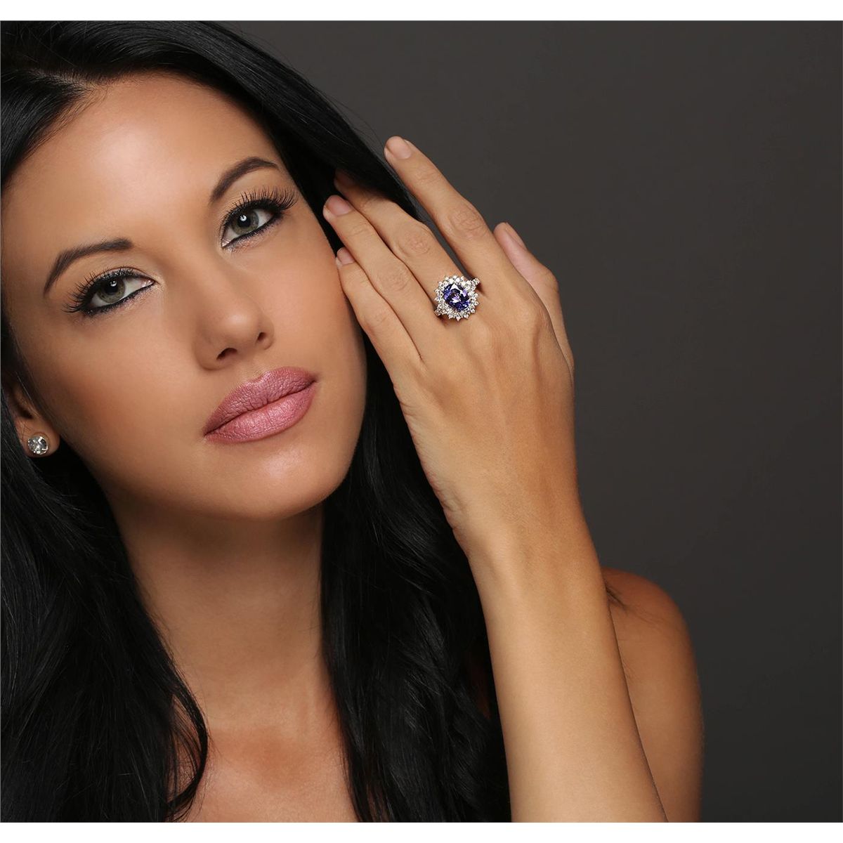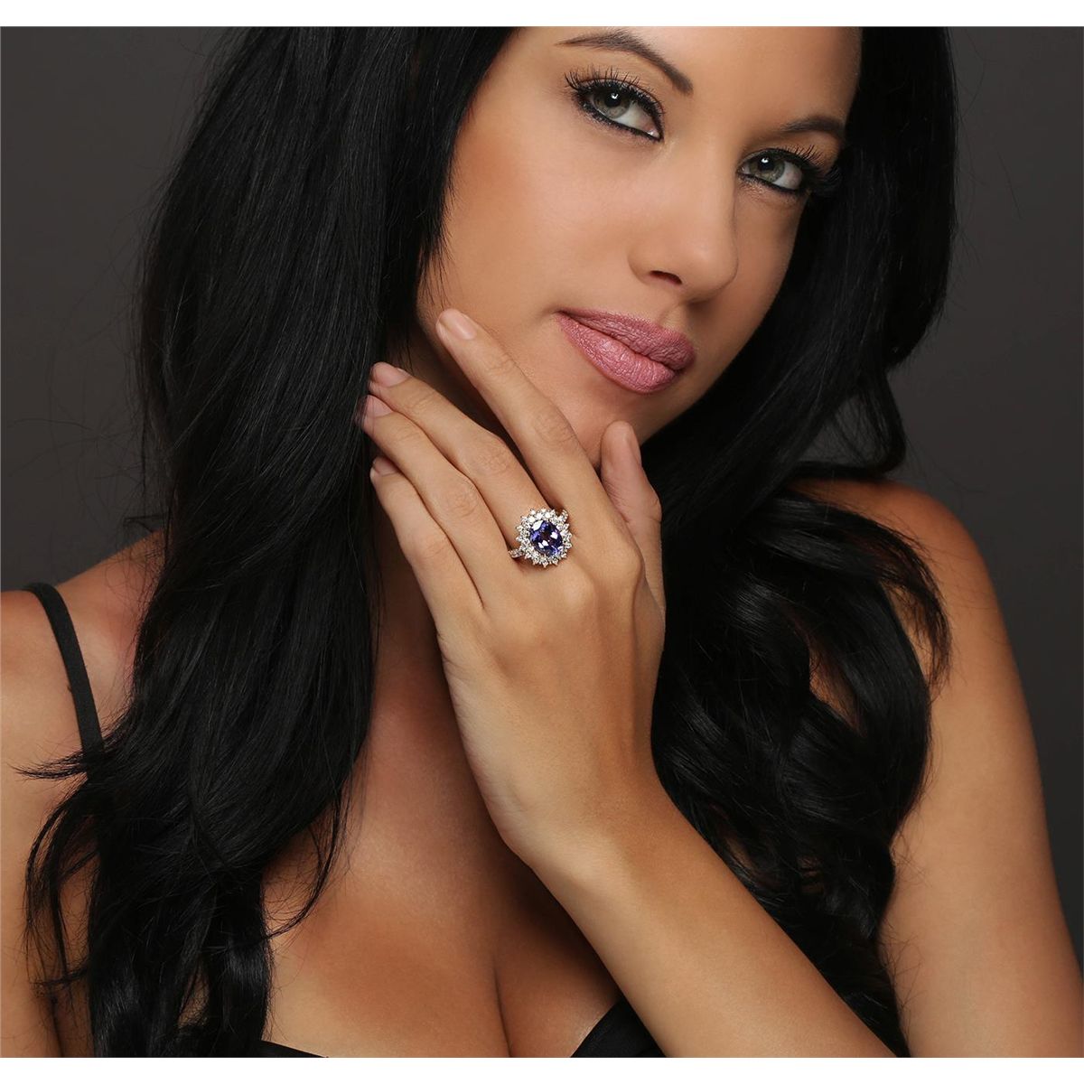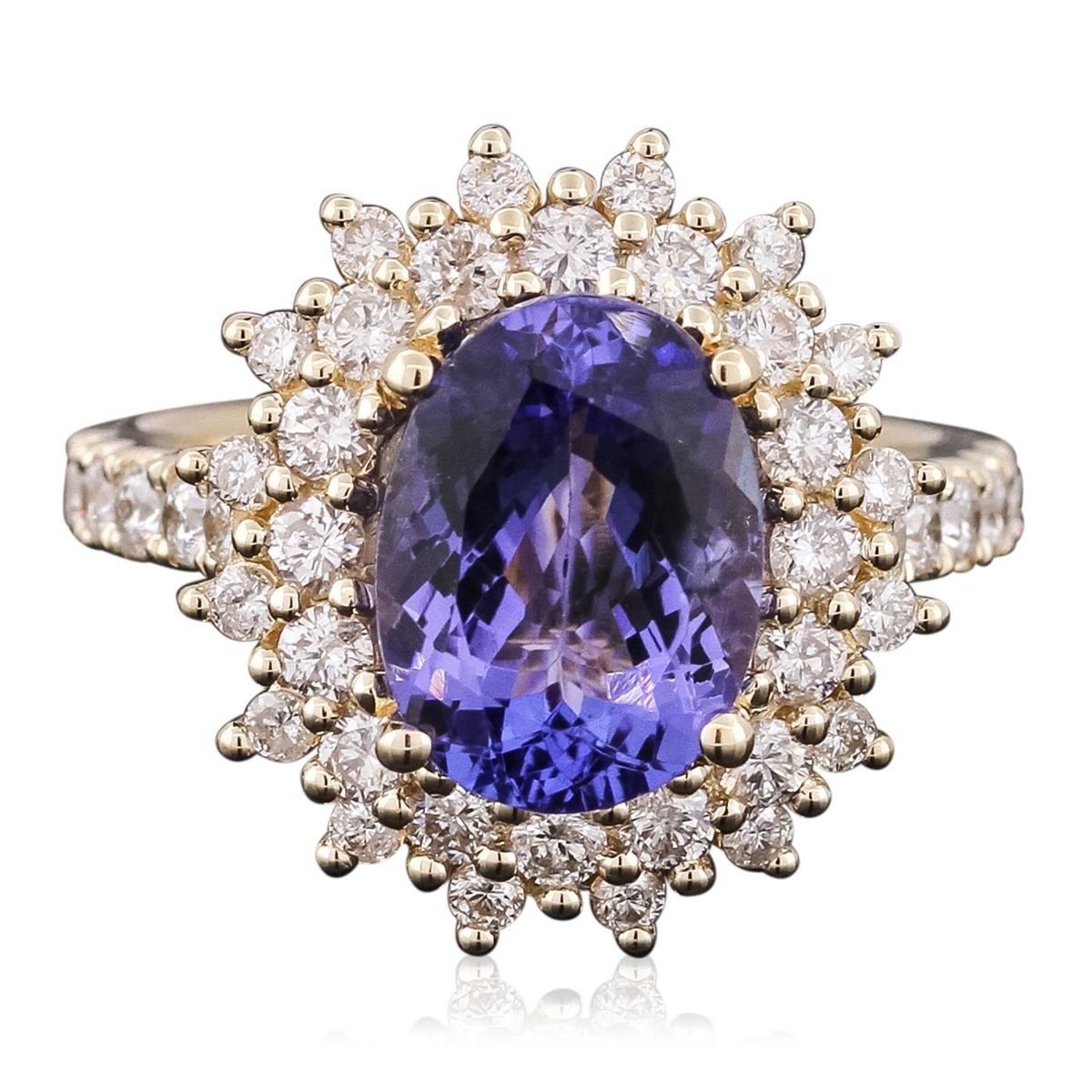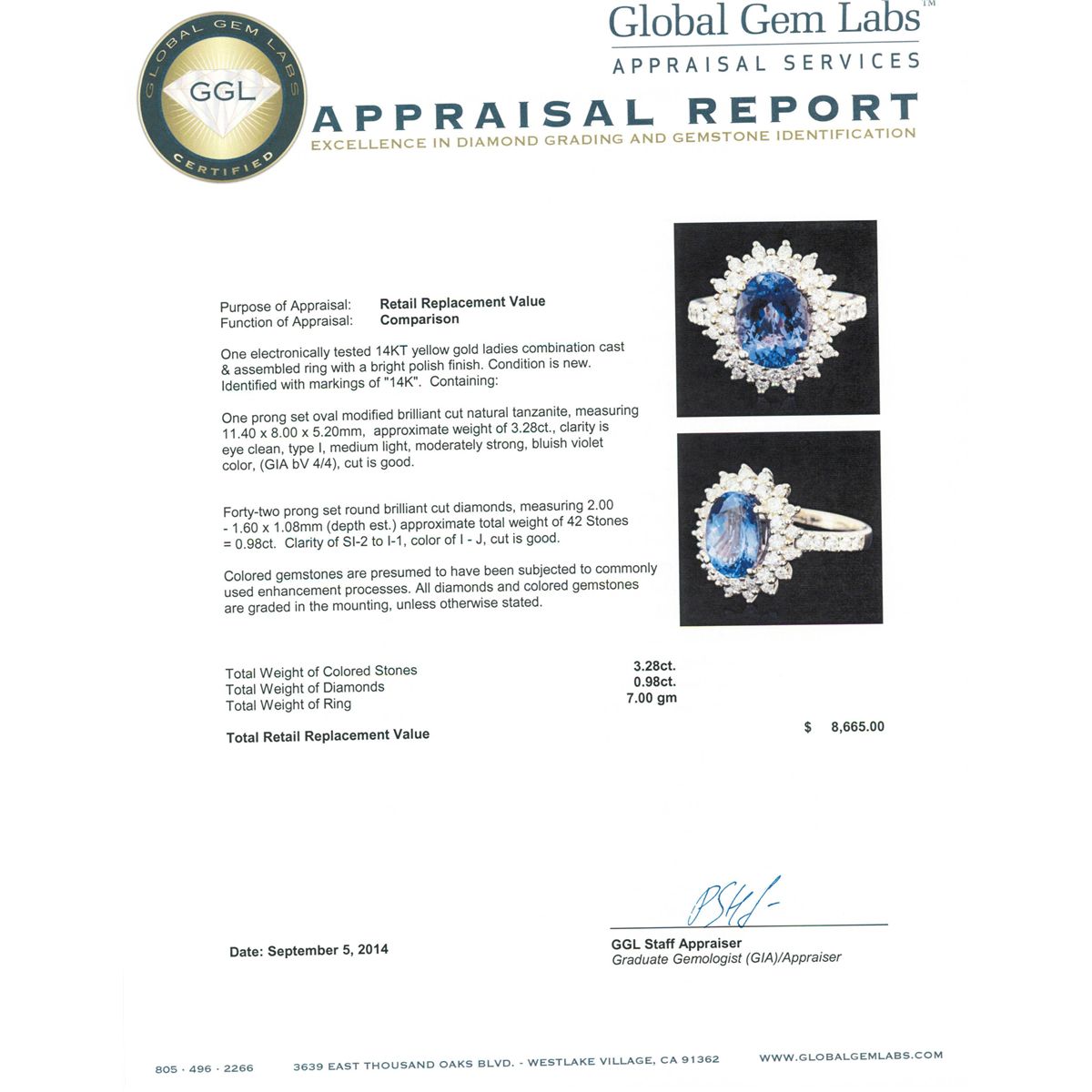 One electronically tested 14KT yellow gold ladies combination cast & assembled ring with a bright polish finish. Identified with markings of "14K". Condition is new. Containing: One prong set oval modified brilliant cut natural tanzanite, measuring 11.40 x 8.00 x 5.20mm, approximate weight of 3.28ct., clarity is eye clean, type I, medium light, moderately strong, bluish violet color, (GIA bV 4/4), cut is good. Forty-Two prong set round brilliant cut diamonds, measuring 2.00 - 1.60 x 1.08mm (depth est.) approximate total weight of 42 Stones = 0.98ct. Clarity: SI-2 to I-1. Color: I - J, Cut is Good. Colored gemstones are presumed to have been subjected to commonly used enhancement processes. All diamonds and colored gemstones are graded in the mounting, unless otherwise stated. Total Weight of Colored Stones 3.28ct. Total Weight of Diamonds 0.98ct. Total Weight of Ring 7.00 grams. GGL Appraised at $8,665.00.