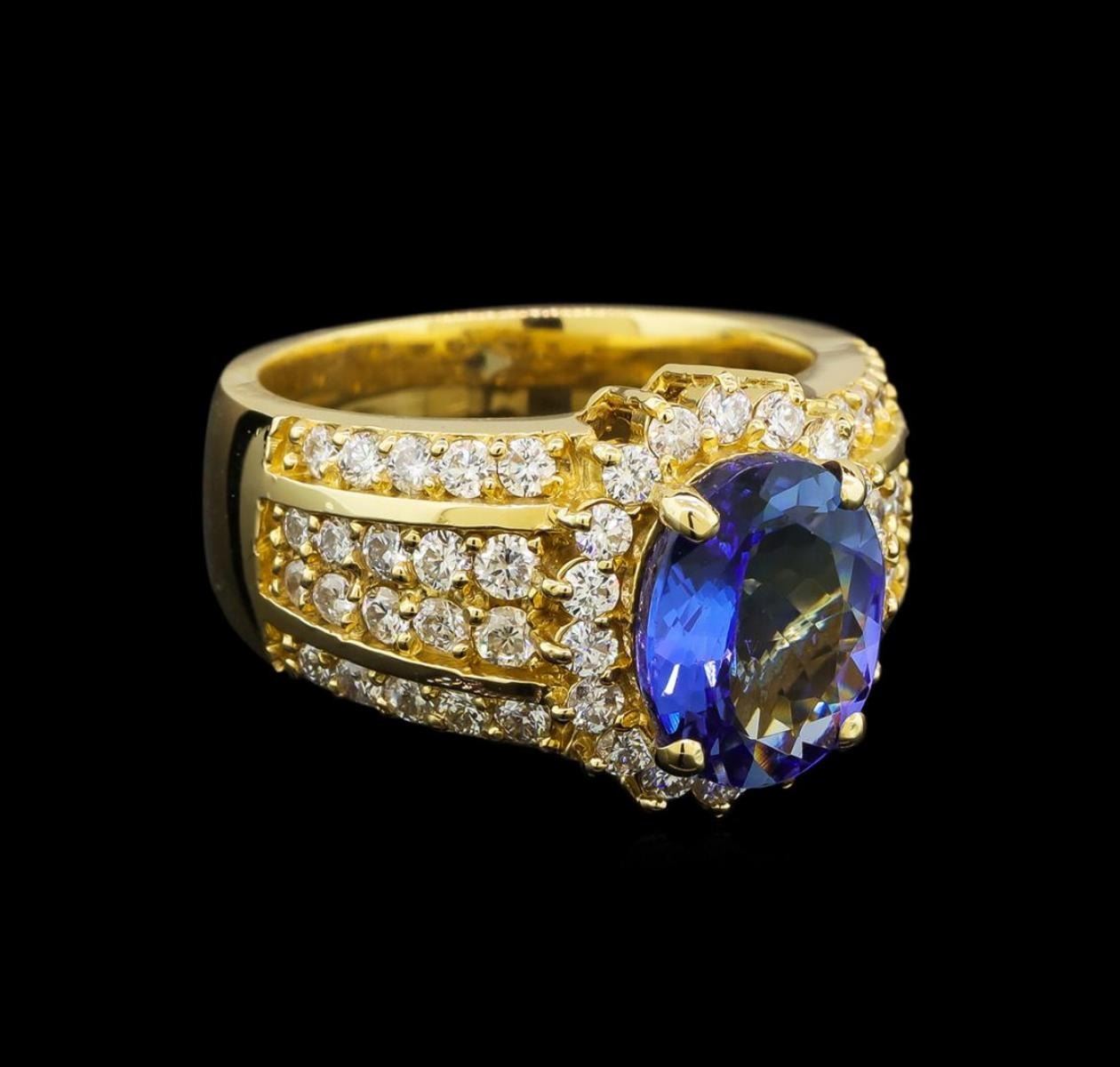 One electronically tested 14KT yellow gold ladies cast tanzanite and diamond ring with a bright polish finish. Identified with markings of "K14". Condition is new. Containing: One prong set oval modified brilliant cut natural tanzanite, measuring 10.70 x 8.20 x 5.33mm, approximate weight of 3.29ct., clarity is eye clean, type I, medium light, very slightly grayish, violet color, (GIA V 4/3), cut is good. Fifty-Eight prong set round brilliant cut diamonds, measuring 1.80 - 1.80 x 1.08mm (depth est.) approximate total weight of 58 Stones = 1.24ct. Clarity: SI-1 to I-1. Color: H - I, Cut is Good. Colored gemstones are presumed to have been subjected to commonly used enhancement processes. All diamonds and colored gemstones are graded in the mounting, unless otherwise stated. Total Weight of Colored Stones 3.29ct. Total Weight of Diamonds 1.24ct. Total Weight of Ring 11.30 grams. GGL Appraised.