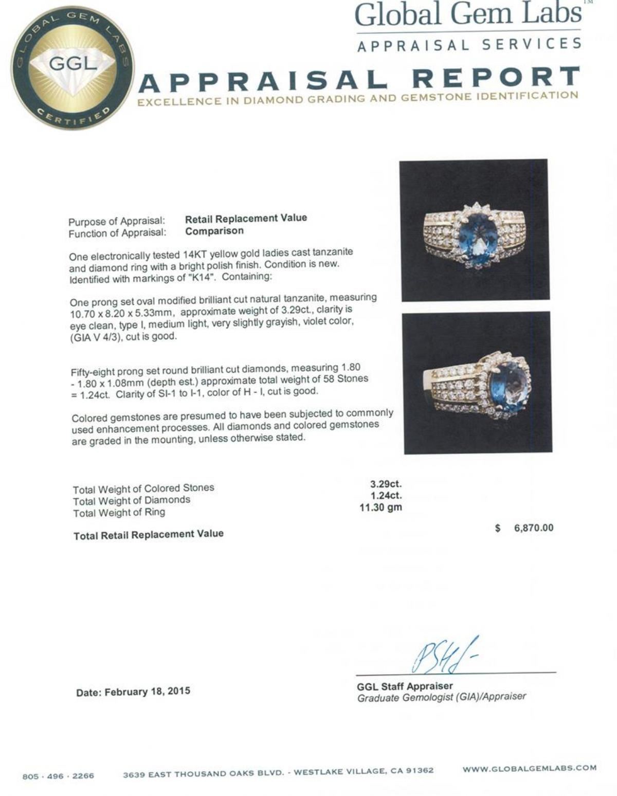 One electronically tested 14KT yellow gold ladies cast tanzanite and diamond ring with a bright polish finish. Identified with markings of "K14". Condition is new. Containing: One prong set oval modified brilliant cut natural tanzanite, measuring 10.70 x 8.20 x 5.33mm, approximate weight of 3.29ct., clarity is eye clean, type I, medium light, very slightly grayish, violet color, (GIA V 4/3), cut is good. Fifty-Eight prong set round brilliant cut diamonds, measuring 1.80 - 1.80 x 1.08mm (depth est.) approximate total weight of 58 Stones = 1.24ct. Clarity: SI-1 to I-1. Color: H - I, Cut is Good. Colored gemstones are presumed to have been subjected to commonly used enhancement processes. All diamonds and colored gemstones are graded in the mounting, unless otherwise stated. Total Weight of Colored Stones 3.29ct. Total Weight of Diamonds 1.24ct. Total Weight of Ring 11.30 grams. GGL Appraised.