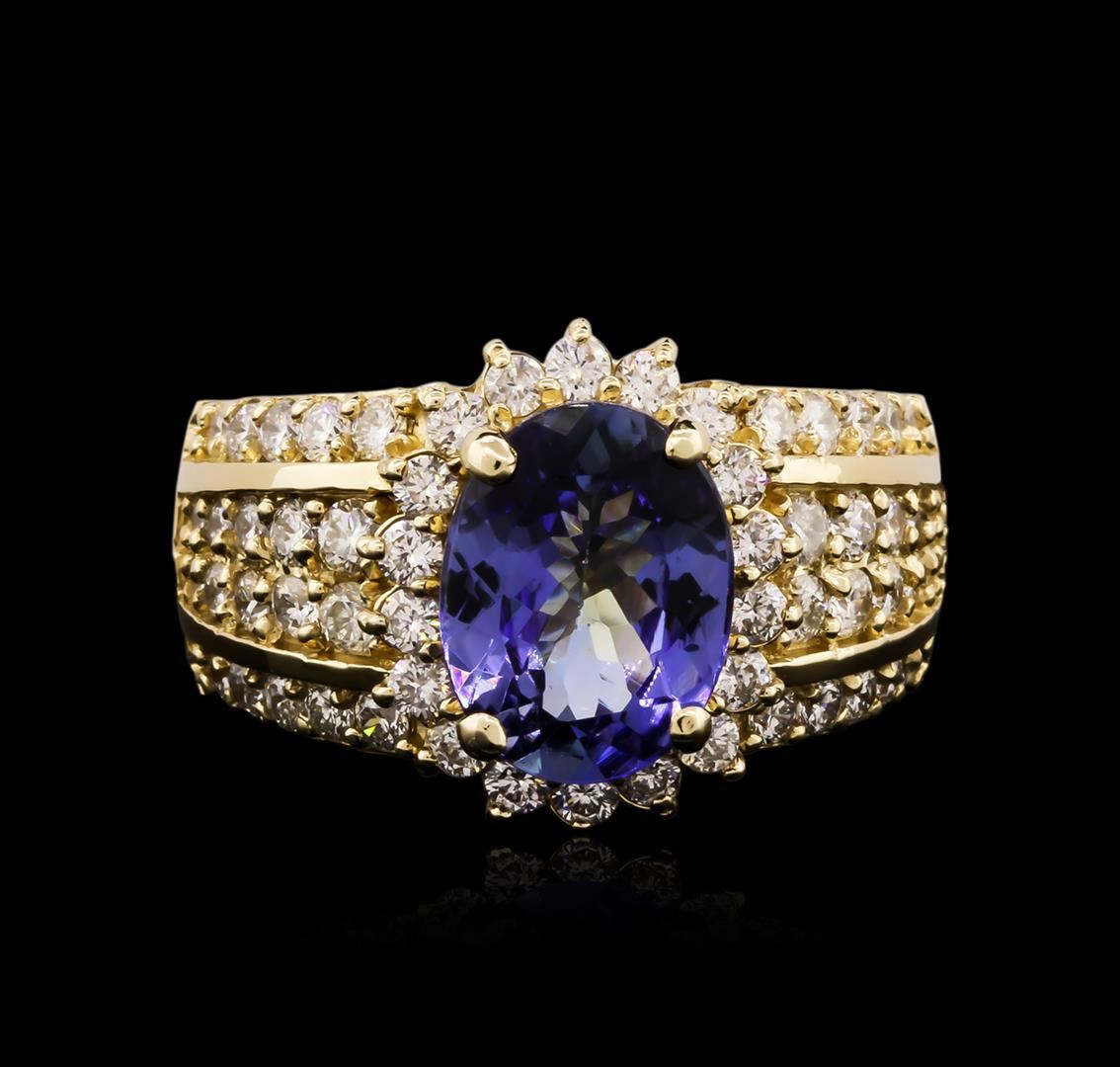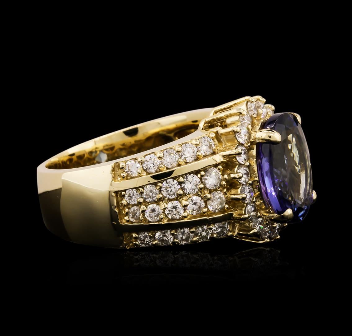 One electronically tested 14KT yellow gold ladies cast tanzanite and diamond ring with a bright polish finish. Identified with markings of "K14". Condition is new. Containing: One prong set oval modified brilliant cut natural tanzanite, measuring 10.70 x 8.20 x 5.33mm, approximate weight of 3.29ct., clarity is eye clean, type I, medium light, very slightly grayish, violet color, (GIA V 4/3), cut is good. Fifty-Eight prong set round brilliant cut diamonds, measuring 1.80 - 1.80 x 1.08mm (depth est.) approximate total weight of 58 Stones = 1.24ct. Clarity: SI-1 to I-1. Color: H - I, Cut is Good. Colored gemstones are presumed to have been subjected to commonly used enhancement processes. All diamonds and colored gemstones are graded in the mounting, unless otherwise stated. Total Weight of Colored Stones 3.29ct. Total Weight of Diamonds 1.24ct. Total Weight of Ring 11.30 grams. GGL Appraised at $6,870.00.