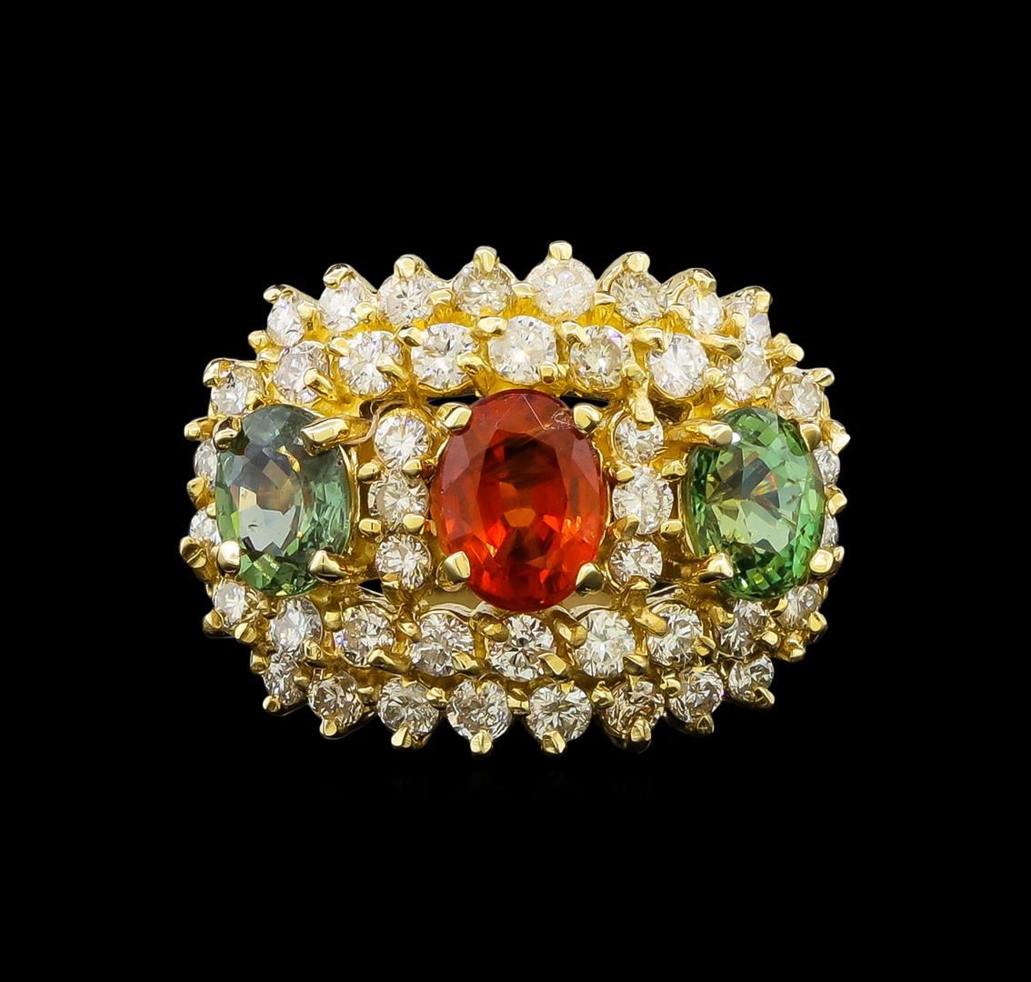 One electronically tested 14KT yellow gold ladies cast sapphire and diamond ring with a bright polish finish. Identified with markings of "14K". Condition is new. Containing: One prong set oval modified brilliant cut natural orange sapphire, measuring 7.00. x 5.20 x 3.38mm, approximate weight of 1.10ct., clarity is moderately included, type II, medium, brownish, orange color, (GIA O 5/3), cut is good. Two prong set oval modified brilliant cut natural green sapphires, measuring 7.00. x 5.30 x 3.45mm, approximate total weight of 2.22ct., clarity is moderately included, medium light, very slightly grayish, green color, (GIA G 4/3), cut is good. Forty-Four prong set round brilliant cut diamonds, measuring 2.00. - 1.50 x 1.05mm (depth est.) approximate total weight of 44 Stones = 1.27ct. Clarity: SI-1 to I-1. Color: J - K, Cut is Good. Colored gemstones are presumed to have been subjected to commonly used enhancement processes. All diamonds and colored gemstones are graded in the mounting, unless otherwise stated. Total Weight of Colored Stones 3.32ct. Total Weight of Diamonds 1.27ct. Total Weight of Ring 9.30 grams. GGL Appraised at $4,125.00.