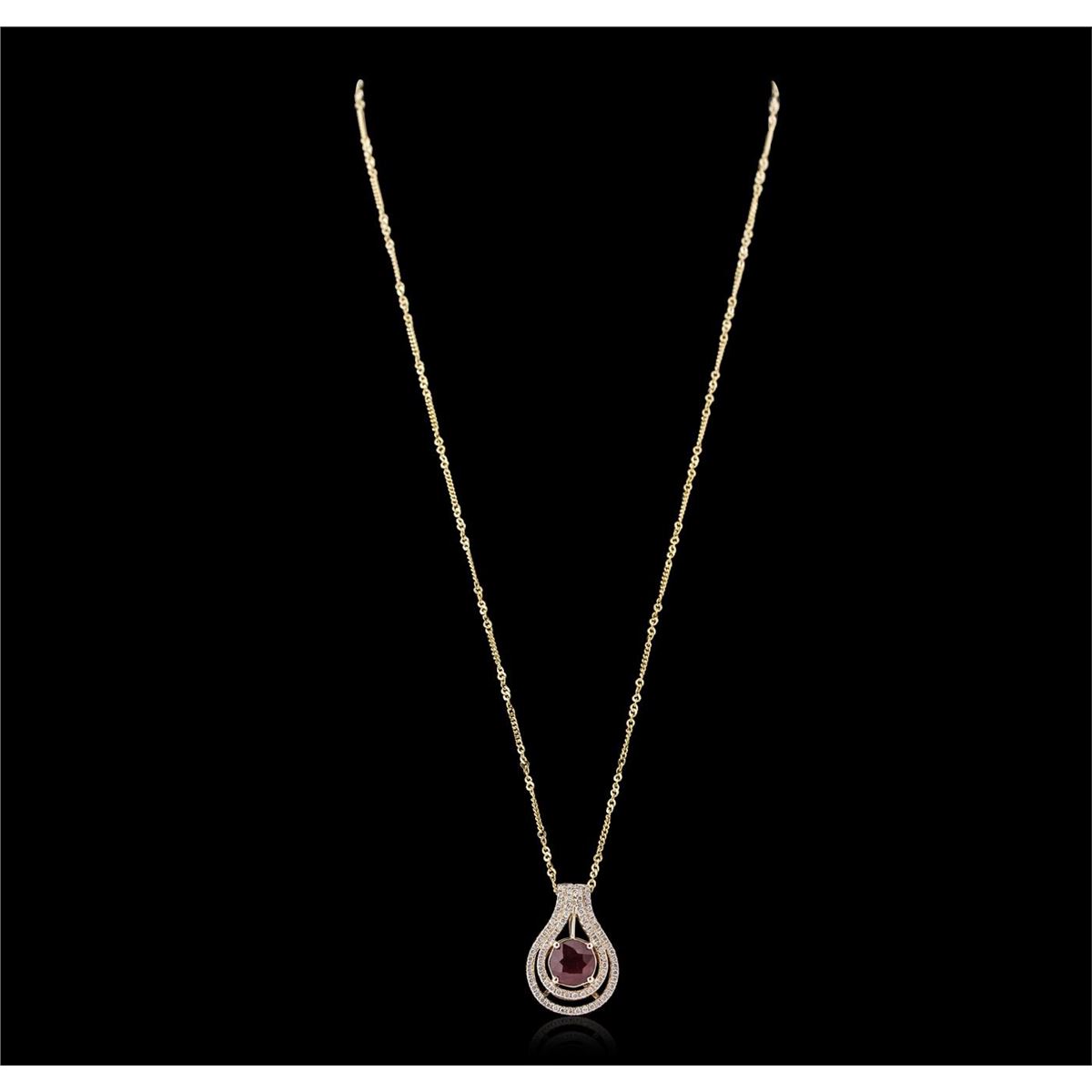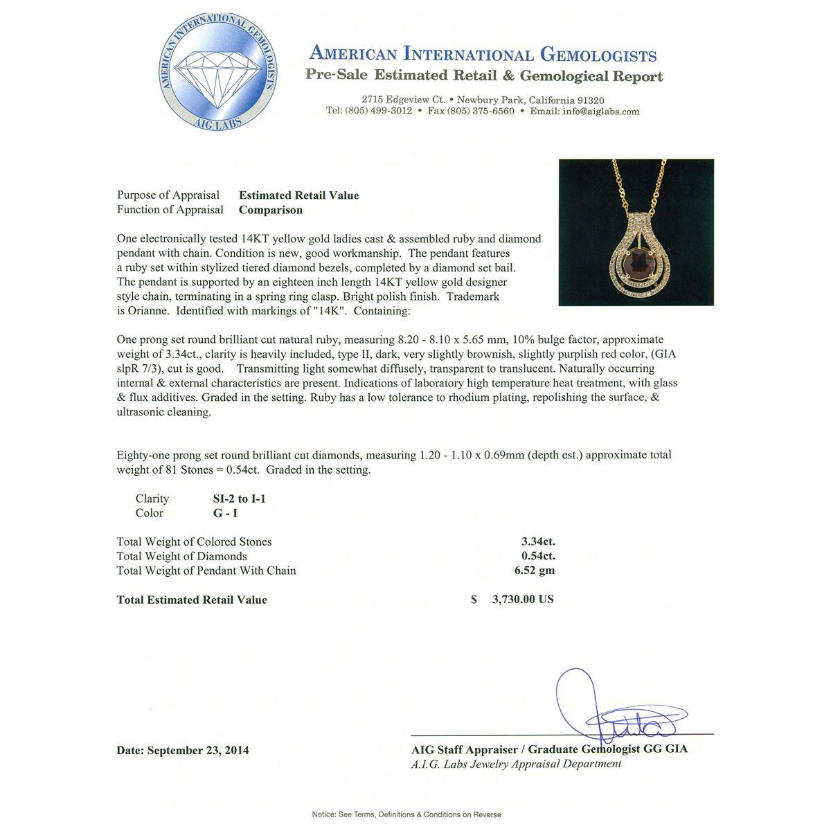 One electronically tested 14KT yellow gold ladies cast & assembled ruby and diamond pendant with chain. The pendant features a ruby set within stylized tiered diamond bezels, completed by a diamond set bail. The pendant is supported by an eighteen inch length 14KT yellow gold designer style chain, terminating in a spring ring clasp. Bright polish finish. Trademark is Orianne. Identified with markings of "14K". Condition is new, good workmanship. Containing: One prong set round brilliant cut natural ruby, measuring 8.20 - 8.10 x 5.65 mm, 10% bulge factor, approximate weight of 3.34ct., clarity is heavily included, type II, dark, very slightly brownish, slightly purplish red color, (GIA slpR 7/3), cut is good. Transmitting light somewhat diffusely, transparent to translucent. Naturally occurring internal & external characteristics are present. Indications of laboratory high temperature heat treatment, with glass & flux additives. Graded in the setting. Ruby has a low tolerance to rhodium plating, repolishing the surface, & ultrasonic cleaning. Eighty-One prong set round brilliant cut diamonds, measuring 1.20 - 1.10 x 0.69mm (depth est.) approximate total weight of 81 Stones = 0.54ct. Graded in the setting. Clarity: SI-2 to I-1. Color: G - I. Total Weight of Colored Stones 3.34ct. Total Weight of Diamonds 0.54ct. Total Weight of Pendant With Chain 6.52 grams. AIG Appraised at $3,730.00.