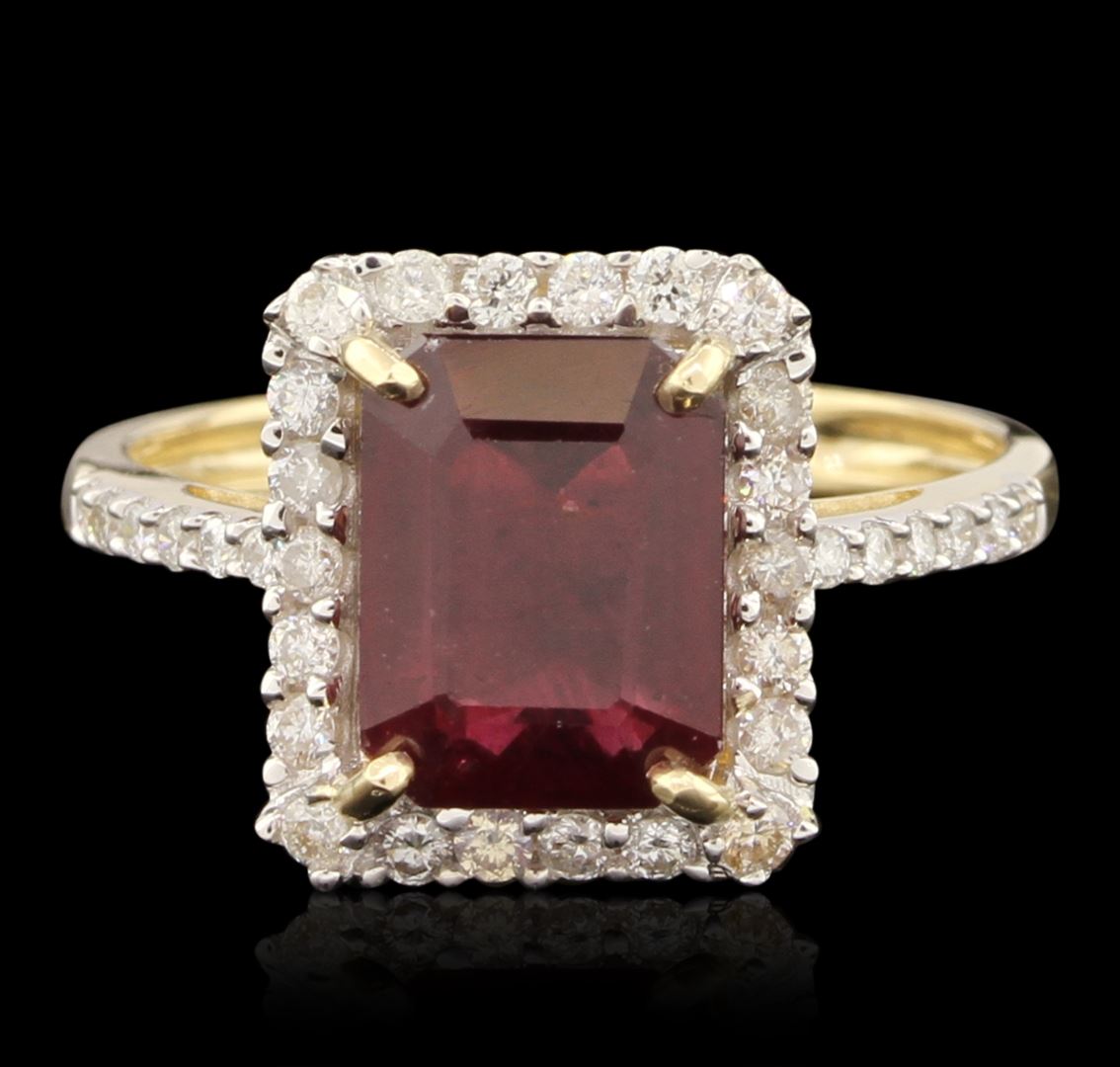 One electronically tested 14KT yellow gold lady's combination cast & assembled cocktail ring with a bright polish finish. Condition is excellent. Identified with markings of "14K". Containing: One prong set emerald standard step cut natural ruby, measuring 9.10 x 7.00 x 4.20mm, approximate weight of 3.34ct., clarity is heavily included, type II, medium dark, moderately strong, strongly purplish red color, (GIA stpR 6/4), cut is very good. Colored gemstones are presumed to have been subjected to commonly used and possible undetectable color/clarity enhancement processes. Thirty-two prong set round brilliant cut diamonds, measuring 1.30 - 1.20 x 0.75mm (depth est.) approximate total weight of 32 Stones = 0.46ct. Clarity of I-1 to I-2, color of H - J, cut is good. Total Weight of Colored Stones 3.34ct. Total Weight of Diamonds 0.46ct. Total Weight of Ring 3.10 grams. GGL appraised at $2,910.00. GGL Appraised at $2,190.00.