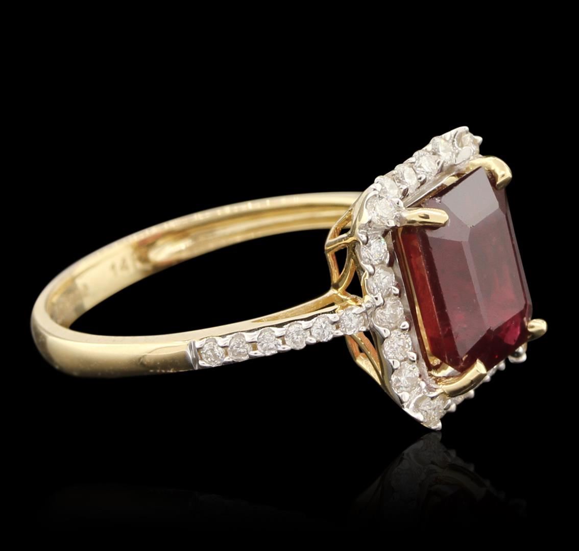One electronically tested 14KT yellow gold lady's combination cast & assembled cocktail ring with a bright polish finish. Condition is excellent. Identified with markings of "14K". Containing: One prong set emerald standard step cut natural ruby, measuring 9.10 x 7.00 x 4.20mm, approximate weight of 3.34ct., clarity is heavily included, type II, medium dark, moderately strong, strongly purplish red color, (GIA stpR 6/4), cut is very good. Colored gemstones are presumed to have been subjected to commonly used and possible undetectable color/clarity enhancement processes. Thirty-two prong set round brilliant cut diamonds, measuring 1.30 - 1.20 x 0.75mm (depth est.) approximate total weight of 32 Stones = 0.46ct. Clarity of I-1 to I-2, color of H - J, cut is good. Total Weight of Colored Stones 3.34ct. Total Weight of Diamonds 0.46ct. Total Weight of Ring 3.10 grams. GGL appraised at $2,910.00. GGL Appraised at $2,190.00.