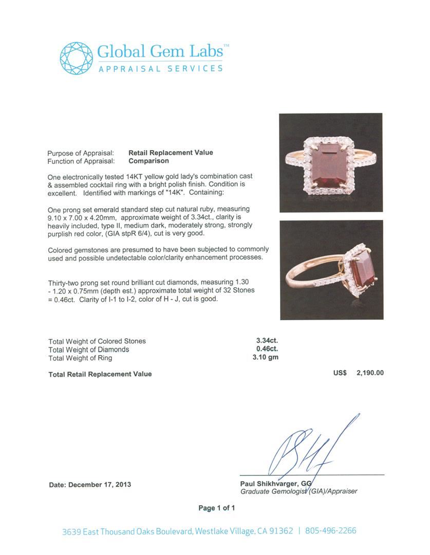 One electronically tested 14KT yellow gold lady's combination cast & assembled cocktail ring with a bright polish finish. Condition is excellent. Identified with markings of "14K". Containing: One prong set emerald standard step cut natural ruby, measuring 9.10 x 7.00 x 4.20mm, approximate weight of 3.34ct., clarity is heavily included, type II, medium dark, moderately strong, strongly purplish red color, (GIA stpR 6/4), cut is very good. Colored gemstones are presumed to have been subjected to commonly used and possible undetectable color/clarity enhancement processes. Thirty-two prong set round brilliant cut diamonds, measuring 1.30 - 1.20 x 0.75mm (depth est.) approximate total weight of 32 Stones = 0.46ct. Clarity of I-1 to I-2, color of H - J, cut is good. Total Weight of Colored Stones 3.34ct. Total Weight of Diamonds 0.46ct. Total Weight of Ring 3.10 grams. GGL appraised at $2,910.00. GGL Appraised at $2,190.00.
