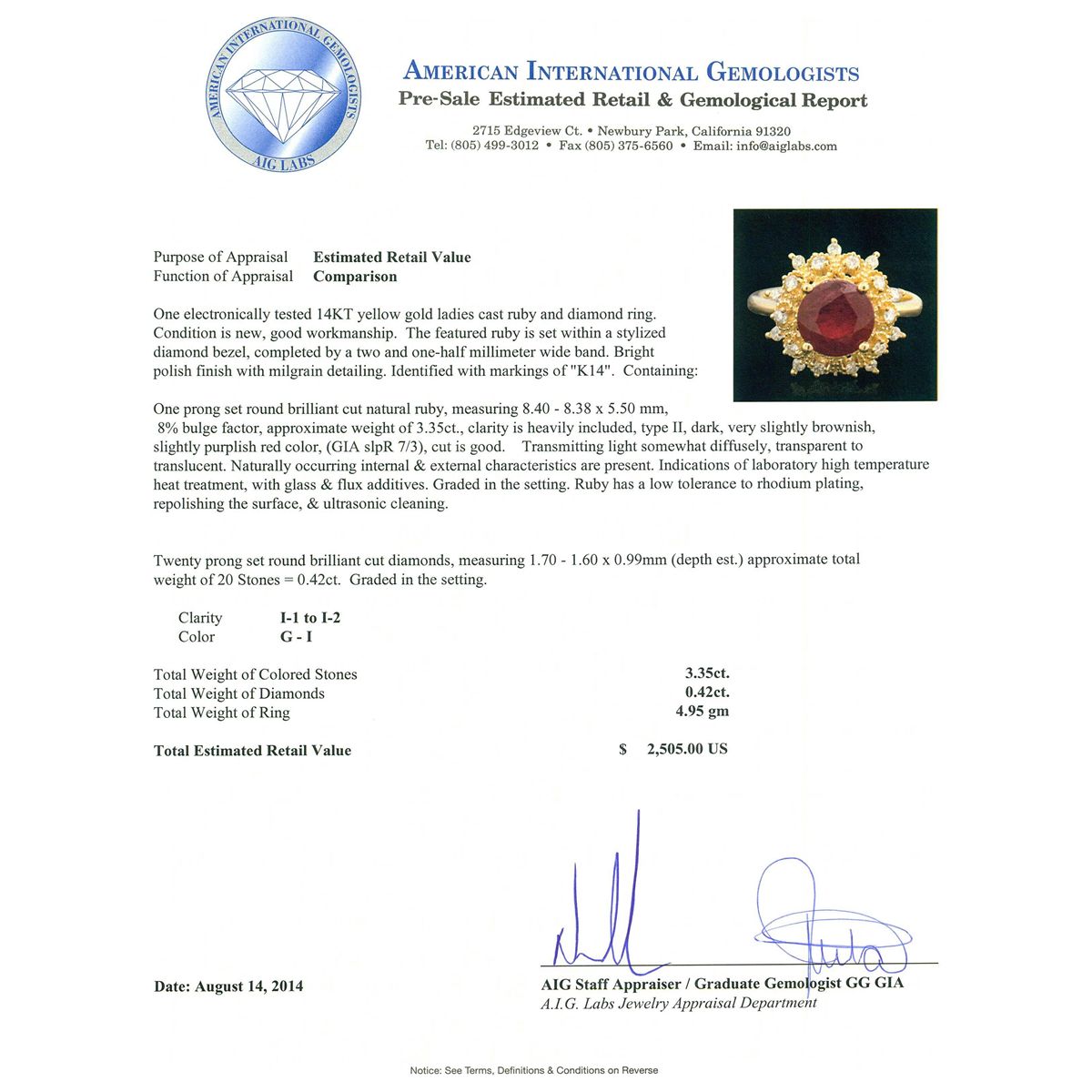 One electronically tested 14KT yellow gold ladies cast ruby and diamond ring. Condition is new, good workmanship. The featured ruby is set within a stylized diamond bezel, completed by a two and one-half millimeter wide band. Bright polish finish with milgrain detailing. Identified with markings of "K14". Containing: One prong set round brilliant cut natural ruby, measuring 8.40 - 8.38 x 5.50 mm, 8%. bulge factor, approximate weight of 3.35ct., clarity is heavily included, type II, dark, very slightly brownish, slightly purplish red color, (GIA slpR 7/3), cut is good. Transmitting light somewhat diffusely, transparent to translucent. Naturally occurring internal & external characteristics are present. Indications of laboratory high temperature heat treatment, with glass & flux additives. Graded in the setting. Ruby has a low tolerance to rhodium plating, repolishing the surface, & ultrasonic cleaning. Twenty prong set round brilliant cut diamonds, measuring 1.70 - 1.60 x 0.99mm (depth est.) approximate. Total Weight of 20 Stones = 0.42ct. Graded in the setting. Clarity: I-1 to I-2. Color: G - I. Total Weight of Colored Stones 3.35ct. Total Weight of Diamonds 0.42ct. Total Weight of Ring 4.95gm. AIG Appraised at $2,505.00.