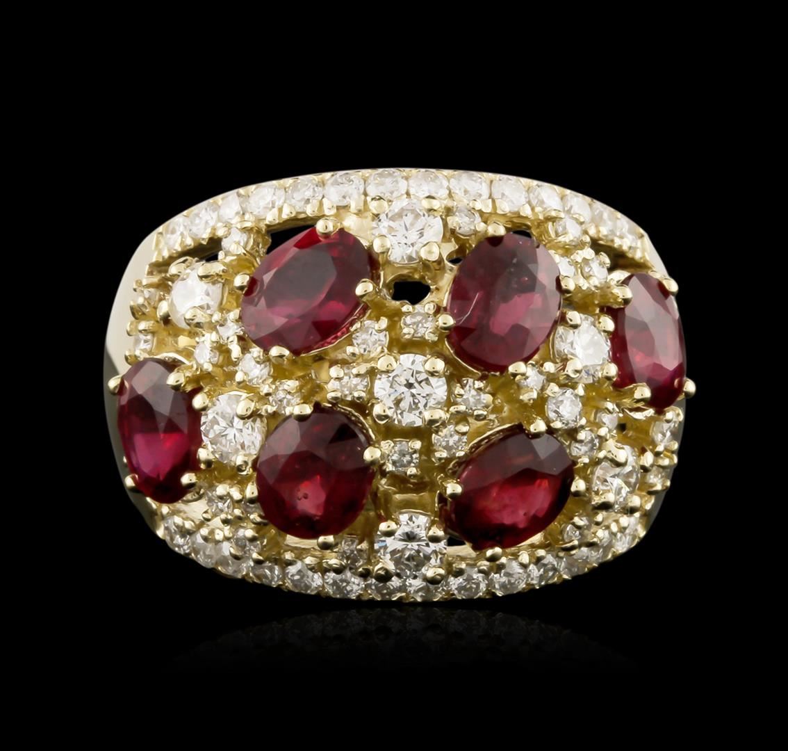 One electronically tested 14KT yellow gold ladies cast ruby and diamond ring with a bright polish finish. Identified with markings of "14K". Condition is new. Containing: Six prong set oval modified brilliant cut natural rubies, measuring 5.00 x 4.50 x 2.93mm, approximate total weight of 3.36ct., clarity is heavily included, medium, moderately strong, strongly purplish red color, (GIA stpR 5/4), cut is good. Sixty-Four prong set round brilliant cut diamonds, measuring 2.20 - 1.20 x 1.02mm (depth est.) approximate total weight of 64 Stones = 0.50ct. Clarity: SI-2 to I-2. Color: K - L, Cut is Good. Colored gemstones are presumed to have been subjected to commonly used enhancement processes. All diamonds and colored gemstones are graded in the mounting, unless otherwise stated. Total Weight of Colored Stones 3.36ct. Total Weight of Diamonds 0.50ct. Total Weight of Ring 8.90 grams. GGL Appraised at $4,420.00.