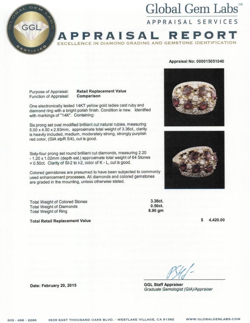 One electronically tested 14KT yellow gold ladies cast ruby and diamond ring with a bright polish finish. Identified with markings of "14K". Condition is new. Containing: Six prong set oval modified brilliant cut natural rubies, measuring 5.00 x 4.50 x 2.93mm, approximate total weight of 3.36ct., clarity is heavily included, medium, moderately strong, strongly purplish red color, (GIA stpR 5/4), cut is good. Sixty-Four prong set round brilliant cut diamonds, measuring 2.20 - 1.20 x 1.02mm (depth est.) approximate total weight of 64 Stones = 0.50ct. Clarity: SI-2 to I-2. Color: K - L, Cut is Good. Colored gemstones are presumed to have been subjected to commonly used enhancement processes. All diamonds and colored gemstones are graded in the mounting, unless otherwise stated. Total Weight of Colored Stones 3.36ct. Total Weight of Diamonds 0.50ct. Total Weight of Ring 8.90 grams. GGL Appraised at $4,420.00.