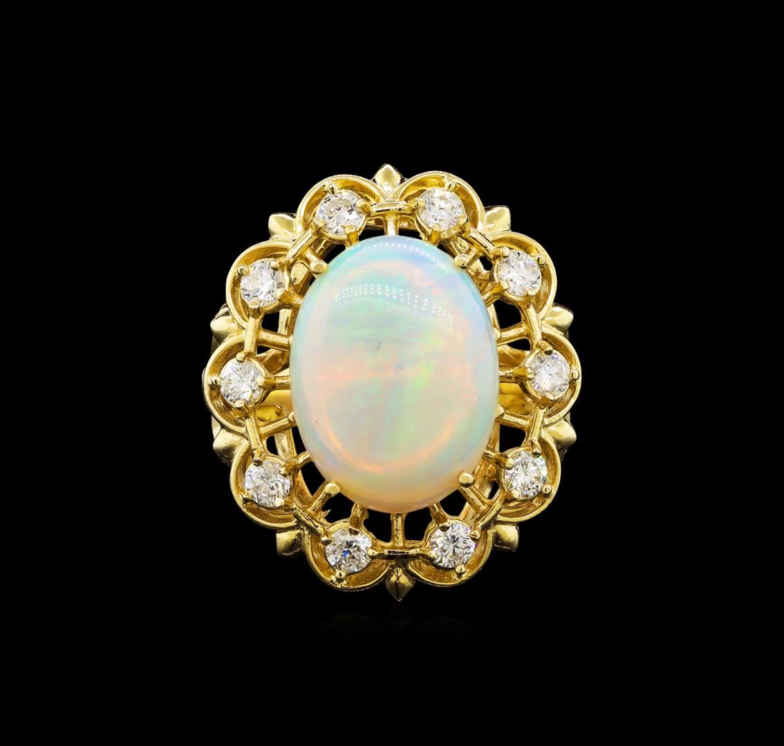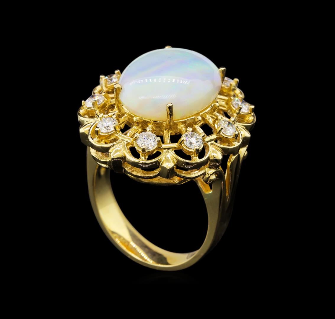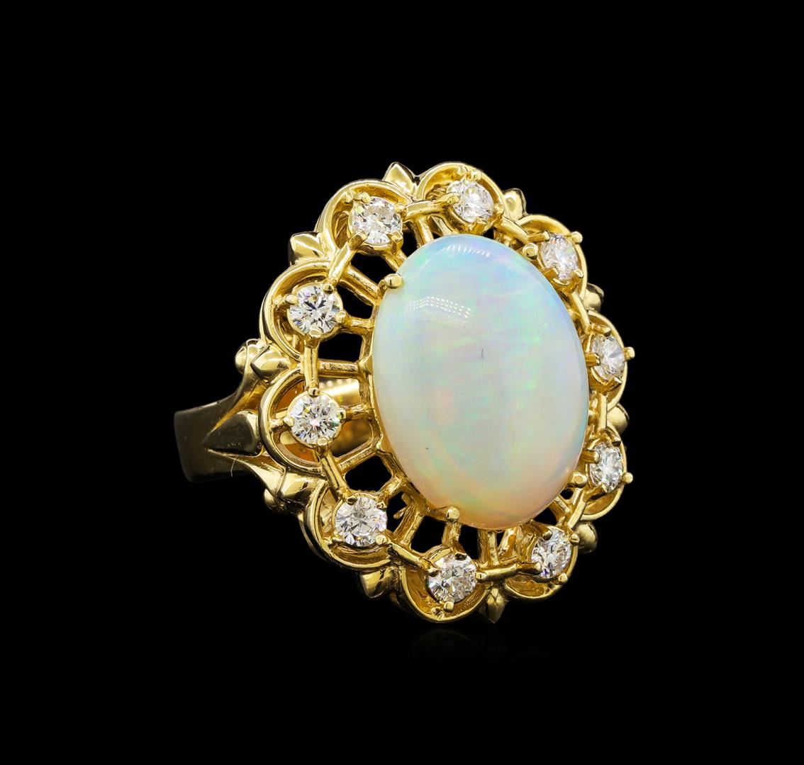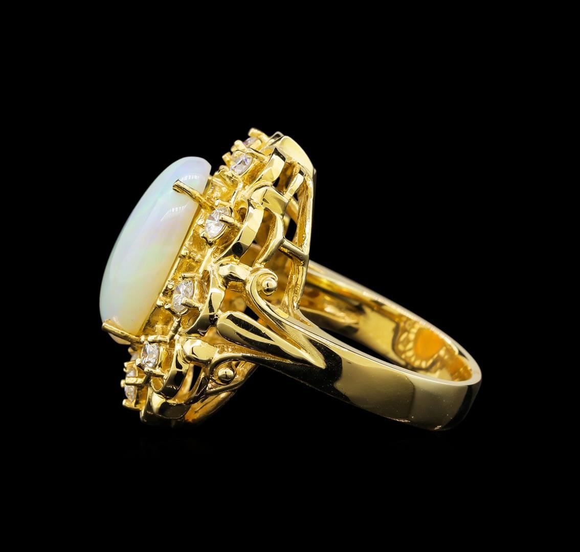 One electronically tested 14KT yellow gold ladies cast opal and diamond ring with a bright polish finish. Identified with markings of "14K". Condition is new. Containing: One white opal that is cut in a oval shape and is prong set, measuring 16.00. mm long x 12.00. mm wide, and 4.00. mm thick and the approximate weight is 3.37 carats. The opal has a somewhat bright, green-orange play of color (fire) in a flashfire pattern; a dome; a good cut; no inclusions; consistent in its brightness and pattern; and is somewhat directional. Ten prong set round brilliant cut diamonds, measuring 3.00. - 3.00. x 1.80mm (depth est.) approximate total weight of 10 Stones = 0.99ct. Clarity: SI-1 to I-1. Color: I - J, Cut is Good. Colored gemstones are presumed to have been subjected to commonly used enhancement processes. All diamonds and colored gemstones are graded in the mounting, unless otherwise stated. Total Weight of Diamonds 0.99ct. Total Weight of Opals 3.37ct. Total Weight of Ring 10.80 grams. GGL Appraised at $4,190.00.
