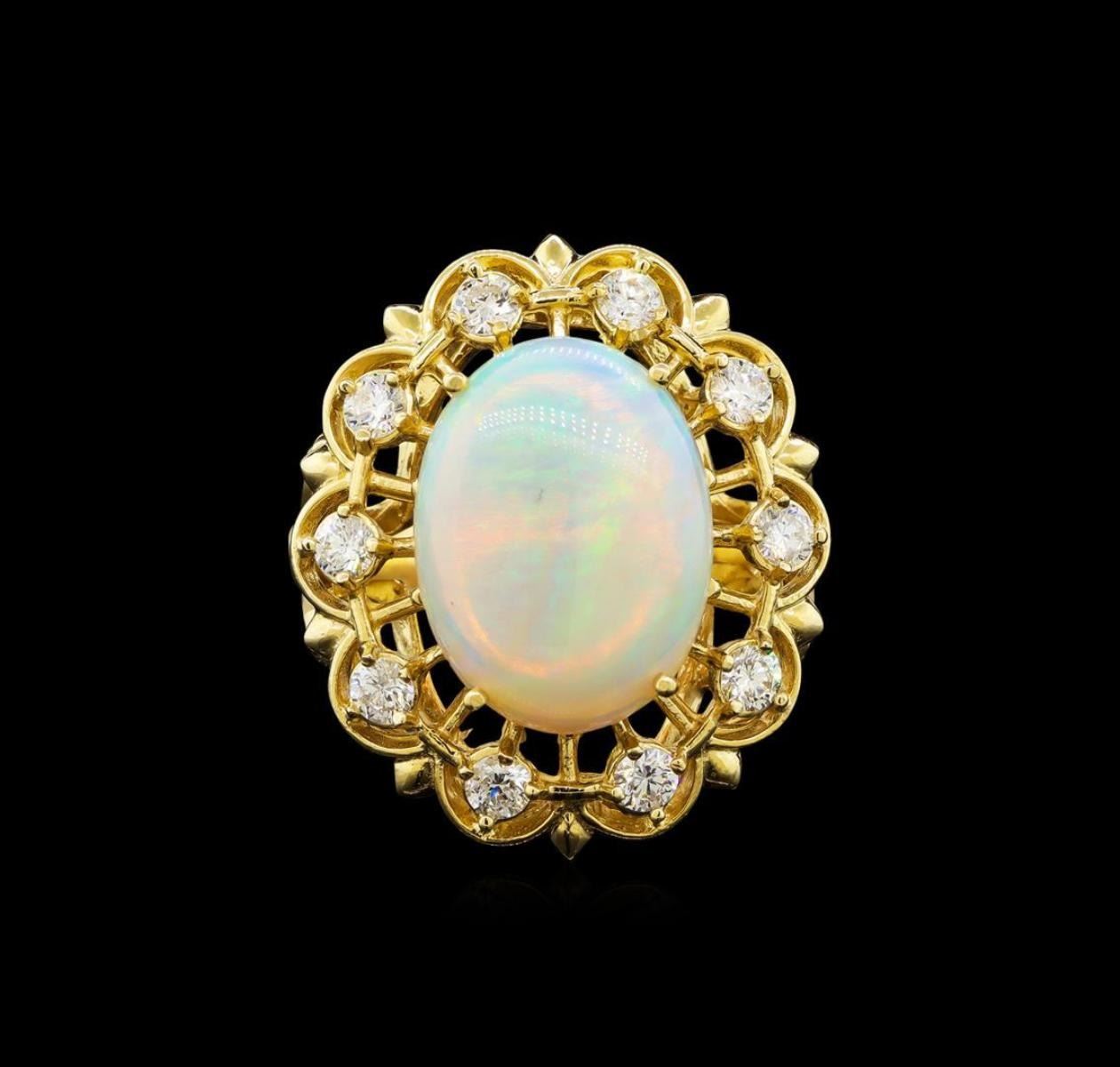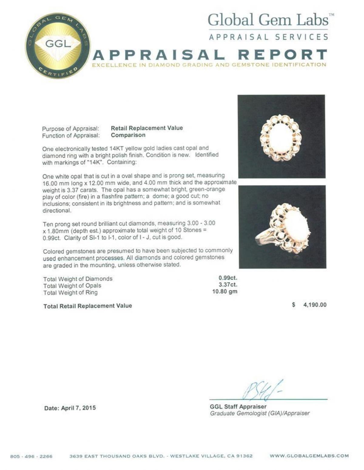 One electronically tested 14KT yellow gold ladies cast opal and diamond ring with a bright polish finish. Identified with markings of "14K". Condition is new. Containing: One white opal that is cut in a oval shape and is prong set, measuring 16.00. mm long x 12.00. mm wide, and 4.00. mm thick and the approximate weight is 3.37 carats. The opal has a somewhat bright, green-orange play of color (fire) in a flashfire pattern; a dome; a good cut; no inclusions; consistent in its brightness and pattern; and is somewhat directional. Ten prong set round brilliant cut diamonds, measuring 3.00. - 3.00. x 1.80mm (depth est.) approximate total weight of 10 Stones = 0.99ct. Clarity: SI-1 to I-1. Color: I - J, Cut is Good. Colored gemstones are presumed to have been subjected to commonly used enhancement processes. All diamonds and colored gemstones are graded in the mounting, unless otherwise stated. Total Weight of Diamonds 0.99ct. Total Weight of Opals 3.37ct. Total Weight of Ring 10.80 grams. GGL Appraised.