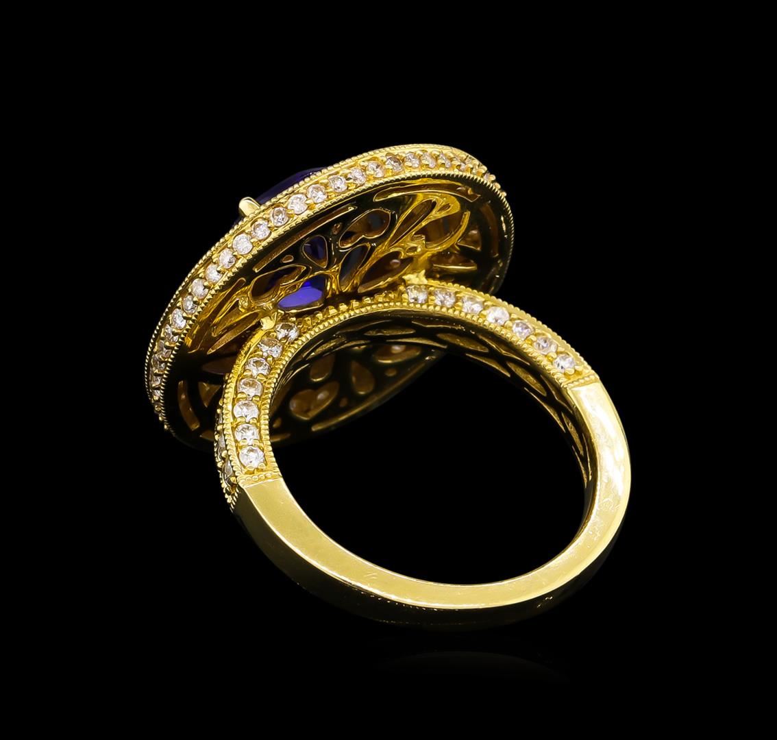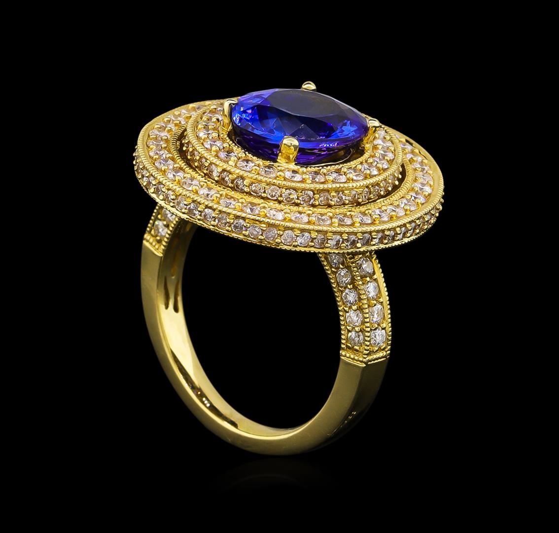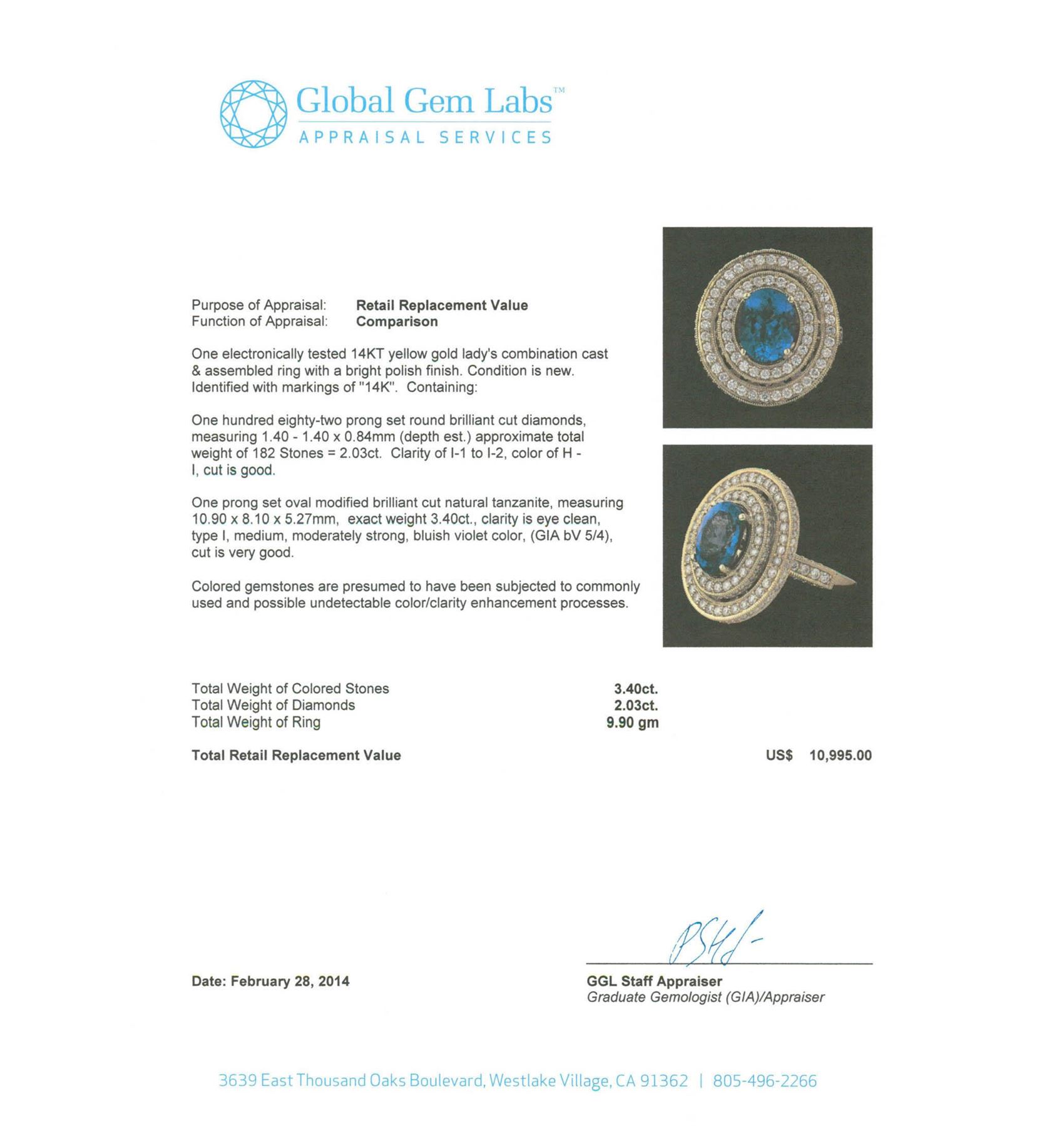 One electronically tested 14KT yellow gold Ladies combination cast & assembled ring with a bright polish finish. Condition is new. Identified with markings of "14K". Containing: One Hundred Eighty-Two prong set round brilliant cut diamonds, measuring 1.40 - 1.40 x 0.84mm (depth est.) approximate. Total Weight of 182 Stones = 2.03ct. Clarity: I-1 to I-2. Color: H - I, Cut is Good. One prong set oval modified brilliant cut natural tanzanite, measuring 10.90 x 8.10 x 5.27mm, exact weight 3.40 ct., clarity is eye clean, type I, medium, moderately strong, bluish violet color, (GIA bV 5/4), cut is very good. Colored gemstones are presumed to have been subjected to commonly used and possible undetectable color/clarity enhancement processes. Total Weight of Colored Stones 3.40 ct. Total Weight of Diamonds 2.03ct. Total Weight of Ring 9.90 grams. GGL Appraised.