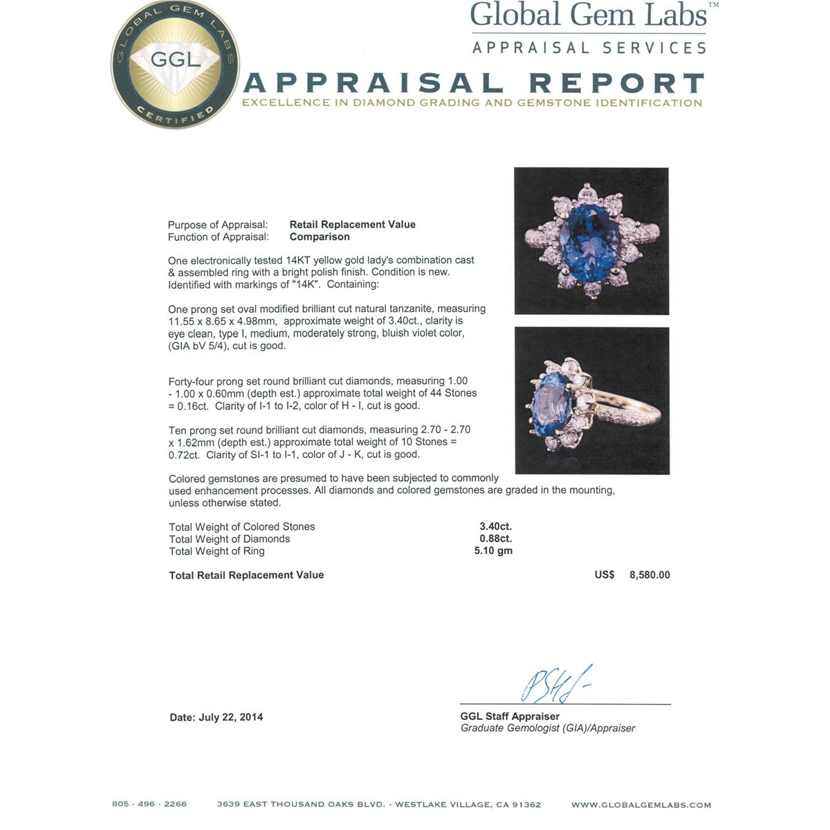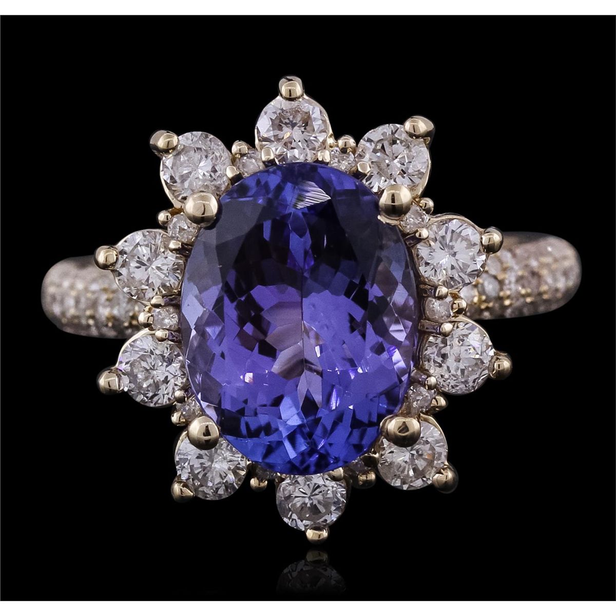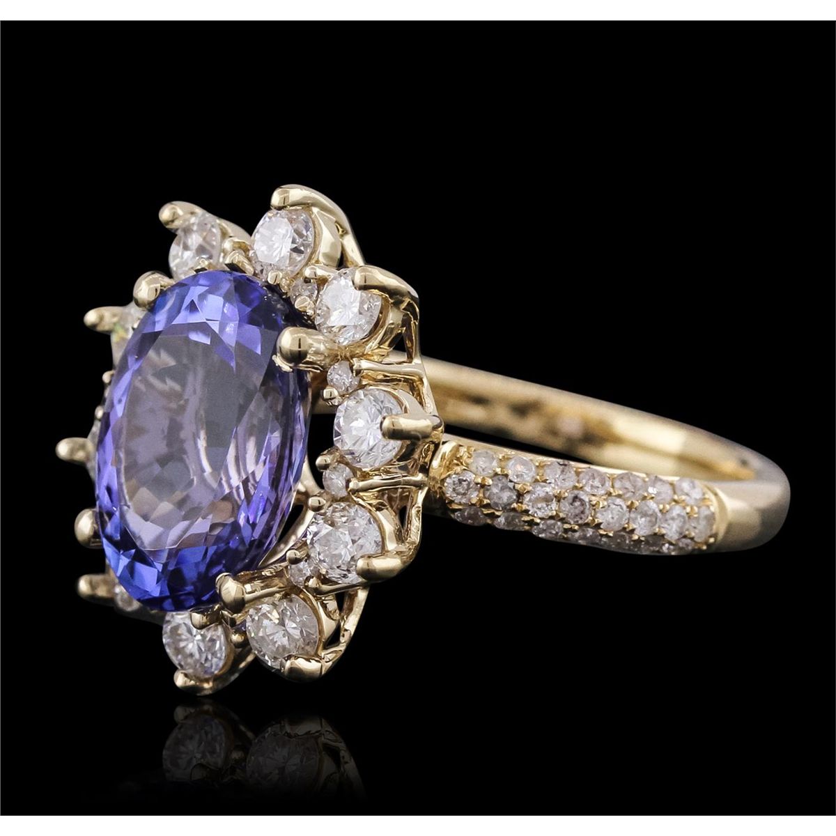 One electronically tested 14KT yellow gold ladies combination cast & assembled ring with a bright polish finish. Condition is new. Identified with markings of "14K". Containing: One prong set oval modified brilliant cut natural tanzanite, measuring 11.55 x 8.65 x 4.98mm, approximate weight of 3.40ct., clarity is eye clean, type I, medium, moderately strong, bluish violet color, (GIA bV 5/4), cut is good. Forty-Four prong set round brilliant cut diamonds, measuring 1.00 - 1.00 x 0.60mm (depth est.) approximate total weight of 44 Stones = 0.16ct. Clarity: I-1 to I-2. Color: H - I, Cut is Good. Ten prong set round brilliant cut diamonds, measuring 2.70 - 2.70 x 1.62mm (depth est.) approximate total weight of 10 Stones = 0.72ct. Clarity: SI-1 to I-1. Color: J - K, Cut is Good. Colored gemstones are presumed to have been subjected to commonly used enhancement processes. All diamonds and colored gemstones are graded in the mounting, unless otherwise stated. Total Weight of Colored Stones 3.40ct. Total Weight of Diamonds 0.88ct. Total Weight of Ring 5.10 grams. GGL Appraised at $8,580.00.
