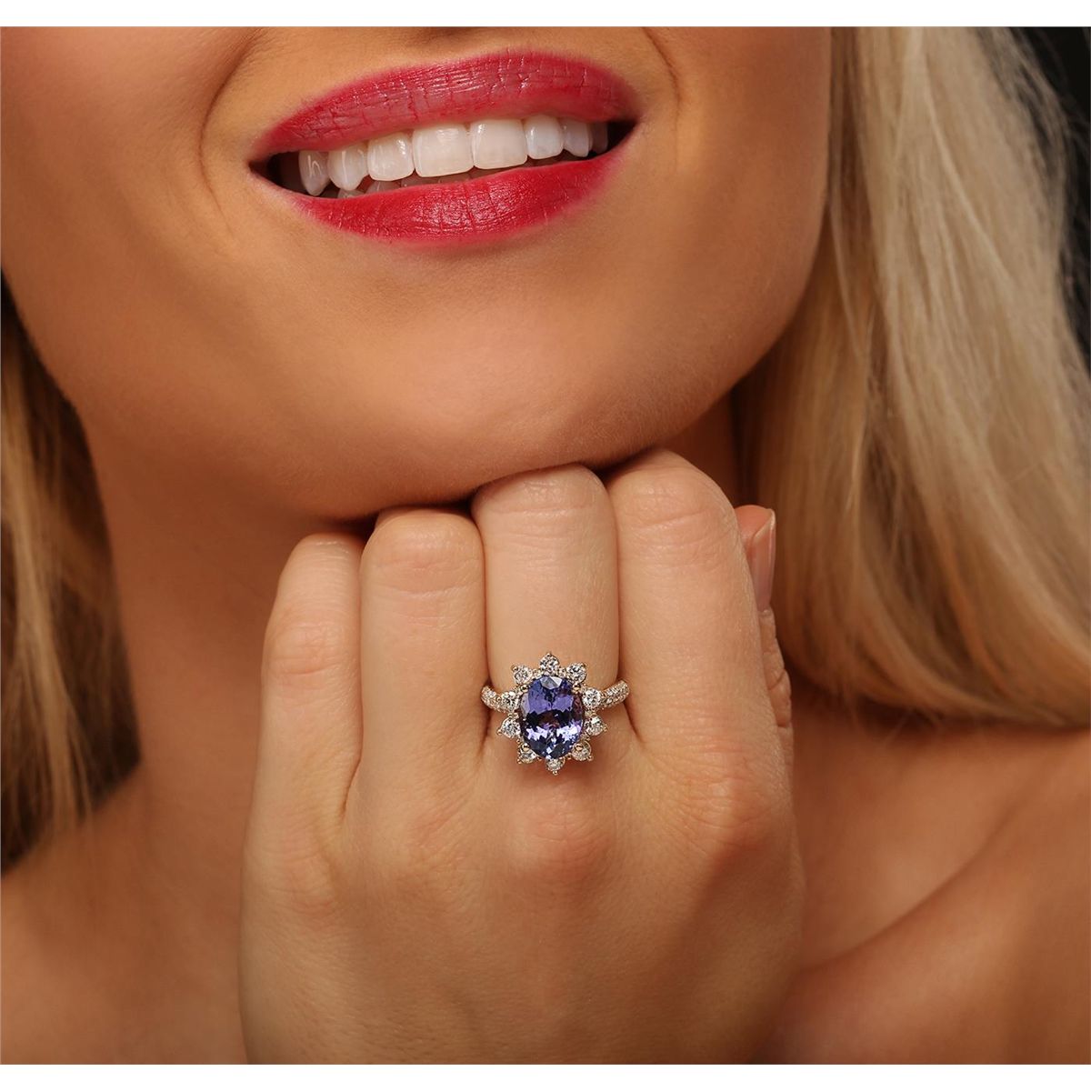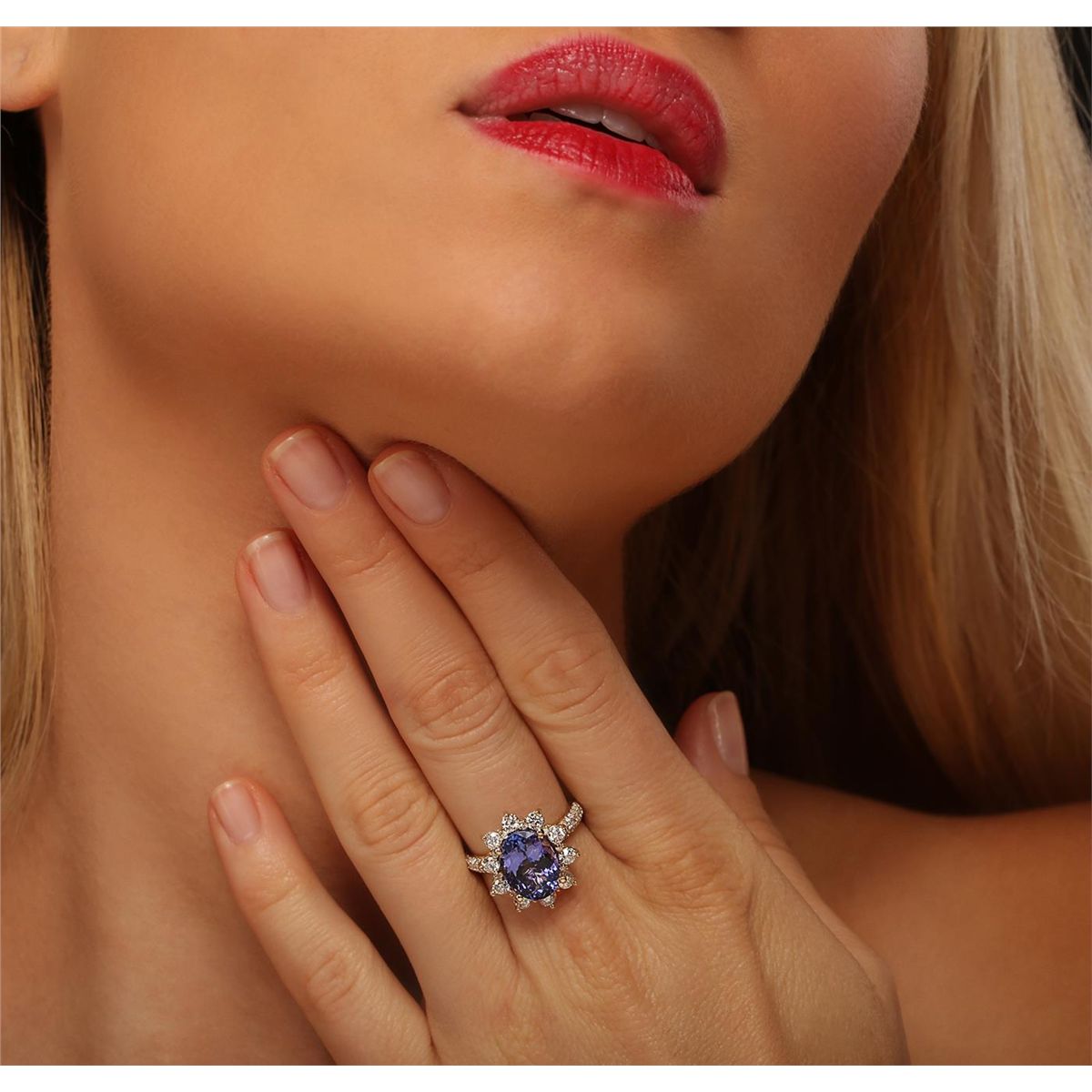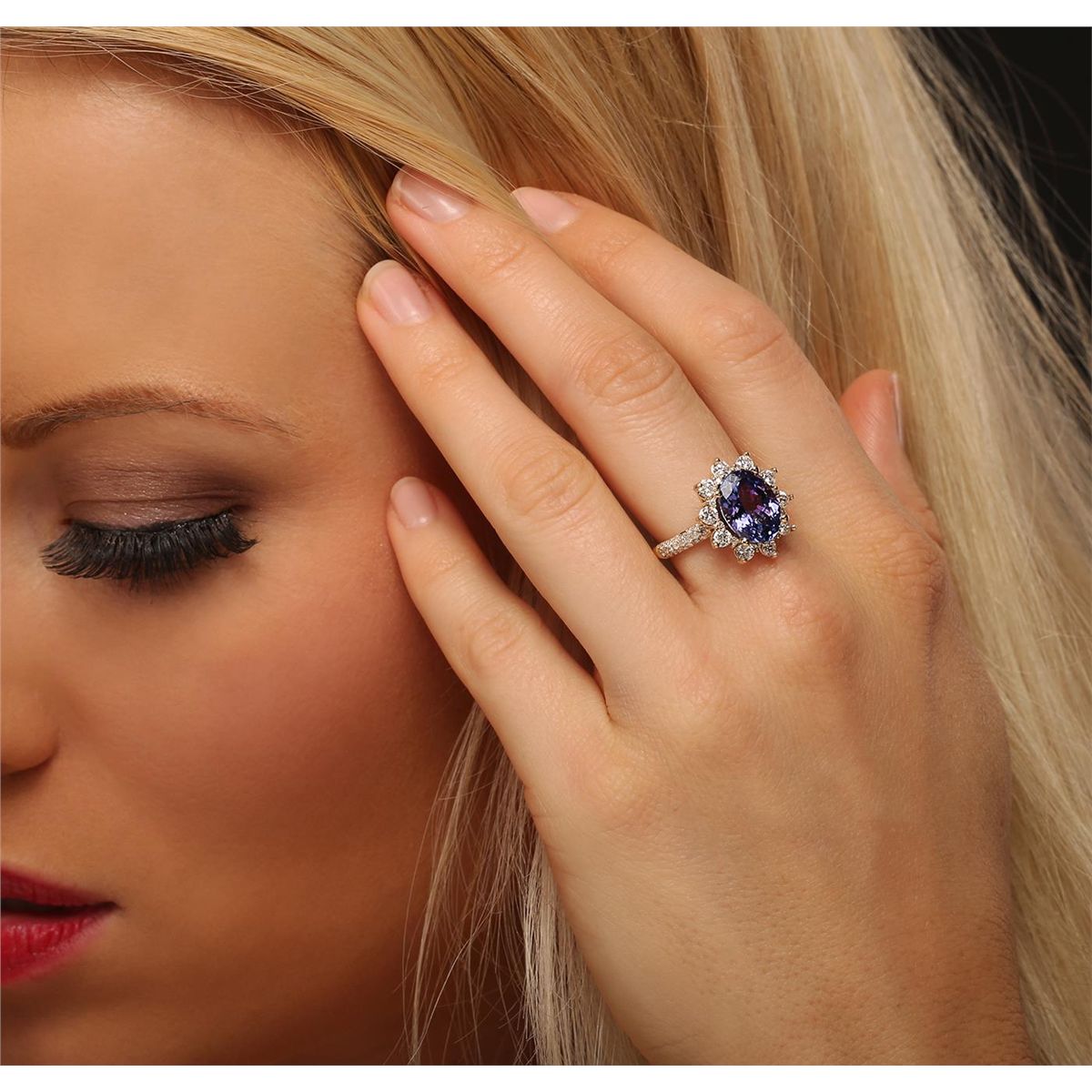 One electronically tested 14KT yellow gold ladies combination cast & assembled ring with a bright polish finish. Condition is new. Identified with markings of "14K". Containing: One prong set oval modified brilliant cut natural tanzanite, measuring 11.55 x 8.65 x 4.98mm, approximate weight of 3.40ct., clarity is eye clean, type I, medium, moderately strong, bluish violet color, (GIA bV 5/4), cut is good. Forty-Four prong set round brilliant cut diamonds, measuring 1.00 - 1.00 x 0.60mm (depth est.) approximate total weight of 44 Stones = 0.16ct. Clarity: I-1 to I-2. Color: H - I, Cut is Good. Ten prong set round brilliant cut diamonds, measuring 2.70 - 2.70 x 1.62mm (depth est.) approximate total weight of 10 Stones = 0.72ct. Clarity: SI-1 to I-1. Color: J - K, Cut is Good. Colored gemstones are presumed to have been subjected to commonly used enhancement processes. All diamonds and colored gemstones are graded in the mounting, unless otherwise stated. Total Weight of Colored Stones 3.40ct. Total Weight of Diamonds 0.88ct. Total Weight of Ring 5.10 grams. GGL Appraised at $8,580.00.