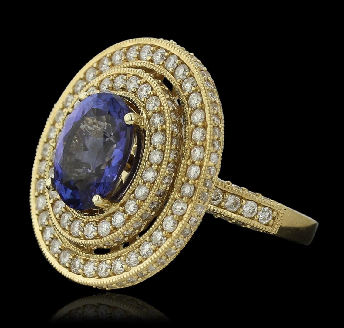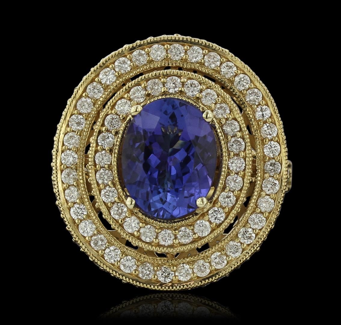 One electronically tested 14KT yellow gold Ladies combination cast & assembled ring with a bright polish finish. Condition is new. Identified with markings of "14K". Containing: One Hundred Eighty-Two prong set round brilliant cut diamonds, measuring 1.40 - 1.40 x 0.84mm (depth est.) approximate. Total Weight of 182 Stones = 2.03ct. Clarity: I-1 to I-2. Color: H - I, Cut is Good. One prong set oval modified brilliant cut natural tanzanite, measuring 10.90 x 8.10 x 5.27mm, exact weight 3.40ct., clarity is eye clean, type I, medium, moderately strong, bluish violet color, (GIA bV 5/4), cut is very good. Colored gemstones are presumed to have been subjected to commonly used and possible undetectable color/clarity enhancement processes. Total Weight of Colored Stones 3.40ct. Total Weight of Diamonds 2.03ct. Total Weight of Ring 9.90 grams. GGL Appraised at $10,995.00.