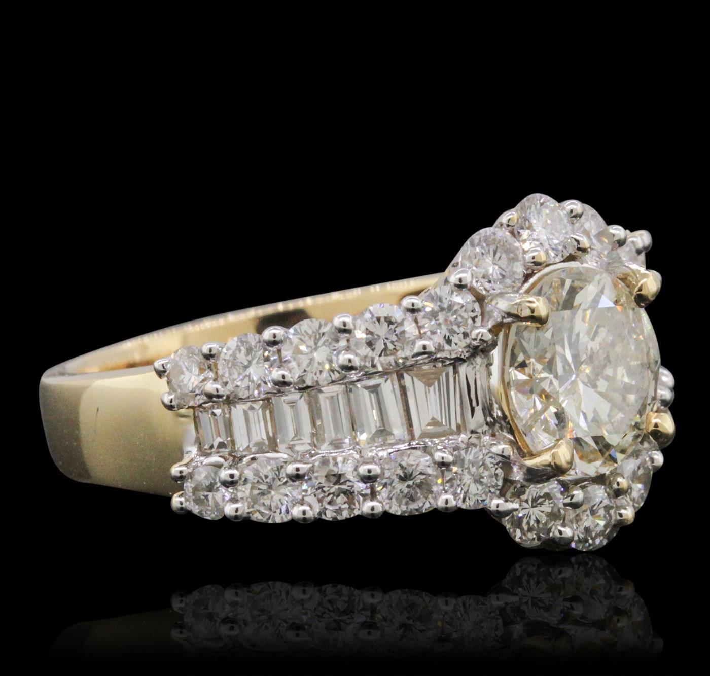 One electronically tested 14KT yellow gold ladies combination cast & assembled engagement ring with a flat shank with a bright polish finish. Identified with markings of "14K". Condition is new. Containing: One prong set round brilliant cut diamond, measuring 7.66 - 7.58 x 4.65mm (depth est.) approximate weight of 1.65ct. Clarity: I-2. Color: L, Cut is Good. Twenty-Six prong set round brilliant cut diamonds, measuring 2.40 - 2.20 x 1.38mm (depth est.) approximate total weight of 26 Stones = 1.16ct. Clarity: SI-1 to I-1. Color: I, Cut is Good. Twelve channel set baguette cut diamonds, measuring from 2.00 x 1.30 x 1.11mm (depth est.) to 2.90 x 2.00 x 1.70mm (depth est.) approximate total weight of 12 Stones = 0.62ct. Clarity: VS-2. Color: J - K, Cut is Good. All diamonds are graded in the mounting, unless otherwise stated. Total Weight of Diamonds 3.43ct. Total Weight of Ring 6.20 grams. GGL Appraised at $18,110.00.