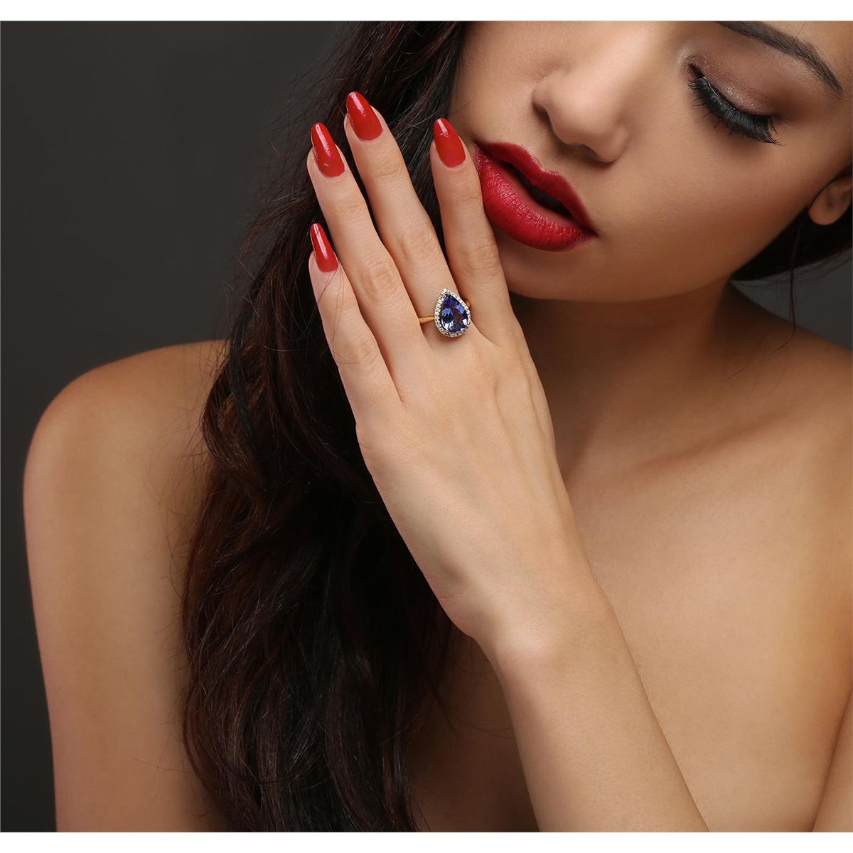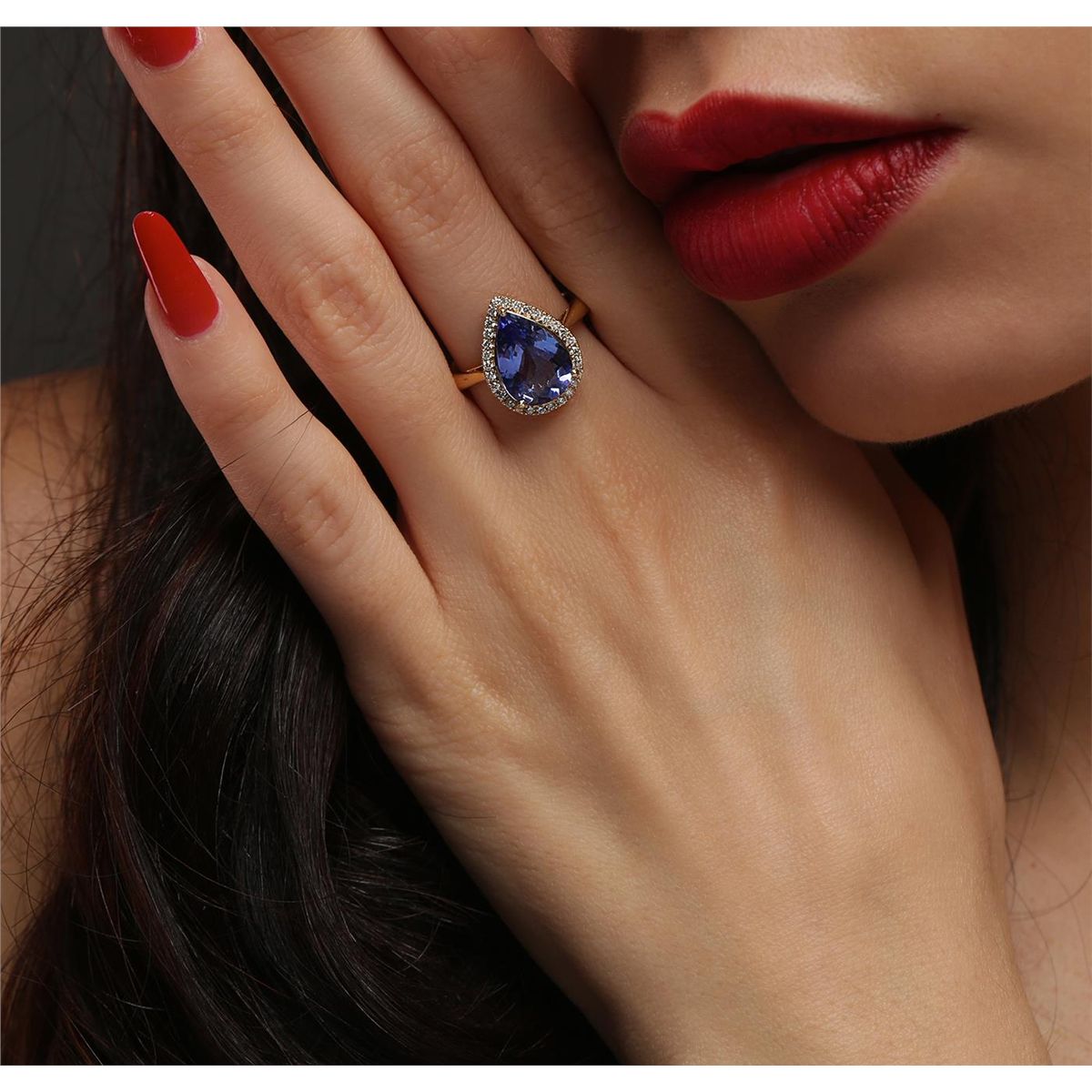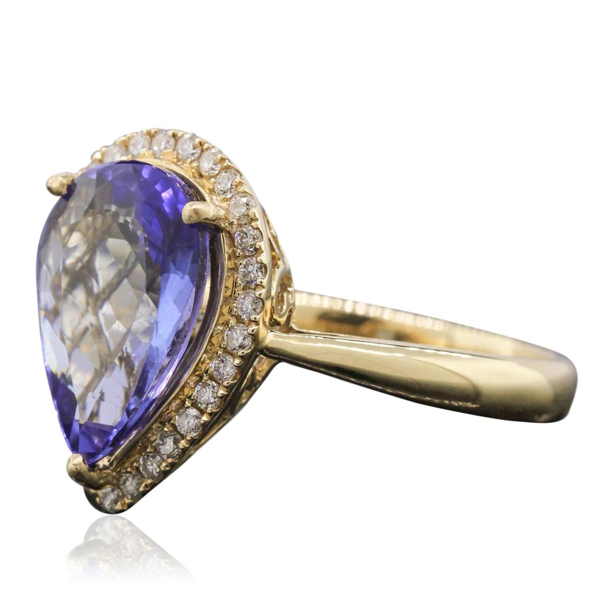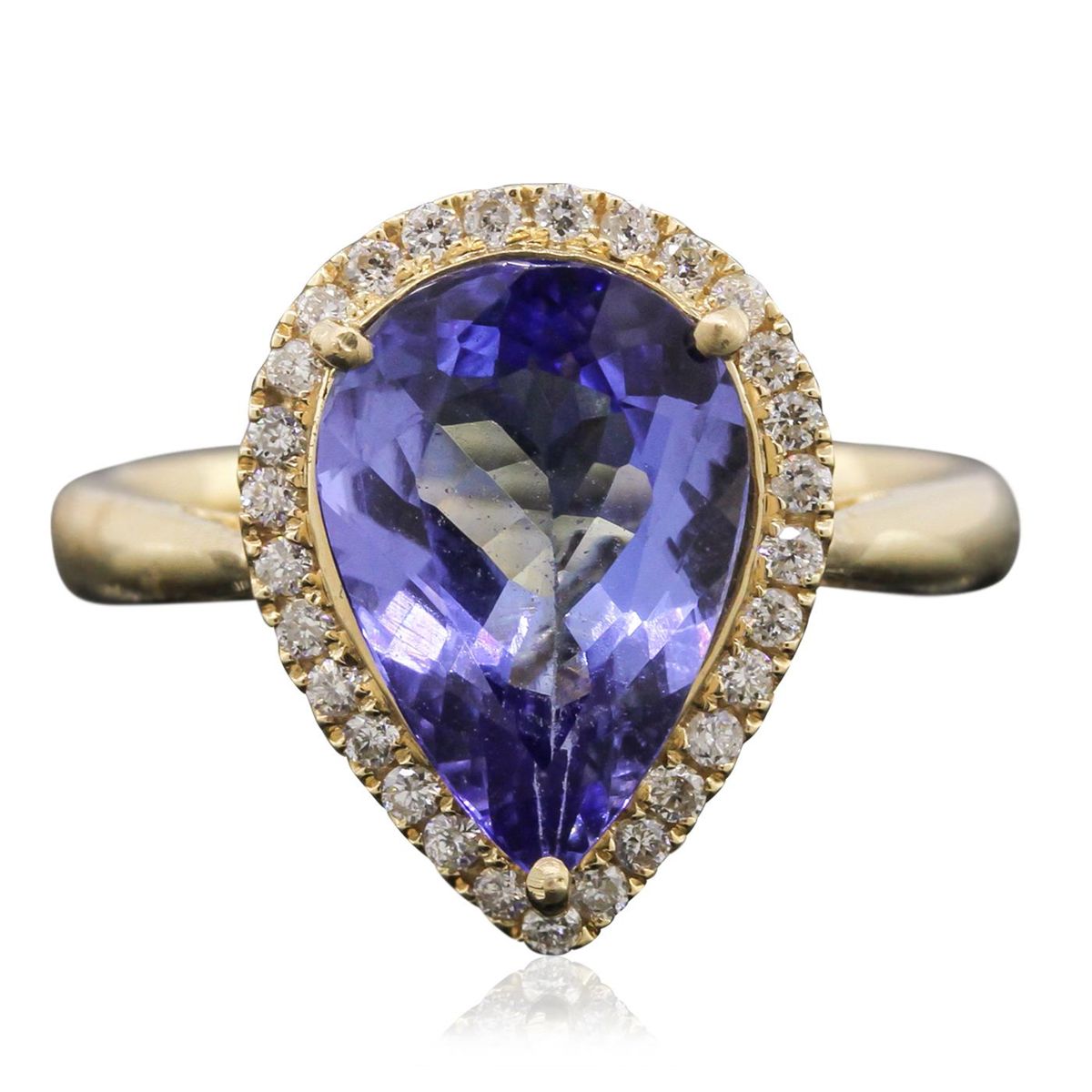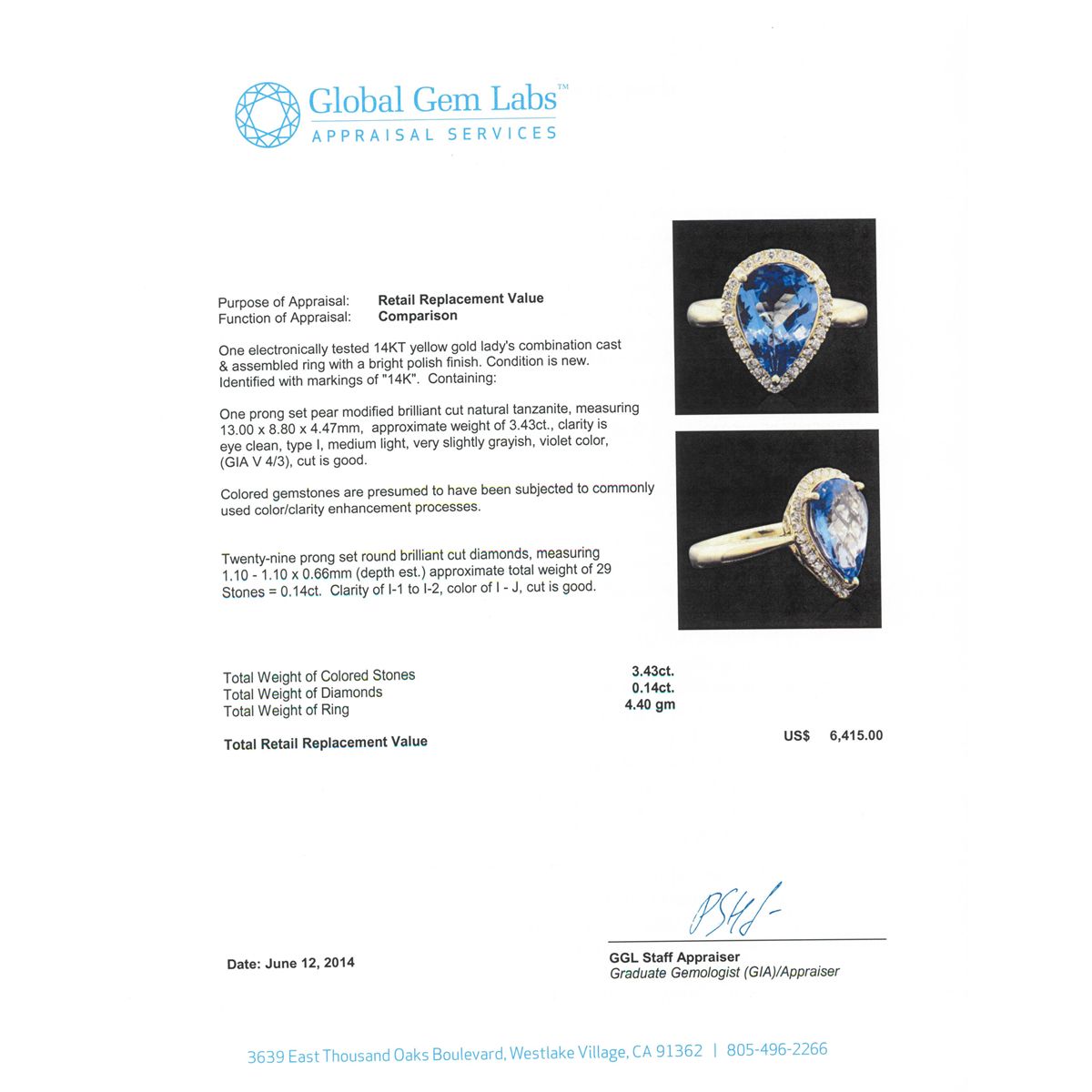 One electronically tested 14KT yellow gold Ladies combination cast & assembled ring with a bright polish finish. Condition is new. Identified with markings of "14K". Containing: One prong set pear modified brilliant cut natural tanzanite, measuring 13.00. x 8.80 x 4.47mm, approximate weight of 3.43ct., clarity is eye clean, type I, medium light, very slightly grayish, violet color, (GIA V 4/3), cut is good. Colored gemstones are presumed to have been subjected to commonly used color/clarity enhancement processes. Twenty-Nine prong set round brilliant cut diamonds, measuring 1.10 - 1.10 x 0.66mm (depth est.) approximate. Total Weight of 29 Stones = 0.14ct. . Clarity: I-1 to I-2. Color: I - J, Cut is Good. . Total Weight of Colored Stones 3.43ct. Total Weight of Diamonds 0.14ct. Total Weight of Ring 4.40 grams. GGL Appraised at $6,415.00.
