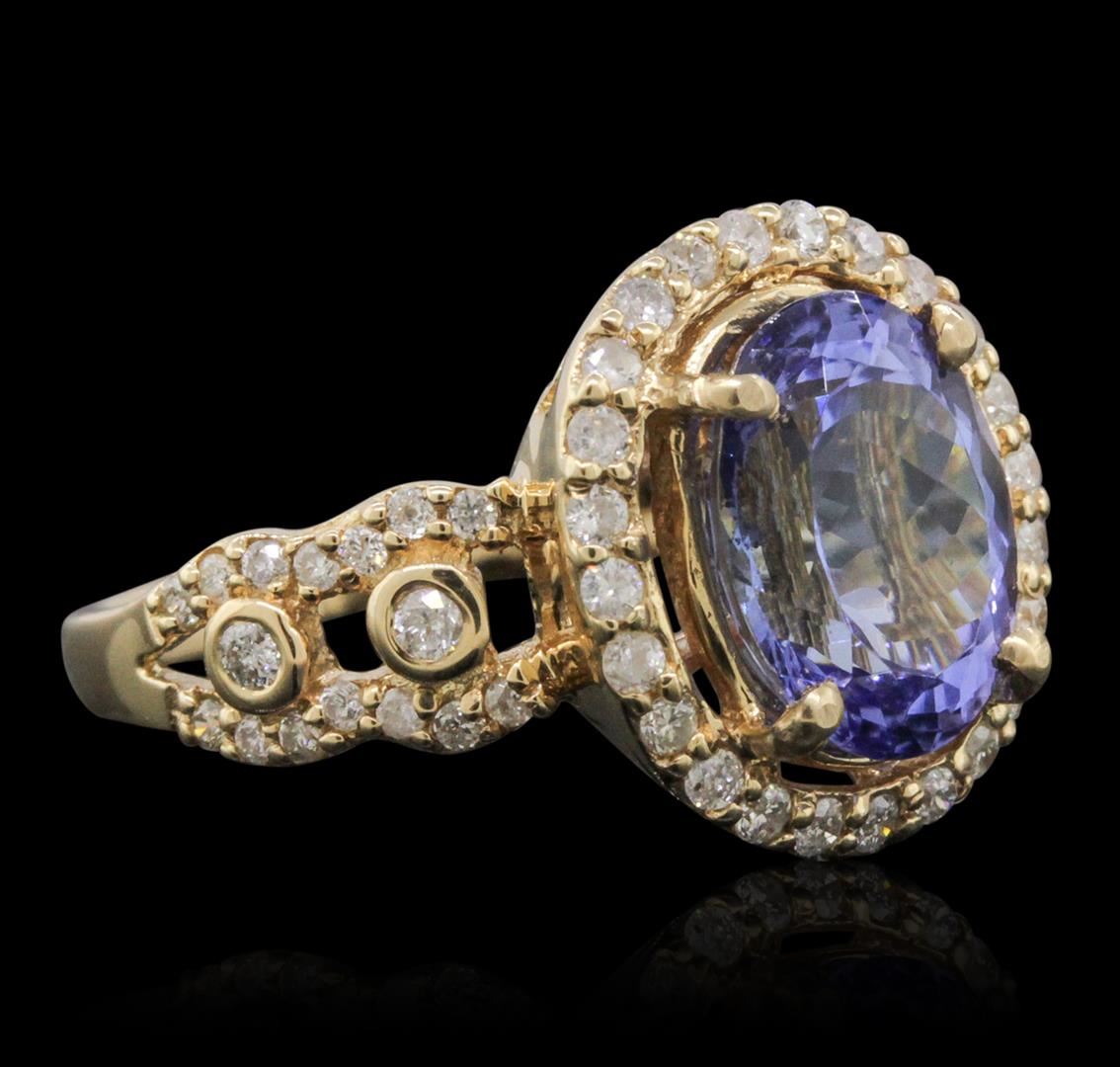 One electronically tested 14KT yellow gold ladies combination cast & assembled tanzanite and diamond ring with a split shank with a bright polish finish. Identified with markings of "14K". Condition is new. Containing: One prong set oval modified brilliant cut natural tanzanite, measuring 10.80 x 8.51 x 5.49mm, approximate weight of 3.43ct., clarity is eye clean, type I, medium, moderately strong, violet color, (GIA V 5/4), cut is good. Four bezel set round brilliant cut diamonds, measuring 1.40 - 1.40 x 0.84mm (depth est.) approximate total weight of 4 Stones = 0.04ct. Clarity: I-1 to I-2. Color: J - K, Cut is Good. Fifty-Two prong set round brilliant cut diamonds, measuring 1.10 - 1.10 x 0.66mm (depth est.) approximate total weight of 52 Stones = 0.25ct. Clarity: I-1 to I-2. Color: J - K, Cut is Good. Colored gemstones are presumed to have been subjected to commonly used enhancement processes. All diamonds and colored gemstones are graded in the mounting, unless otherwise stated. Total Weight of Colored Stones 3.43ct. Total Weight of Diamonds 0.29ct. Total Weight of Ring 5.80 grams. GGL Appraised at $7,305.00.
