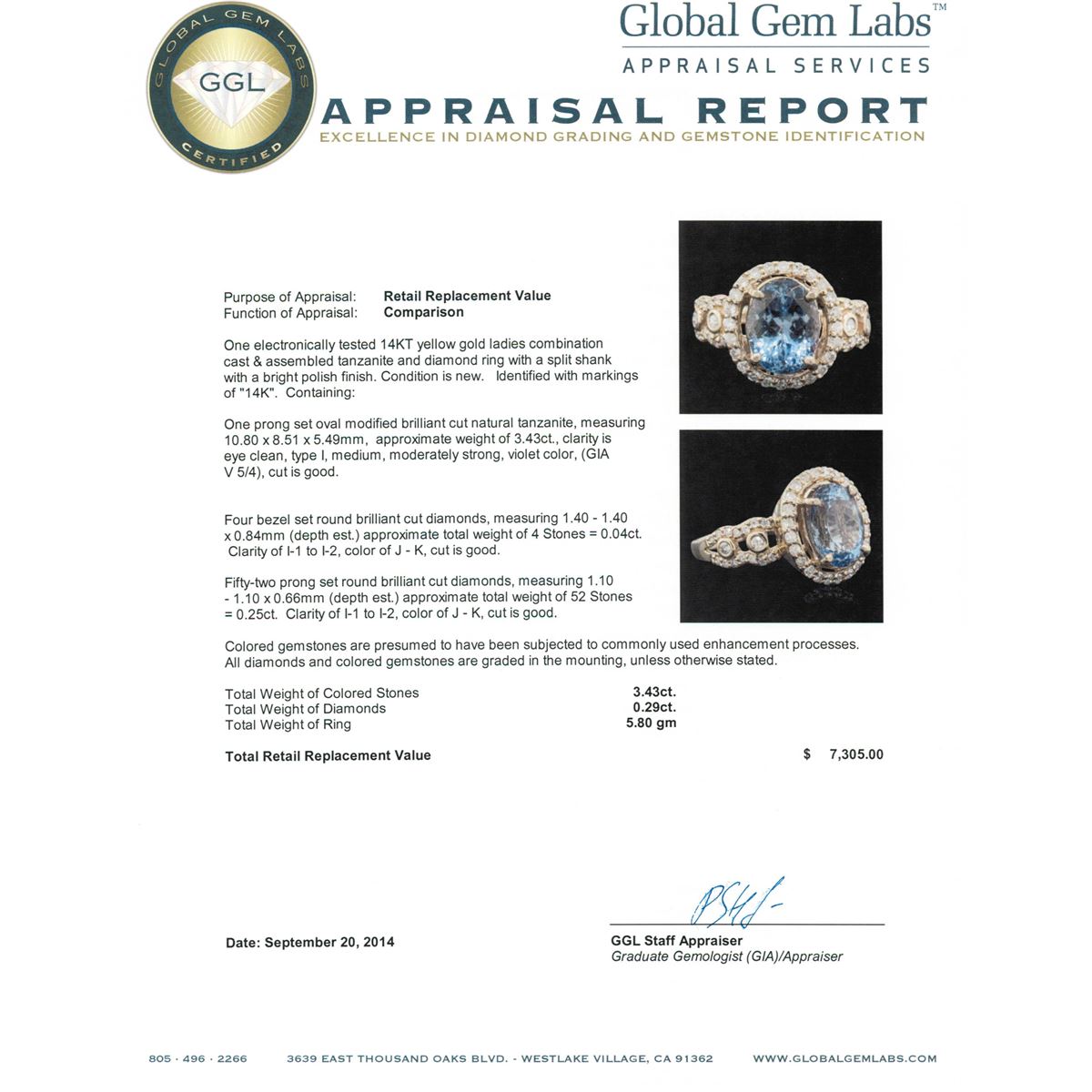 One electronically tested 14KT yellow gold ladies combination cast & assembled tanzanite and diamond ring with a split shank with a bright polish finish. Identified with markings of "14K". Condition is new. Containing: One prong set oval modified brilliant cut natural tanzanite, measuring 10.80 x 8.51 x 5.49mm, approximate weight of 3.43ct., clarity is eye clean, type I, medium, moderately strong, violet color, (GIA V 5/4), cut is good. Four bezel set round brilliant cut diamonds, measuring 1.40 - 1.40 x 0.84mm (depth est.) approximate total weight of 4 Stones = 0.04ct. Clarity: I-1 to I-2. Color: J - K, Cut is Good. Fifty-Two prong set round brilliant cut diamonds, measuring 1.10 - 1.10 x 0.66mm (depth est.) approximate total weight of 52 Stones = 0.25ct. Clarity: I-1 to I-2. Color: J - K, Cut is Good. Colored gemstones are presumed to have been subjected to commonly used enhancement processes. All diamonds and colored gemstones are graded in the mounting, unless otherwise stated. Total Weight of Colored Stones 3.43ct. Total Weight of Diamonds 0.29ct. Total Weight of Ring 5.80 grams. GGL Appraised at $7,305.00.