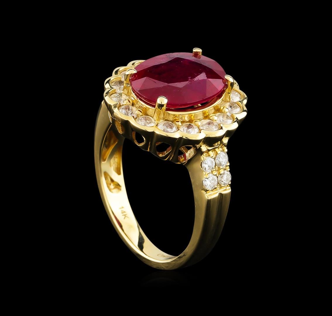 One electronically tested 14KT yellow gold ladies combination cast & assembled ruby and diamond ring with a flat shank with a bright polish finish. Identified with markings of "14K". Condition is new. Containing: One prong set oval modified brilliant cut natural ruby, measuring 11.88 x 9.27 x 3.80mm, approximate weight of 3.44ct., clarity is heavily included, type II, medium, moderately strong, strongly purplish red color, (GIA stpR 5/4), cut is good. Twenty-Four prong set round brilliant cut diamonds, measuring 2.00 - 1.50 x 1.05mm (depth est.) approximate total weight of 24 Stones = 0.47ct. Clarity: I-1 to I-2. Color: I - J, Cut is Good. Colored gemstones are presumed to have been subjected to commonly used enhancement processes. All diamonds and colored gemstones are graded in the mounting, unless otherwise stated. Total Weight of Colored Stones 3.44ct. Total Weight of Diamonds 0.47ct. Total Weight of Ring 6.90 grams. GGL Appraised.