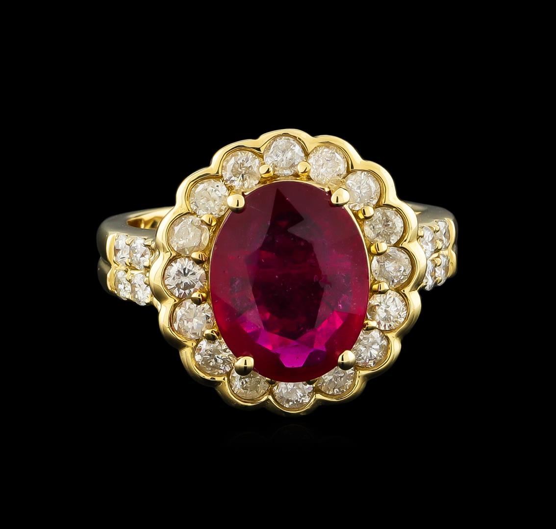 One electronically tested 14KT yellow gold ladies combination cast & assembled ruby and diamond ring with a flat shank with a bright polish finish. Identified with markings of "14K". Condition is new. Containing: One prong set oval modified brilliant cut natural ruby, measuring 11.88 x 9.27 x 3.80mm, approximate weight of 3.44ct., clarity is heavily included, type II, medium, moderately strong, strongly purplish red color, (GIA stpR 5/4), cut is good. Twenty-Four prong set round brilliant cut diamonds, measuring 2.00 - 1.50 x 1.05mm (depth est.) approximate total weight of 24 Stones = 0.47ct. Clarity: I-1 to I-2. Color: I - J, Cut is Good. Colored gemstones are presumed to have been subjected to commonly used enhancement processes. All diamonds and colored gemstones are graded in the mounting, unless otherwise stated. Total Weight of Colored Stones 3.44ct. Total Weight of Diamonds 0.47ct. Total Weight of Ring 6.90 grams. GGL Appraised.