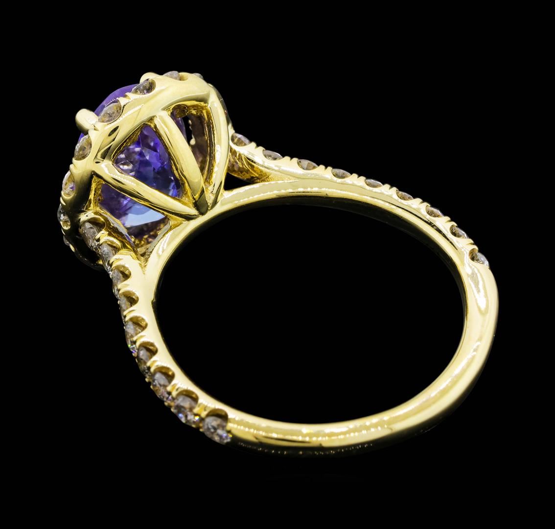 One electronically tested 14KT yellow gold lady's cast fashion ring with a basket halo with a bright polish finish. The featured lady's ring has a shank measuring 2.14 millimeters wide. Identified with markings of "14K". Condition is new, good workmanship. Containing: One prong set oval modified brilliant cut natural tanzanite, measuring 10.35 x 8.00 x 5.60mm, (depth est.) 8%. bulge factor, approximate weight of 3.50ct., clarity is eye clean, medium light, very slightly grayish, violet color, (GIA V 4/3), cut is good. Transmitting light with no distortion, transparent. Colored gemstones are presumed to have been subjected to commonly used enhancement processes. Graded in the setting. Thirty-Four prong set round brilliant cut diamonds, measuring 2.00 - 1.90 x 1.21mm (depth est.) approximate total weight of 34 Stones = 0.95ct. Graded in the setting. Color I - JClarity SI-2 to I-1 Cut Good. Total Weight of Colored Stones 3.50ct. Total Weight of Diamonds 0.95ct. Total Weight of Ring 5.00gm. GAS Appraised.